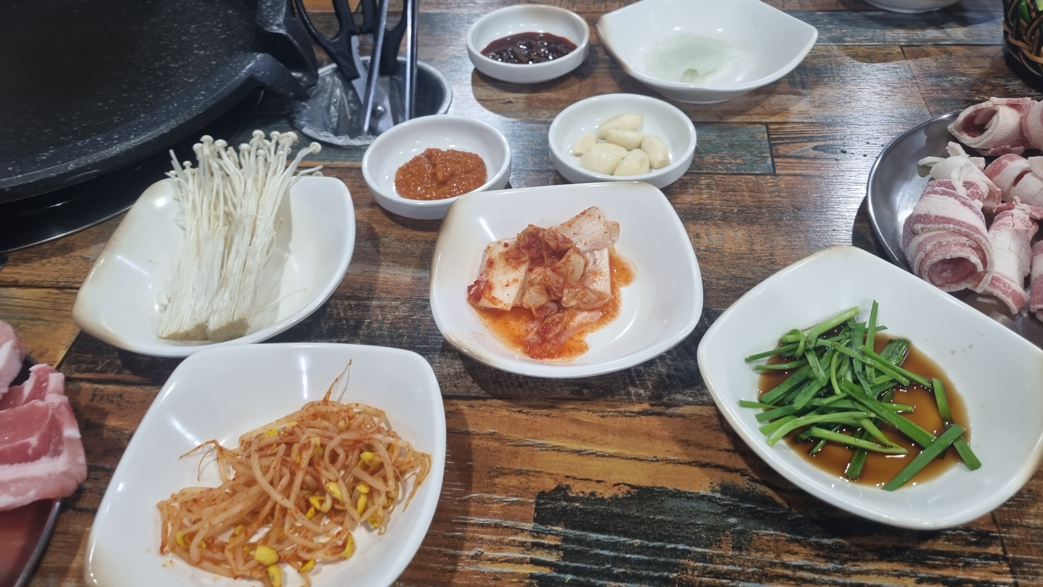 김치와 양파 쌈무,부추,팽이버섯도 일반 전문 삼겹살 집에서 있는 것 모두 있습니다.