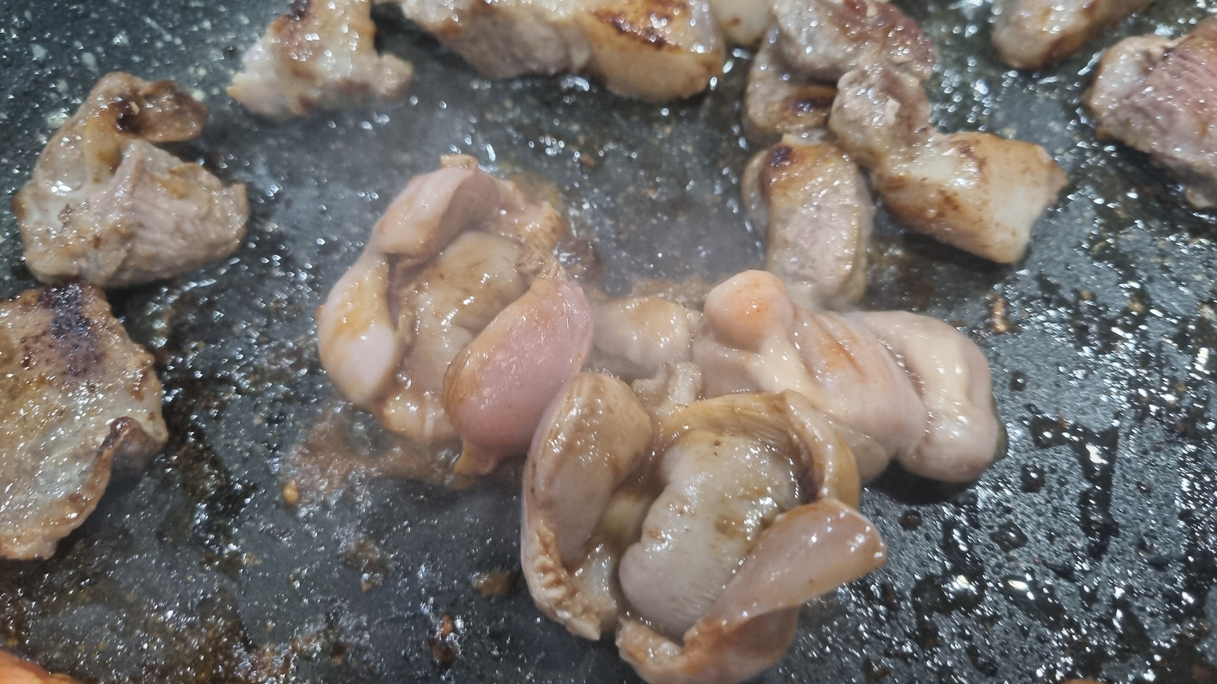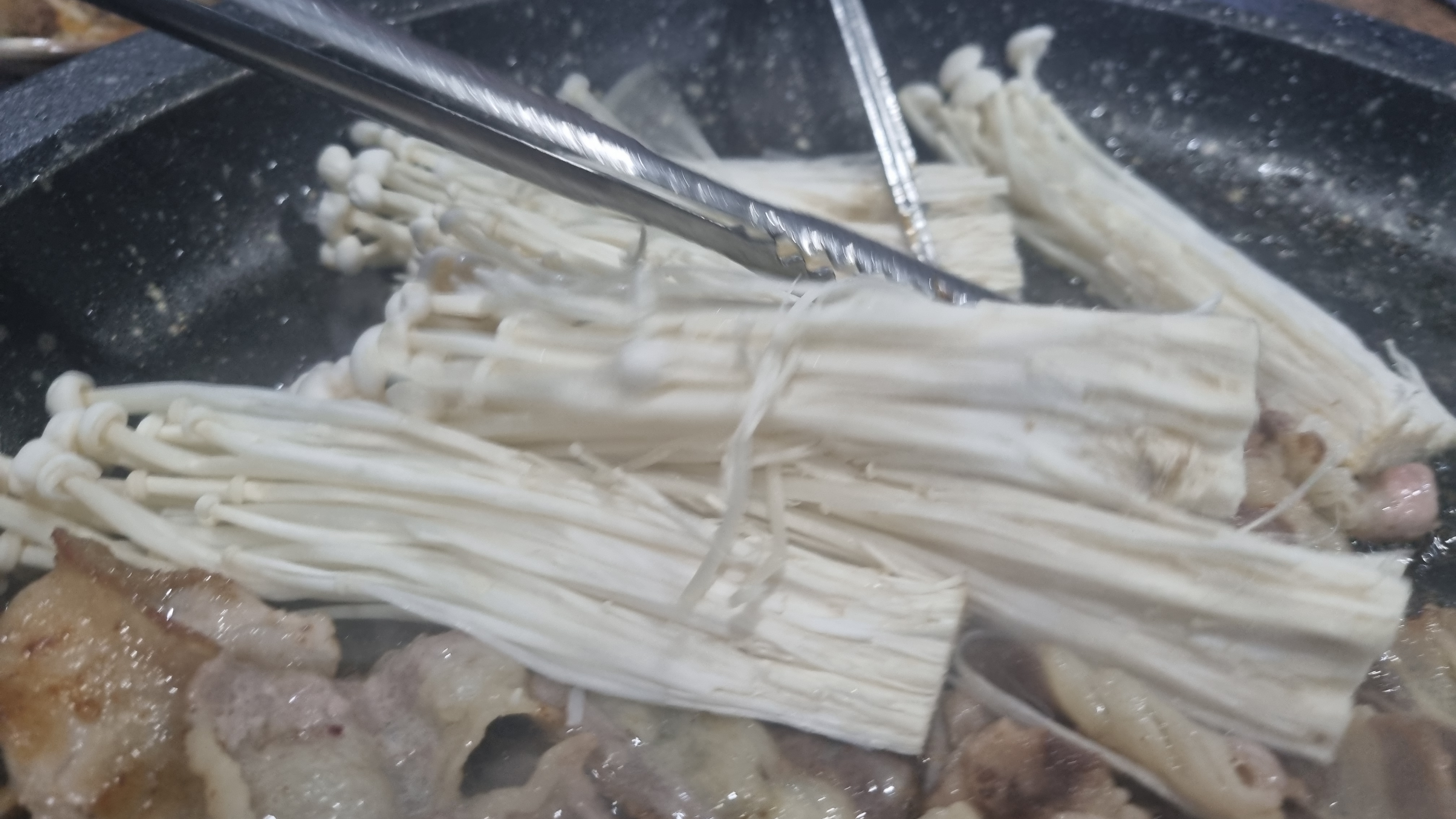 목살을 굽다가 대패삽겹살이 있어 이것도 구웠고 팽이버섯과 함께 구워 먹었는데 정말 맛있습니다.