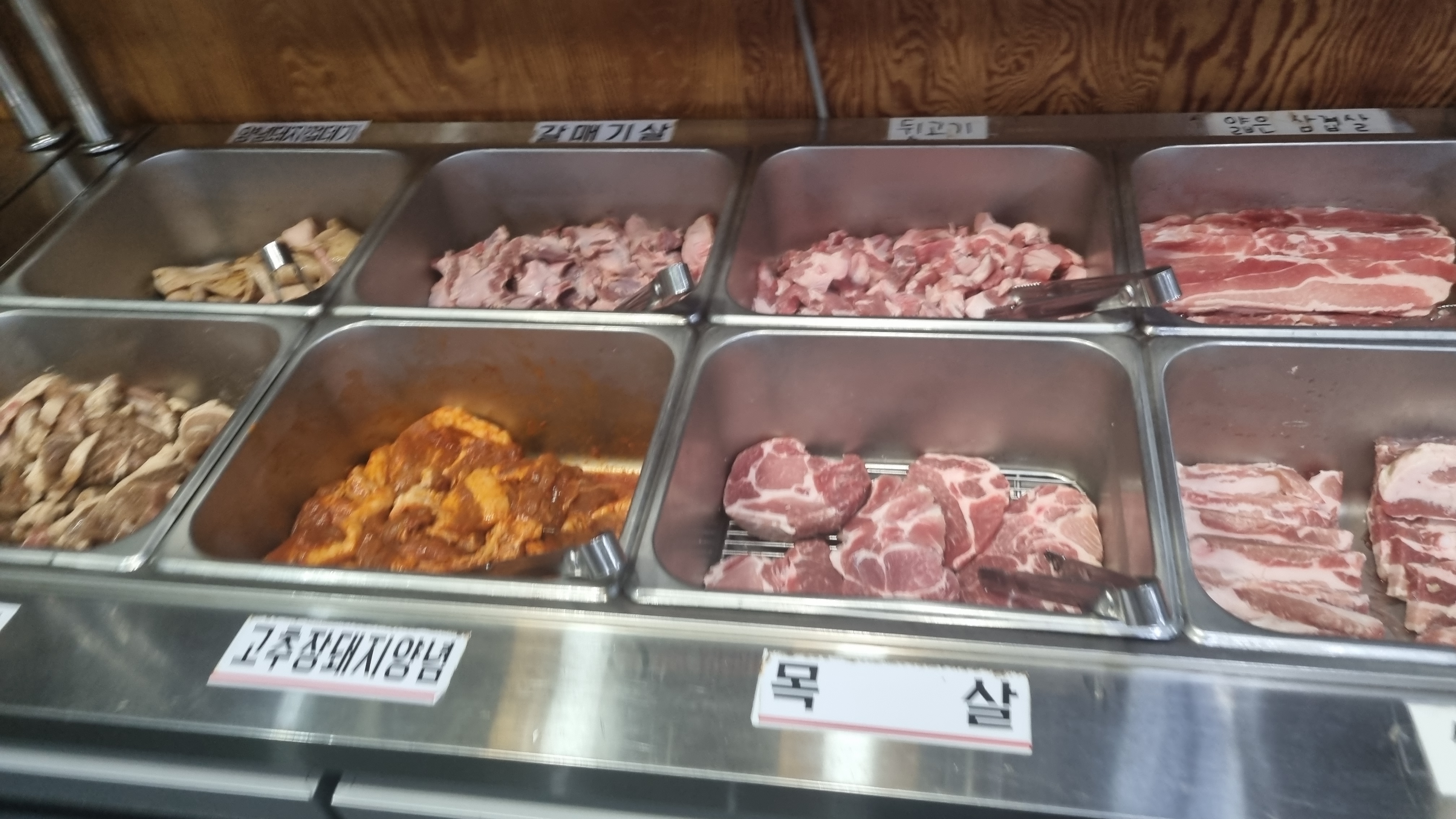 여러부위의 돼지고기와 닭고기가 있습니다. 삼겹살이 있는데 두꺼운것 얇은것 각각 있으며 목살도 있는데 본인들이 드시시고 싶은 부위 마음껏 드시면 됩니다.