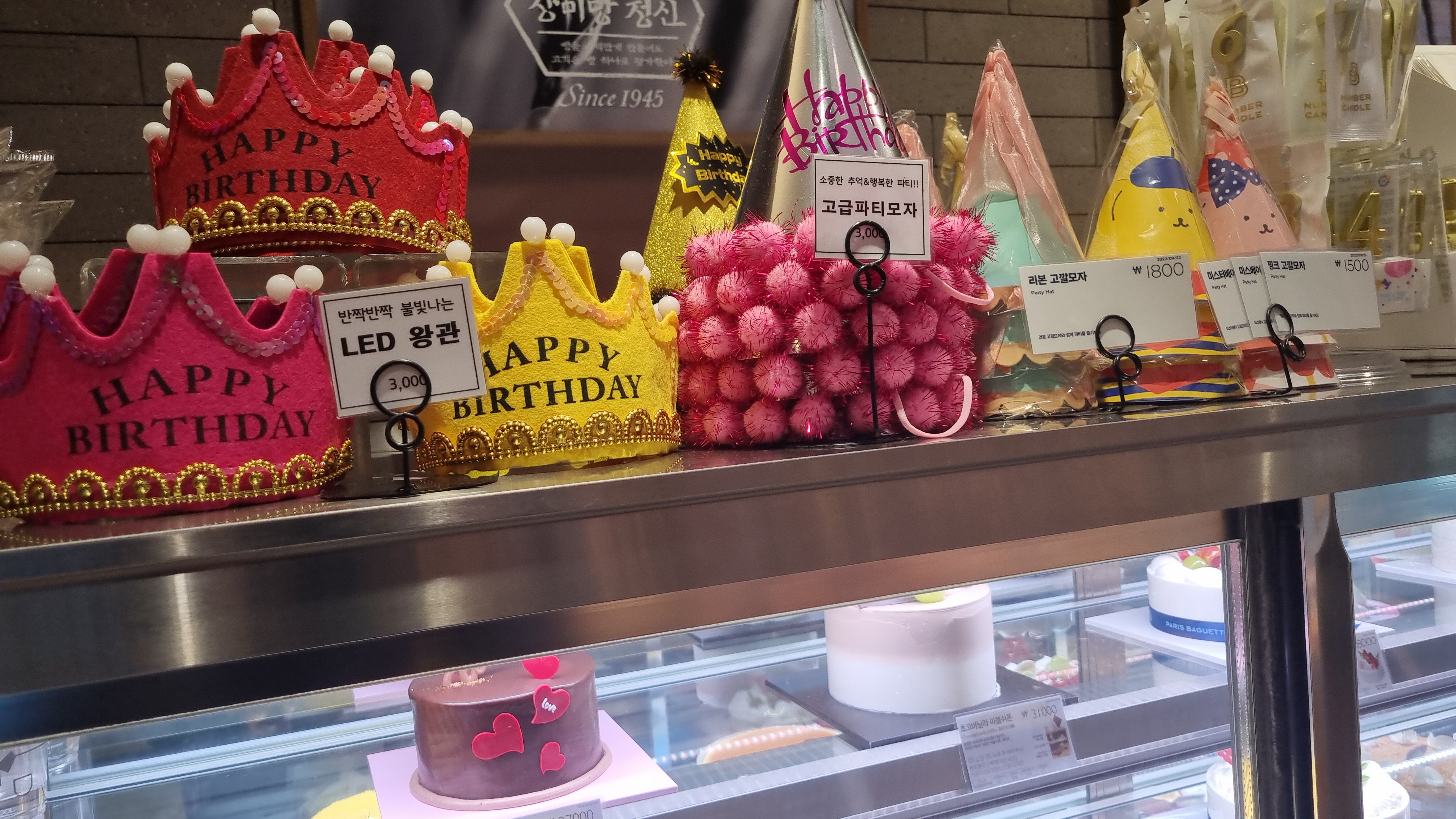 생일 용품도 종류별로 모두 판매되는데 모자나 생일초의 종류도 엄청 많은데 보통 2천원에서 5천 원 사이에서 판매됩니다.