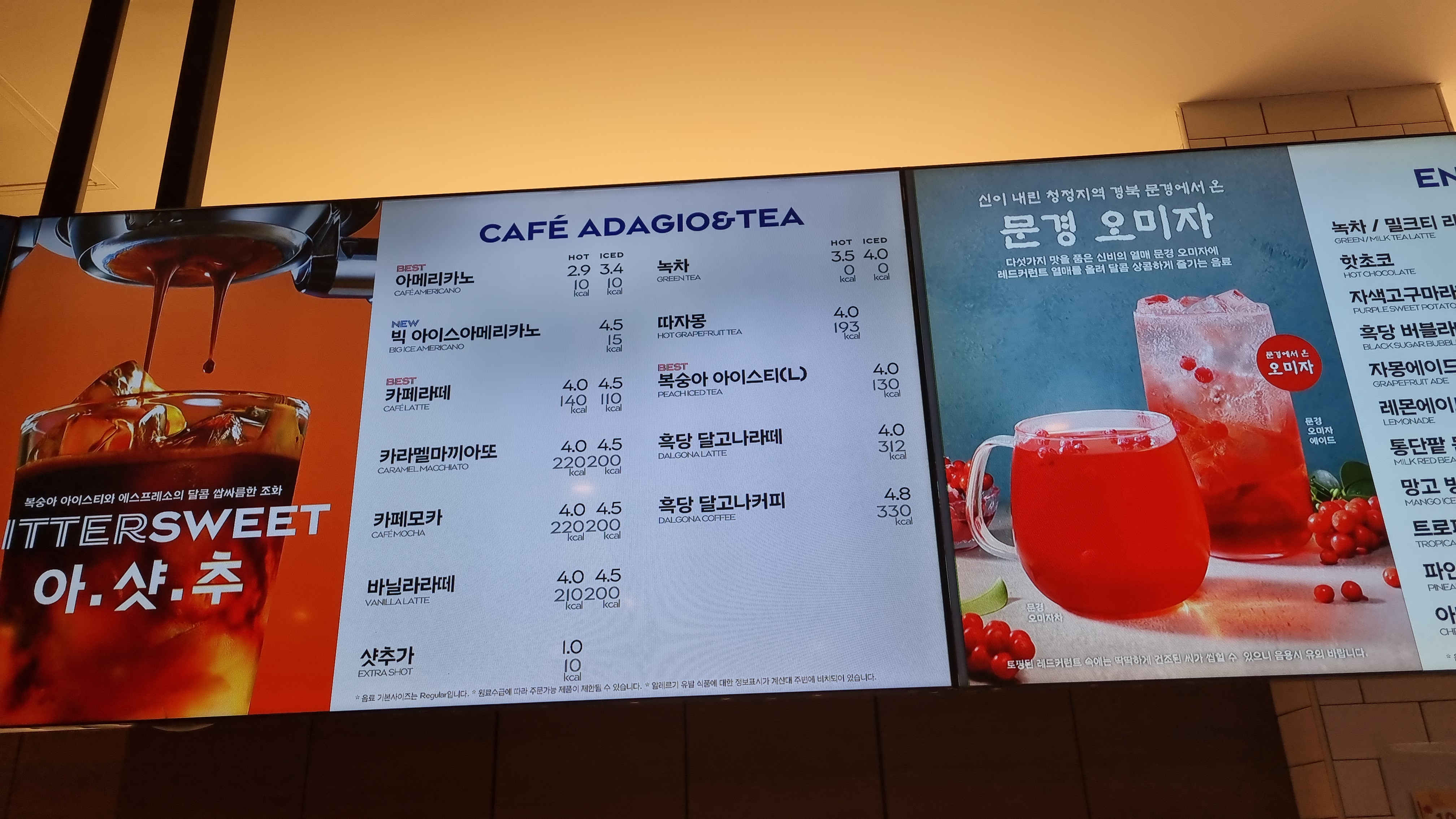 가격은 아이스아메리카노가 3,400원이고 과일 아이스티가 4,000원 정도 하는데 종류도 엄청 많습니다.