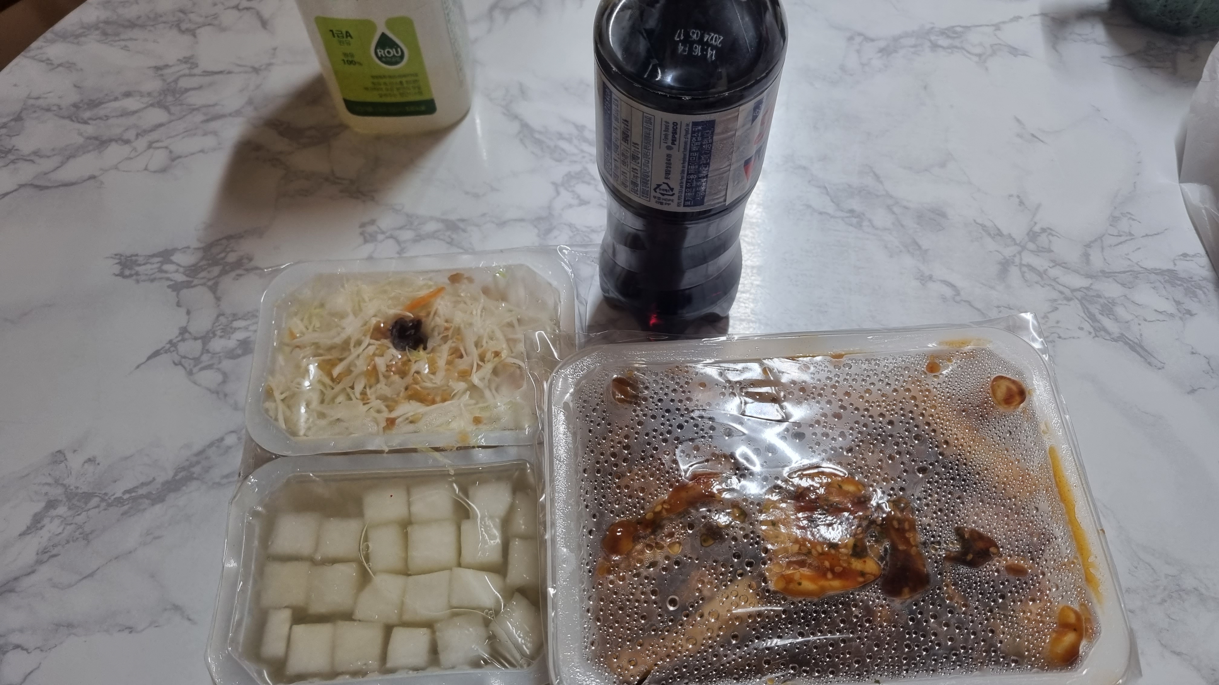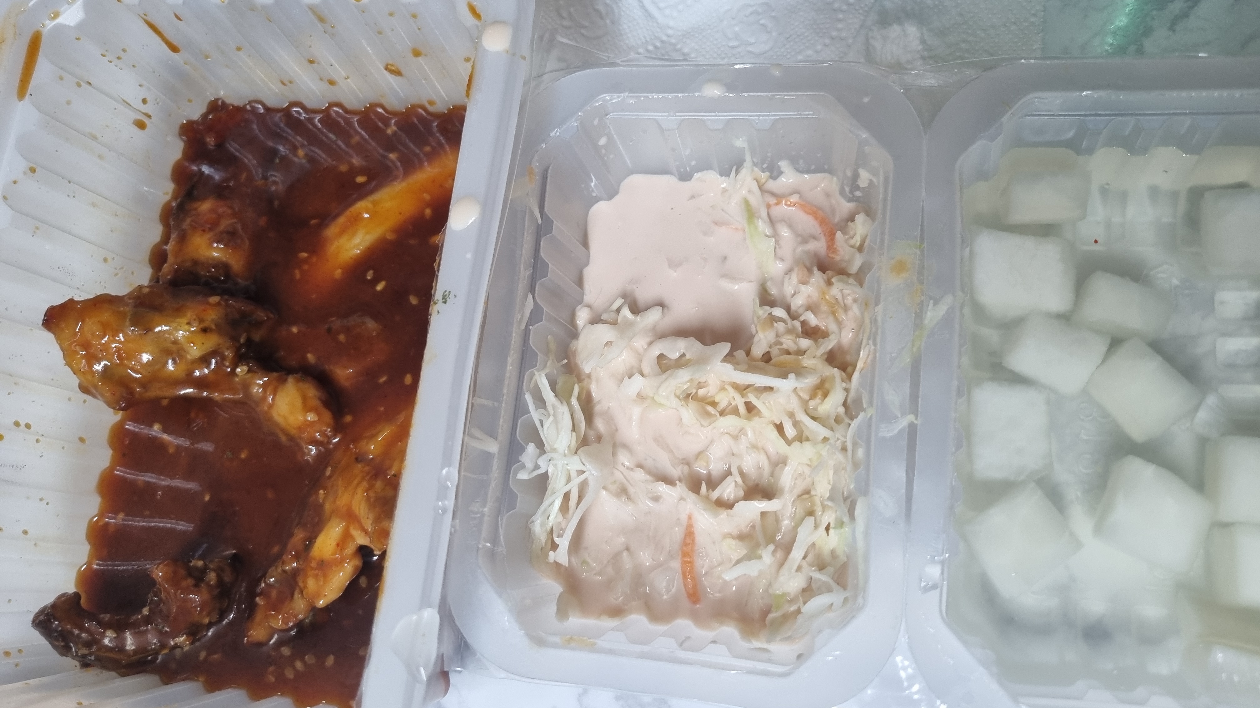 포장은 비닐봉지에 담겨 있는데 플라스틱 그릇에 비닐이 실링 되어 있었으며 치킨무, 양배추 샐러드와 콜라가 세트입니다.