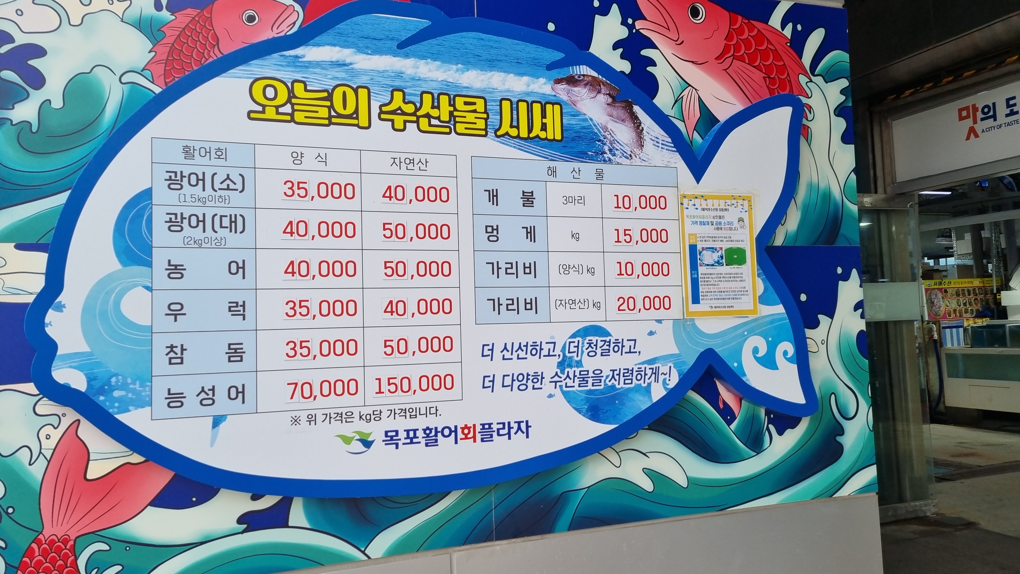 입구에 오늘의 수산물 시세 가격이 있는데 양식과 자연산의 가격교도 있는데 광어 기준 1kg 기준 양식 4만 원, 자연산 5만 원입니다.