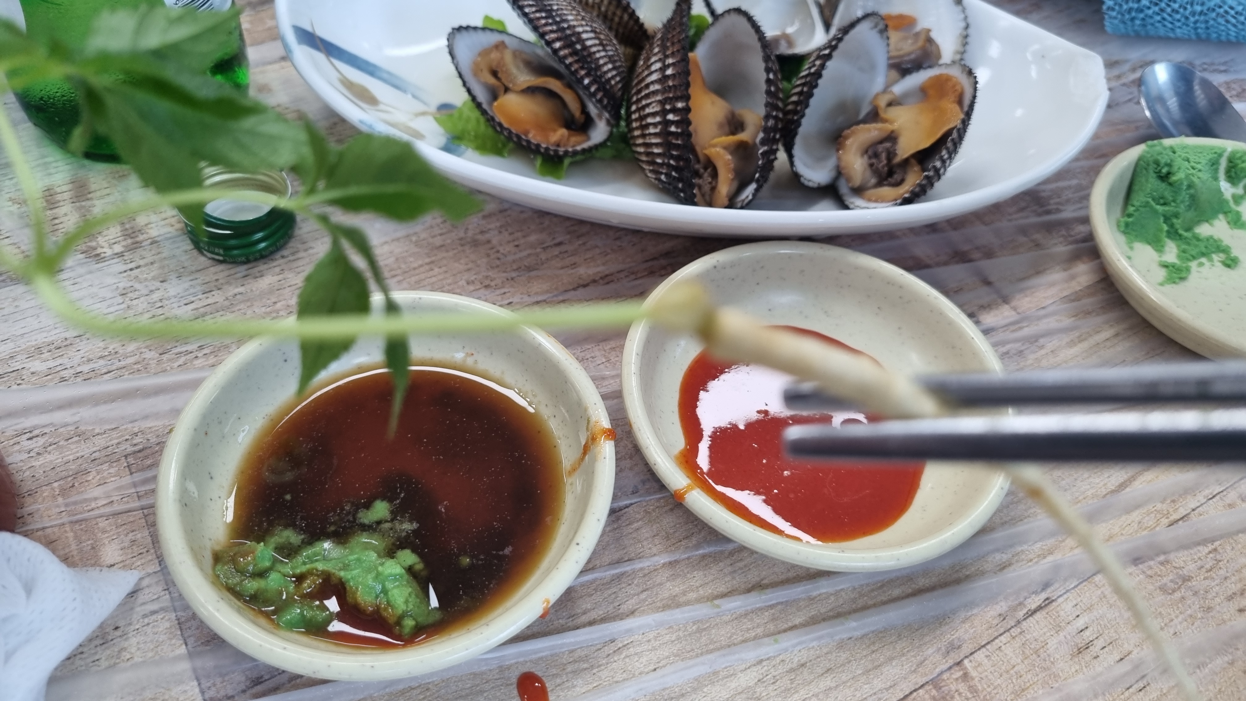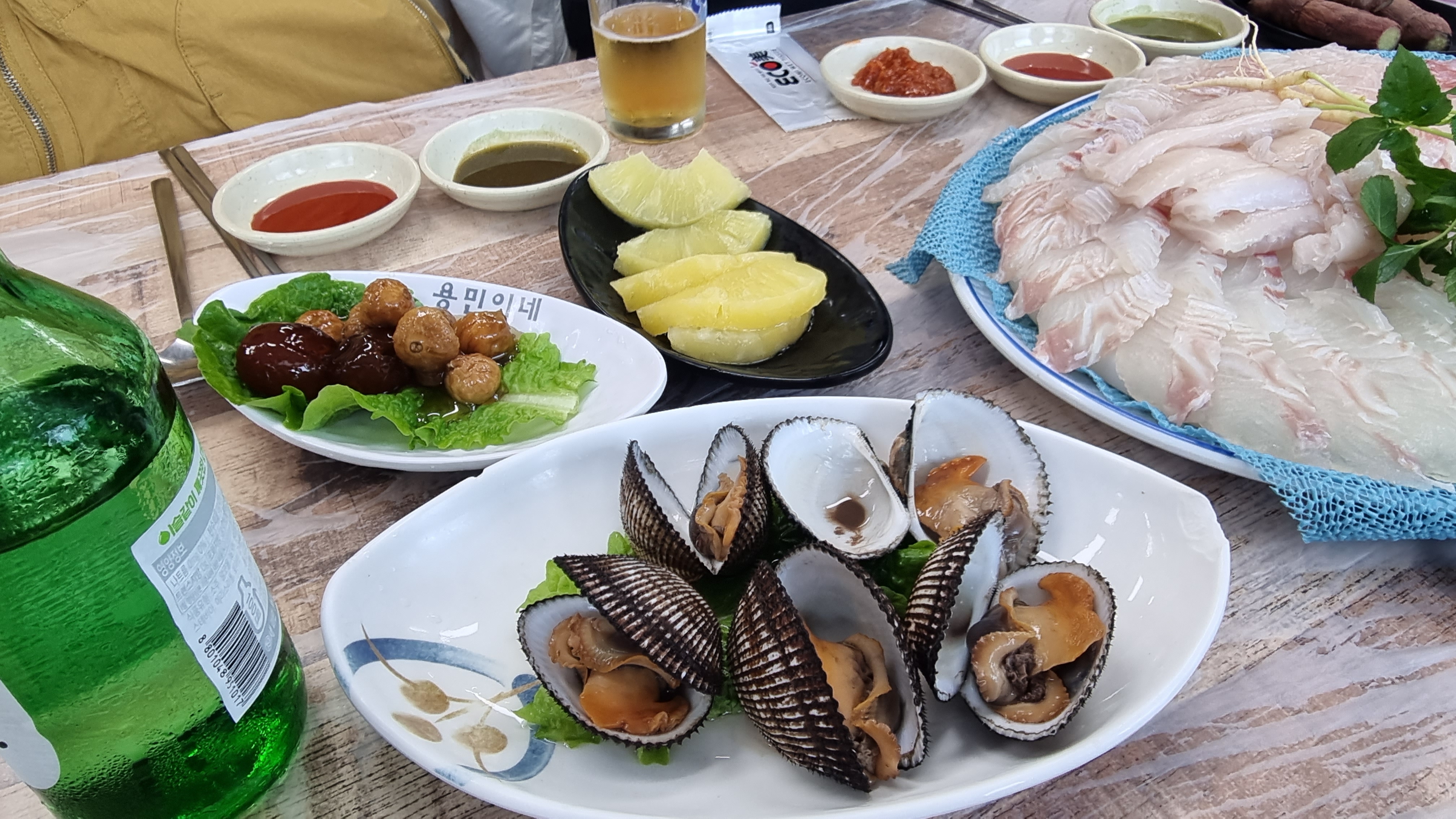 작은 인삼도 있고 싱싱한 가리비 삶은 피고막 양 많은 생선회 역시 바닷가에서 먹는 회는 일반 육지 깊숙이에서 드시는 것보다 분위기도 좋고 더 맛있게 드실 수 있습니다.