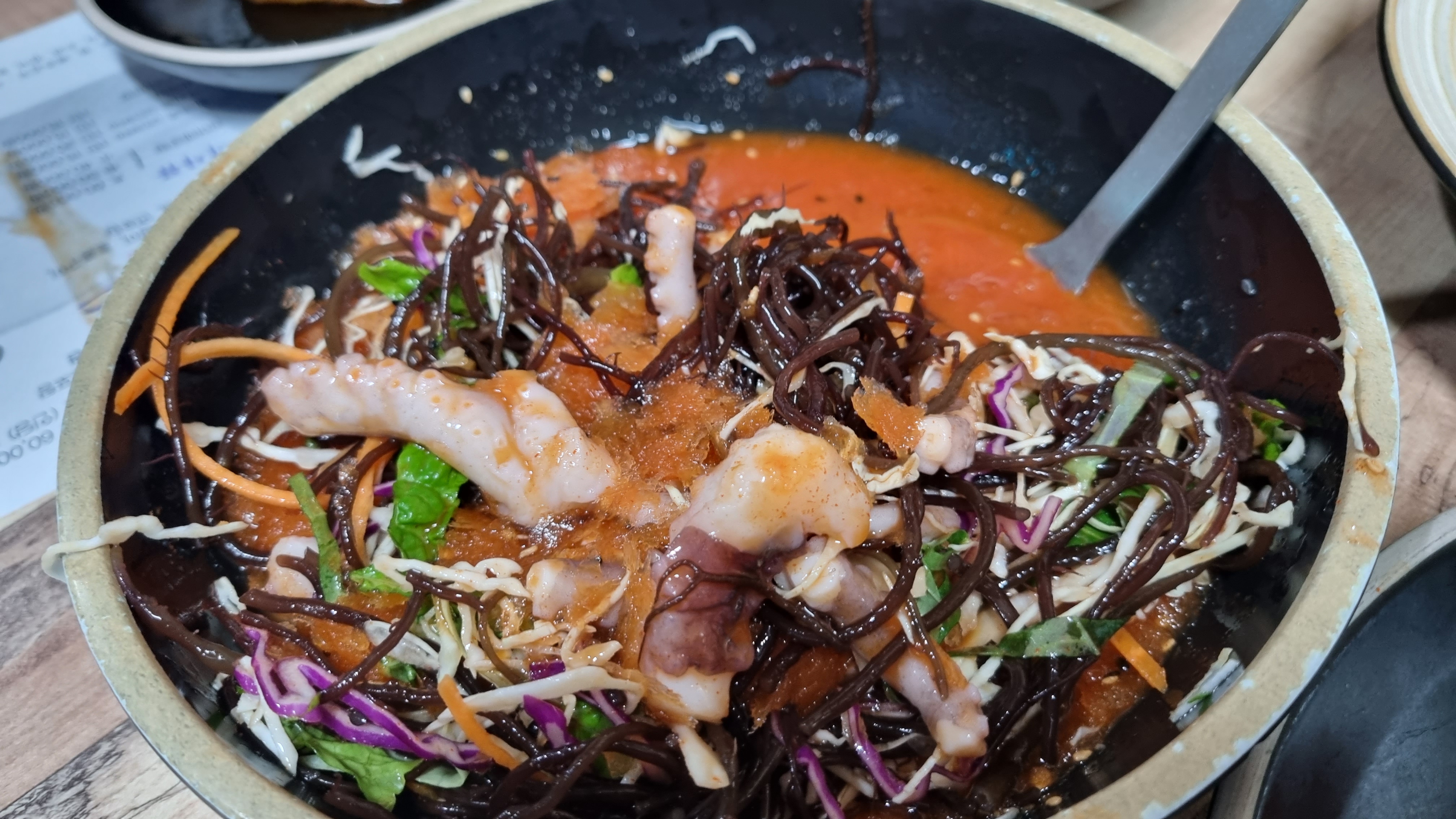 기본반찬이 나오면서 위의 음식은 물회인데 낙지물회로 국물도 새콤하게 맛있고 낙지도 너무 맛있습니다.