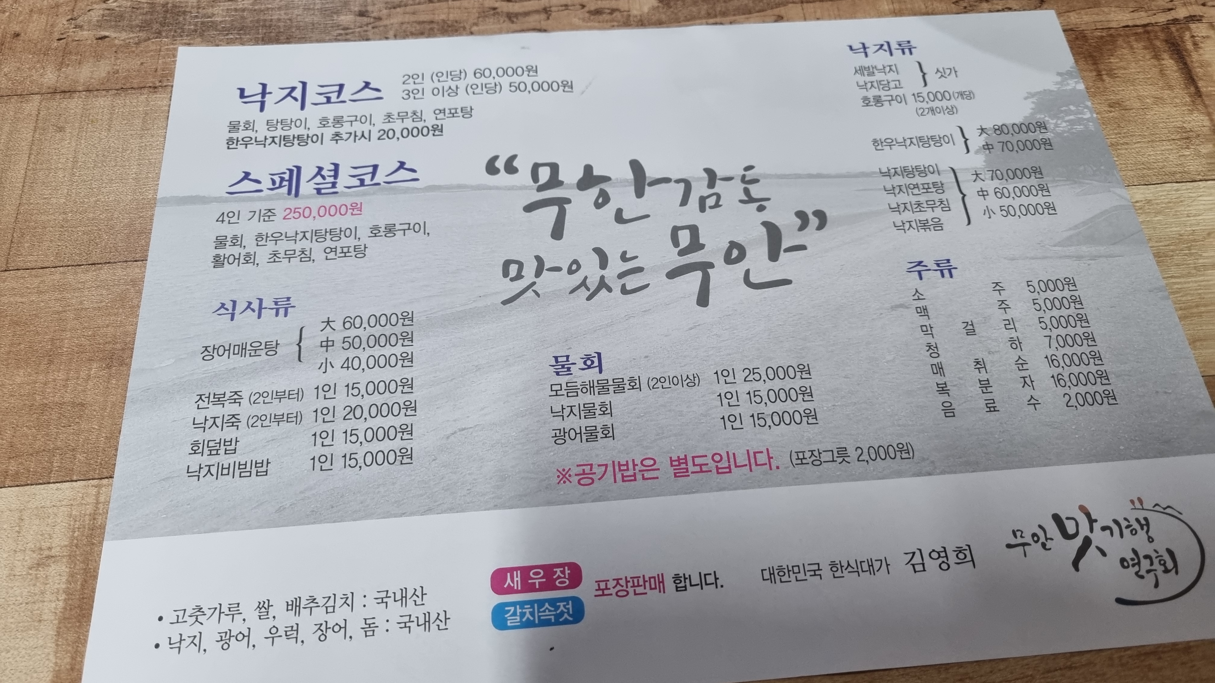 낙지 자체자 상당히 비싼 음식이기 때문에 1인당 5만 원의 코스요리로 판매되어 비싸게 생각 드는데 삼겹살 2인분 먹어도 3만 원이 나오므로 낙지 코스요리가 결코 비싼 것이 아닌 듯합니다.