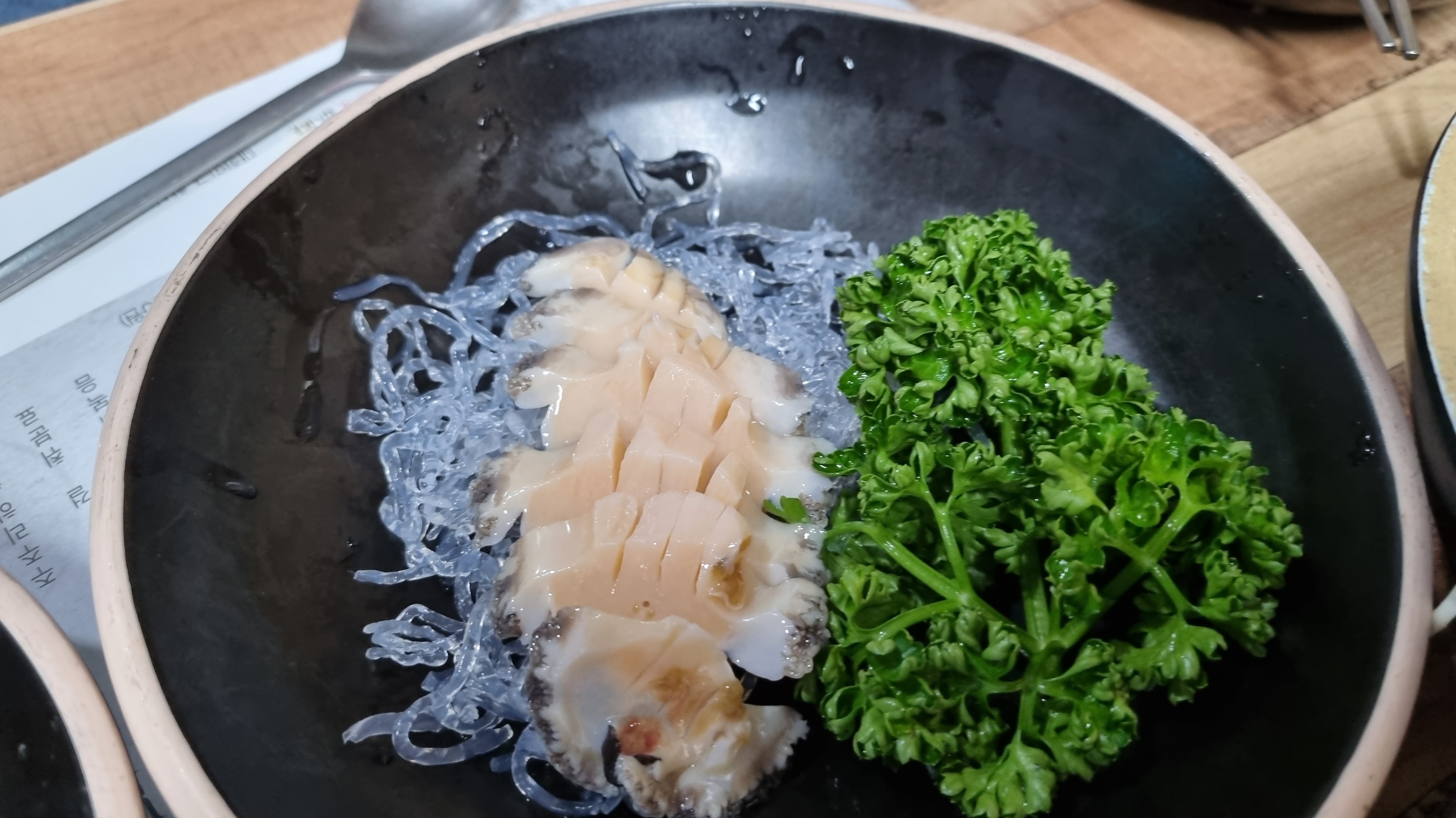 음식은 조금씩 계속 나오는데 전복회는 역시 꼬들꼬들한 맛이 특색 있게 입맛을 돋구워 줍니다. 살아 있는 전복을 잡은 회인데 정말 맛있네요