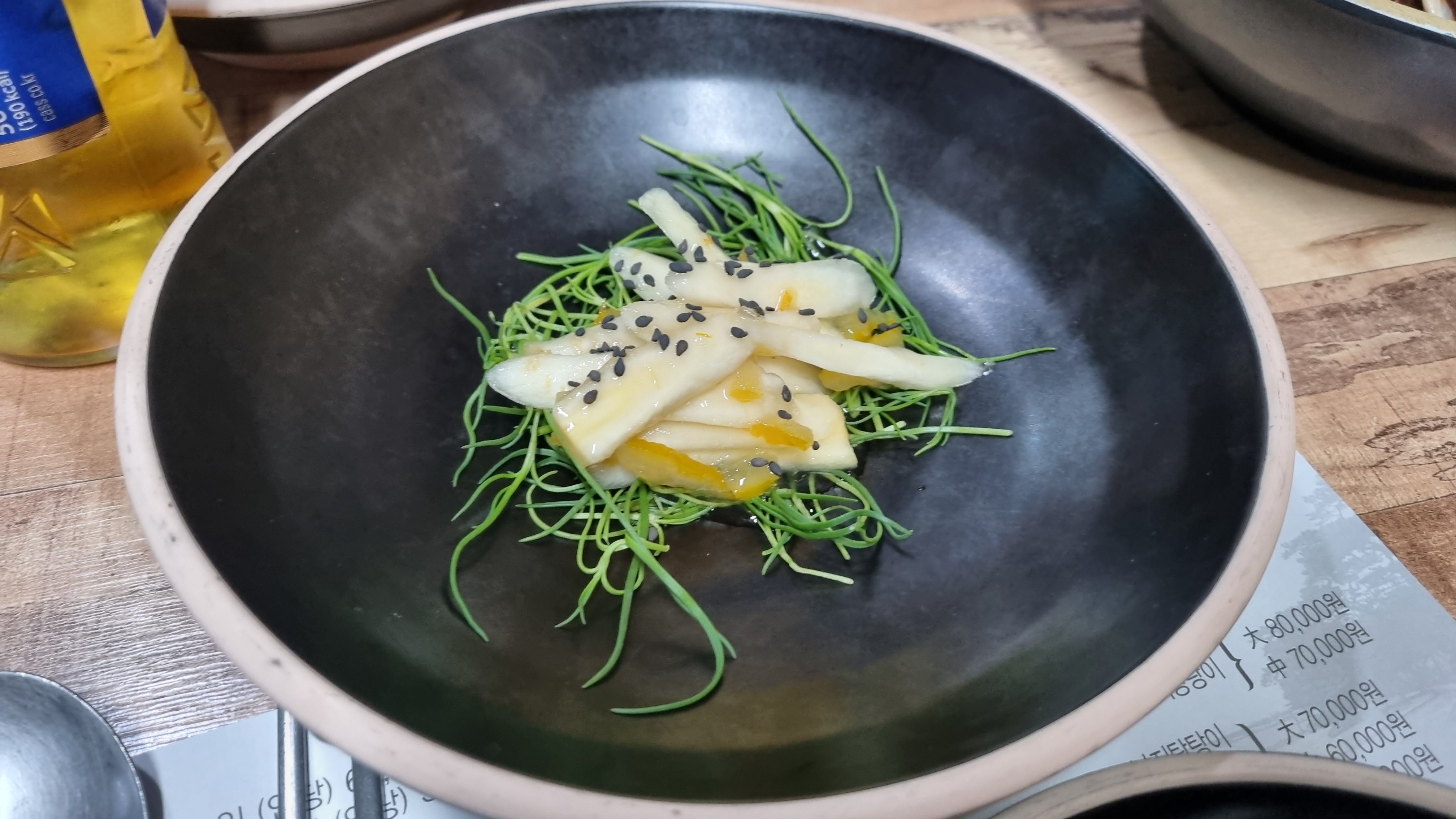 우리는 코스요리로 먹었는데 3인이상이면 1인당 5만 원짜리 코스요리가 가능하는데 나오는 음식이 물회, 탕탕이, 호롱이 구이, 한우낙지탕탕이, 연포탕, 초무침등 정말 다양하게 많이 나오는 메뉴입니다.