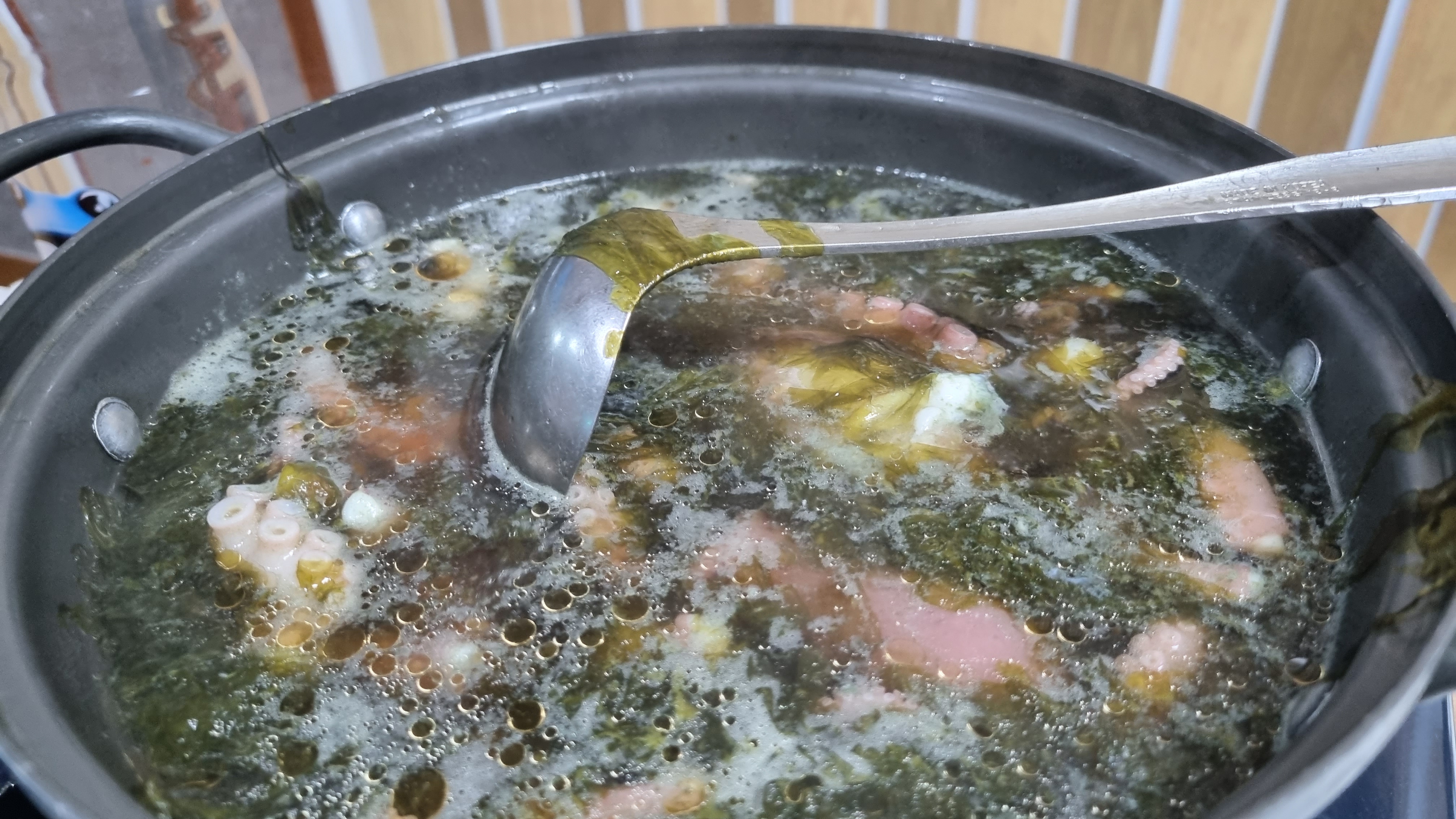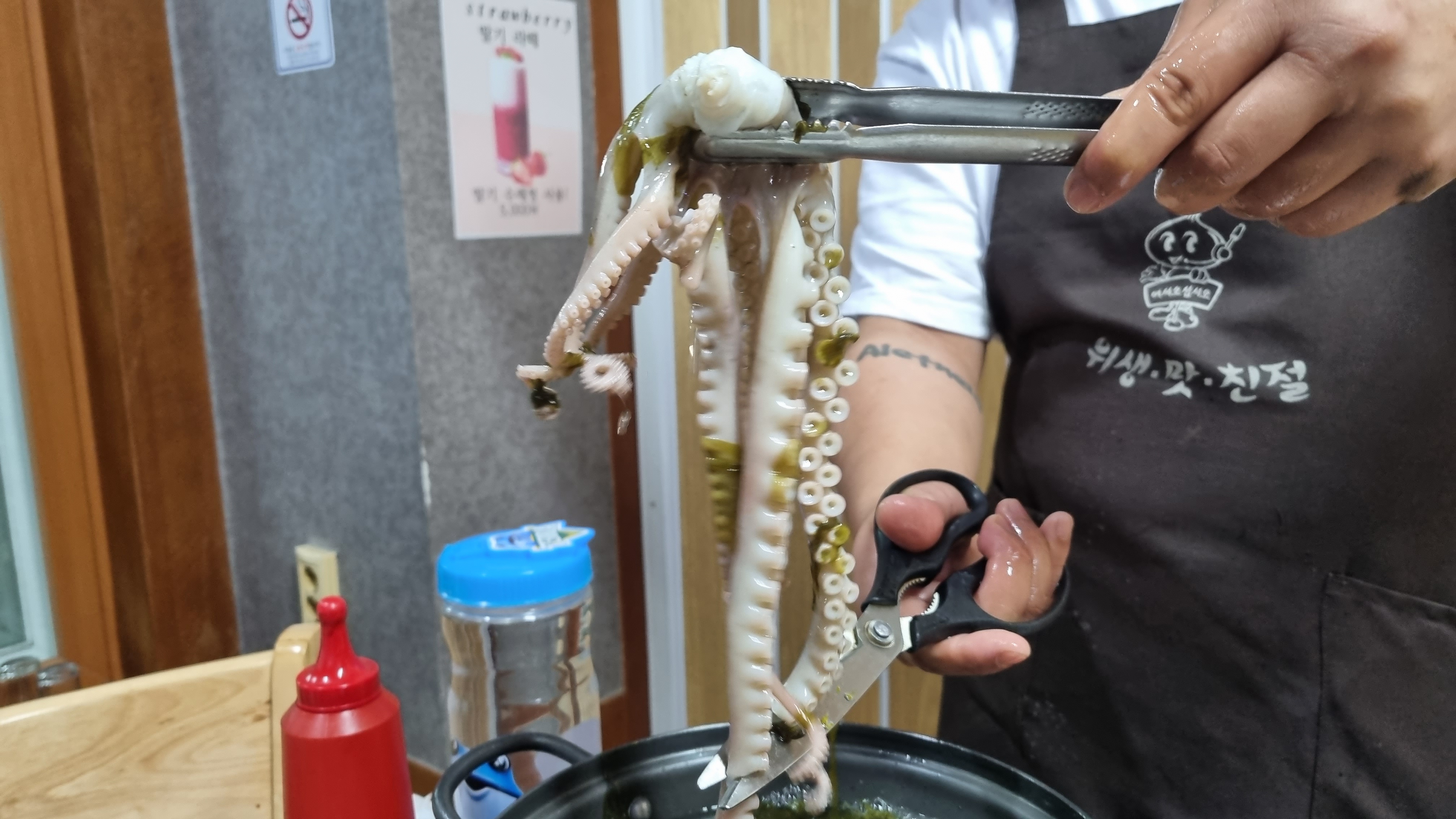 매생이를 넣은 국물을 먼저 끓이고 이어서 살아있는 큰 낙지를 그대로 넣습니다. 사장님이 직접 나와서 만들어 주는데 이렇게 직접 넣은 것이 처음 봅니다.