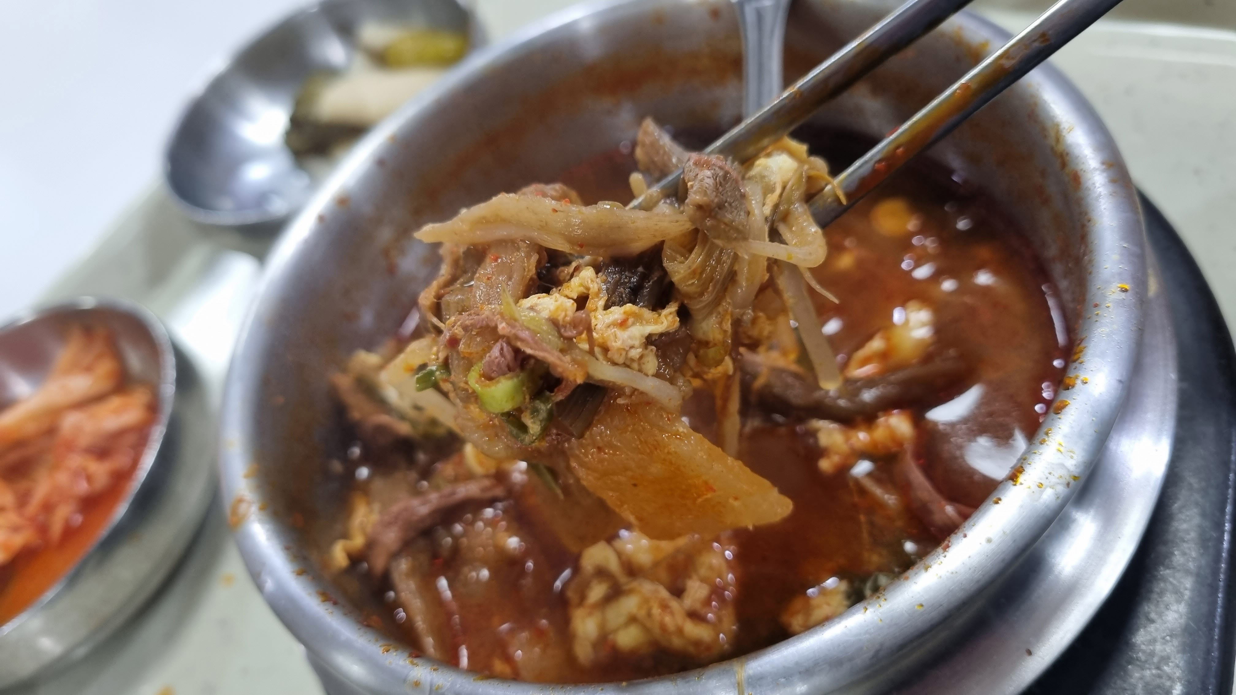 처음에는 밥과 국을 따로 먹다가 밥을 육개장에 말아먹는데 더 맛있으며 고기는 비율이 많지는 않았지만 부드럽고 다른 야채들과 어울려 식감이 좋아 맛이 괜찮았습니다.
