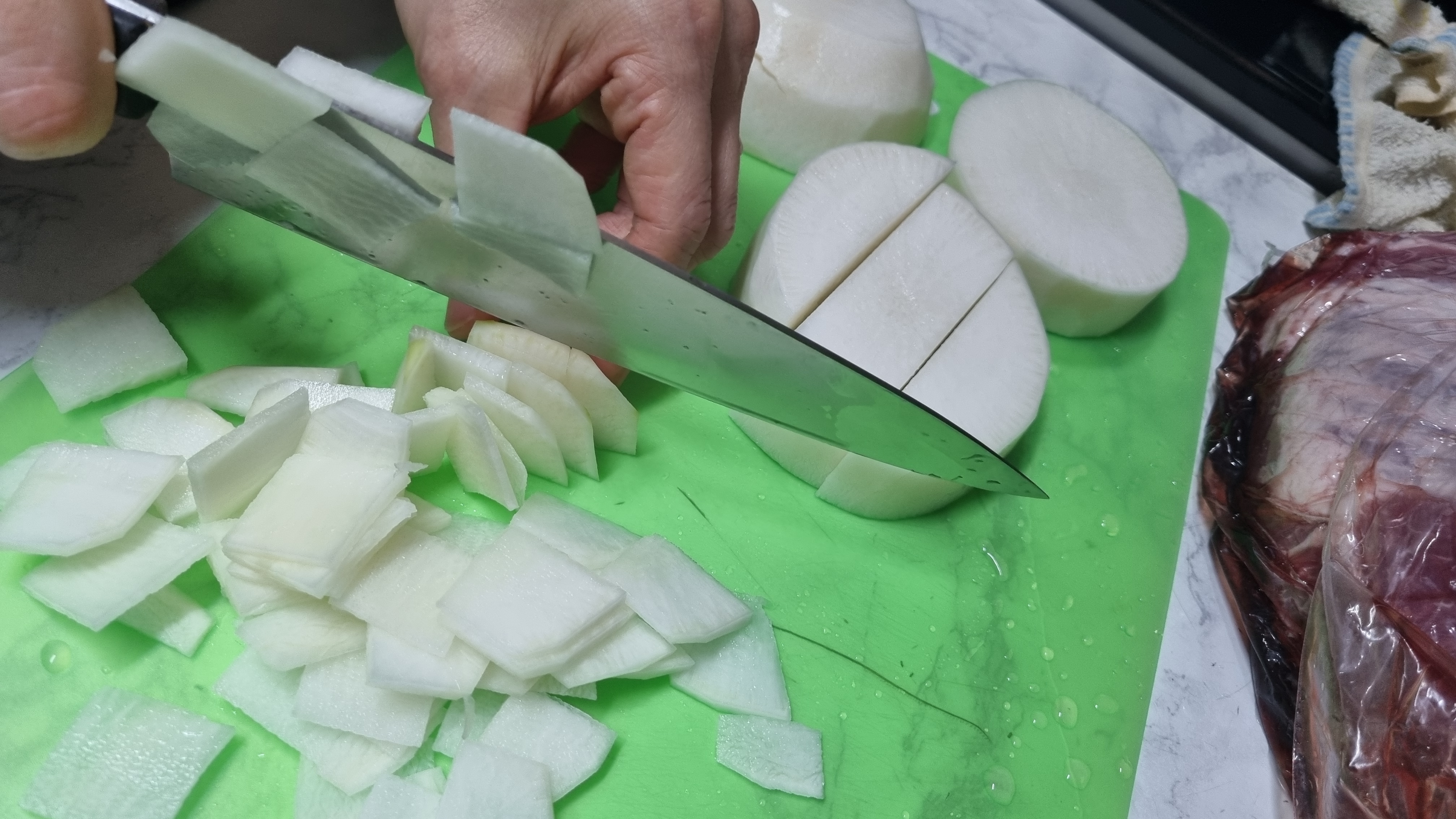 무의 두께는 약 5mm 정도 가 적당하는데 이것도 개인마다 취향이 다르니 각자 상황에 맞게 자르면 됩니다.