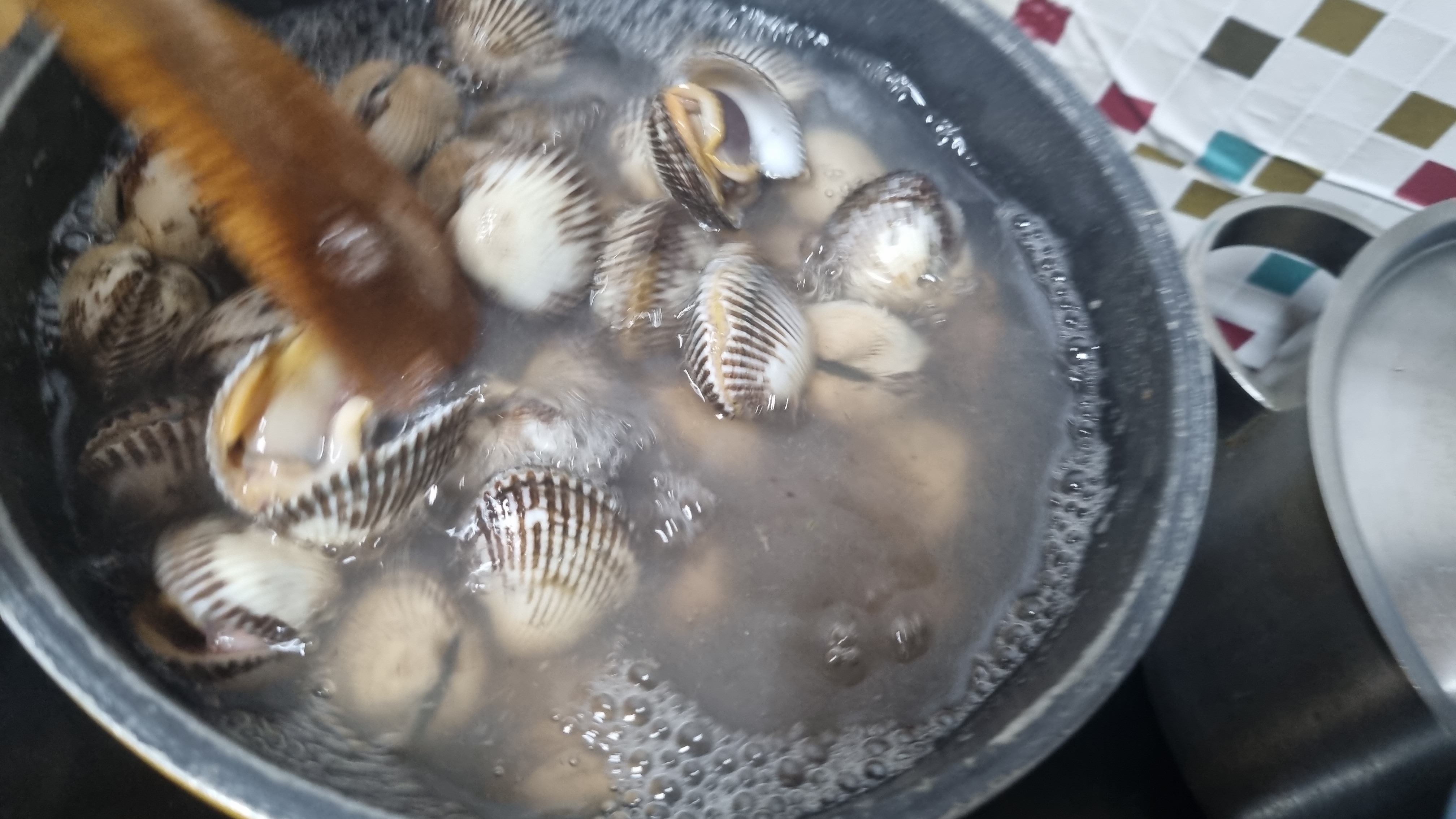 이후 주걱이나 수저로 끓은 물에 넣은 꼬막을 저어주어야 하는데 이는 최대한 빨리 골고루 삶아 시간을 단축하려는 목적입니다.