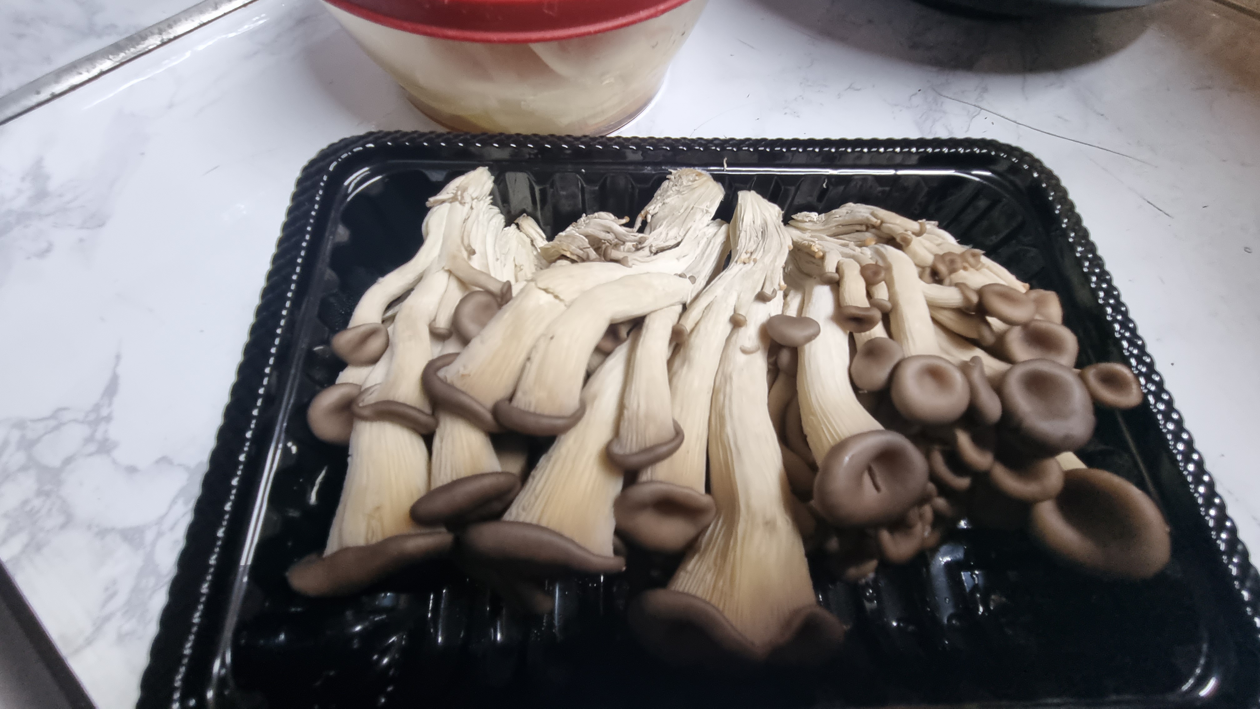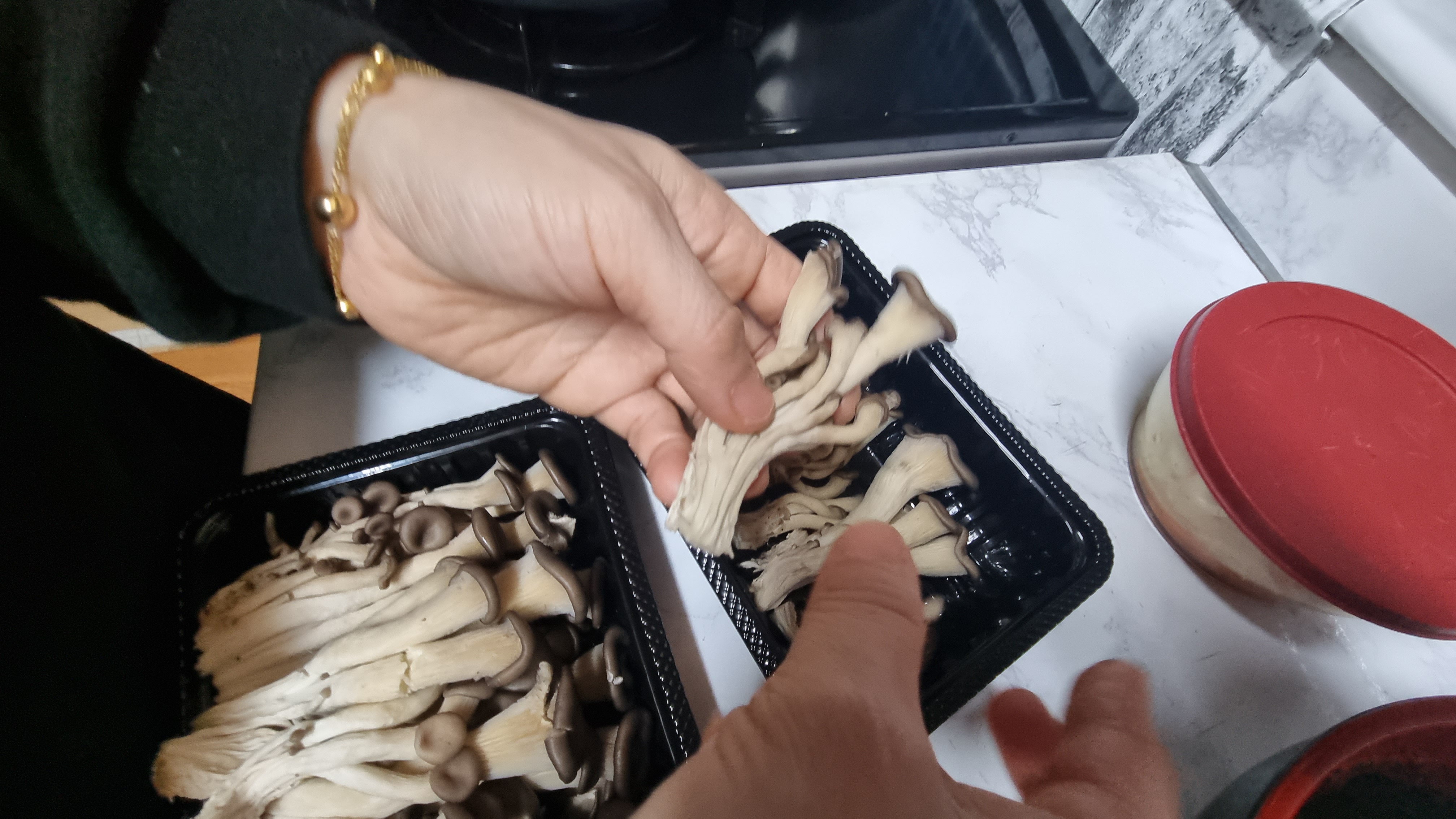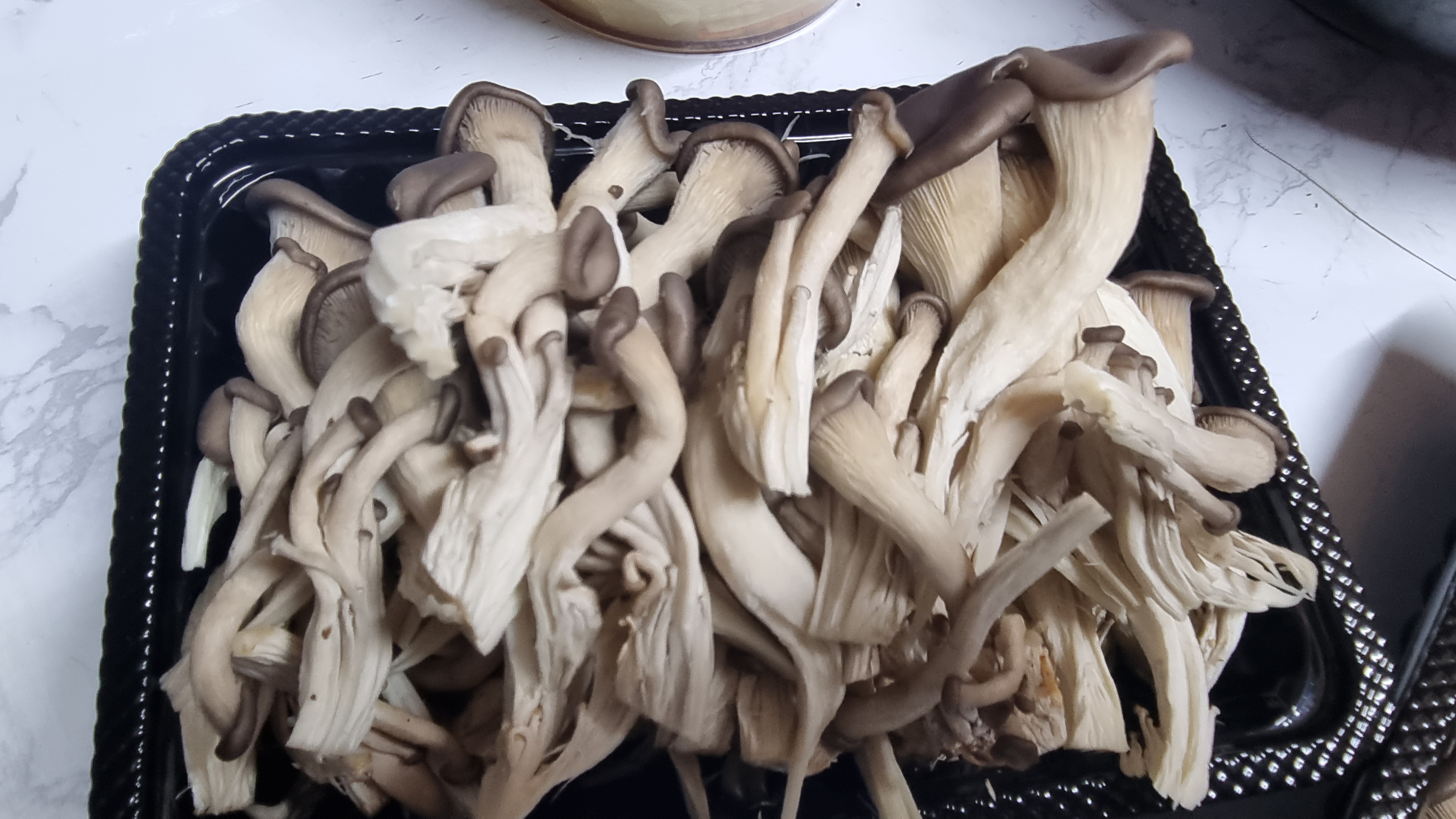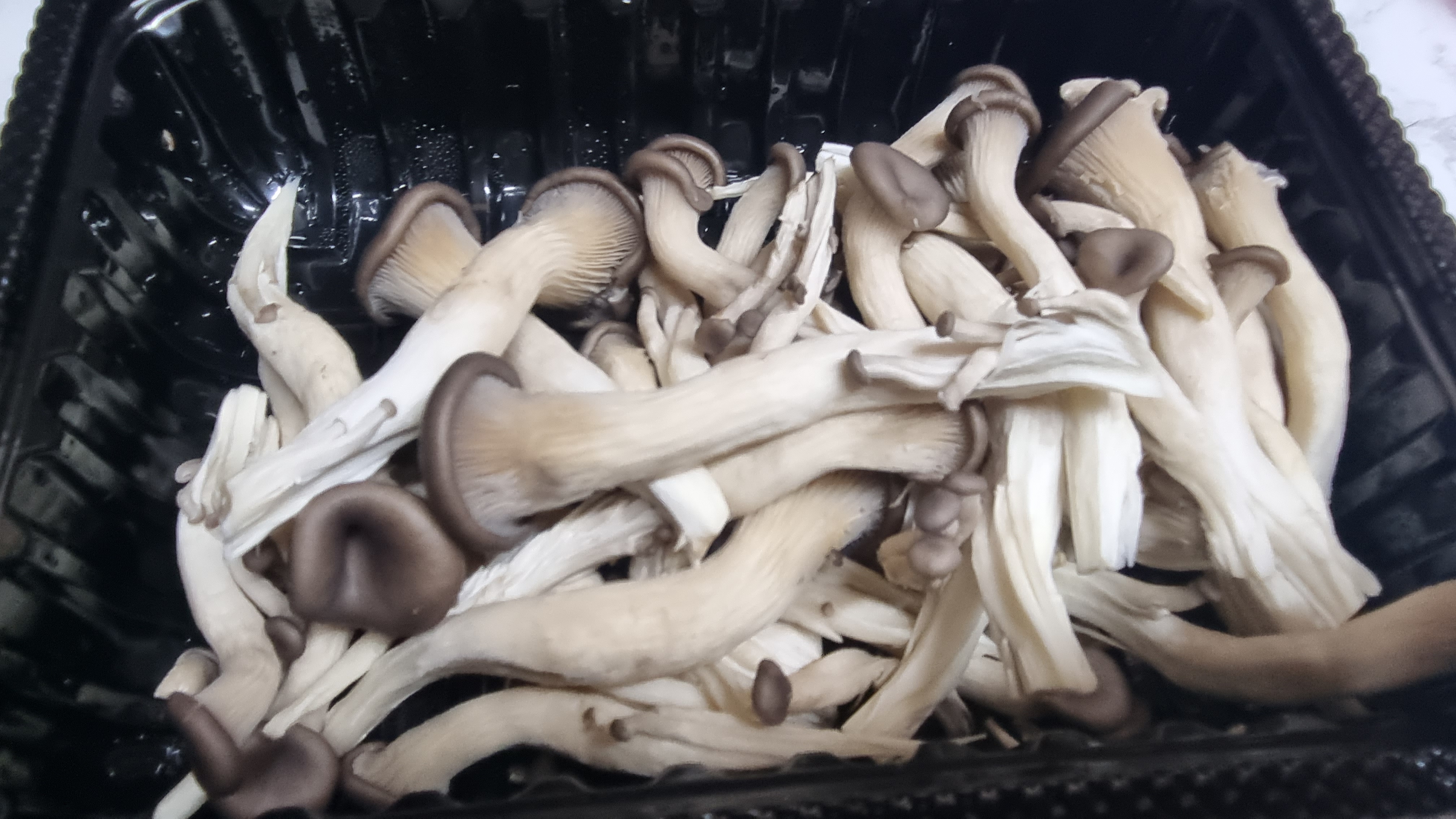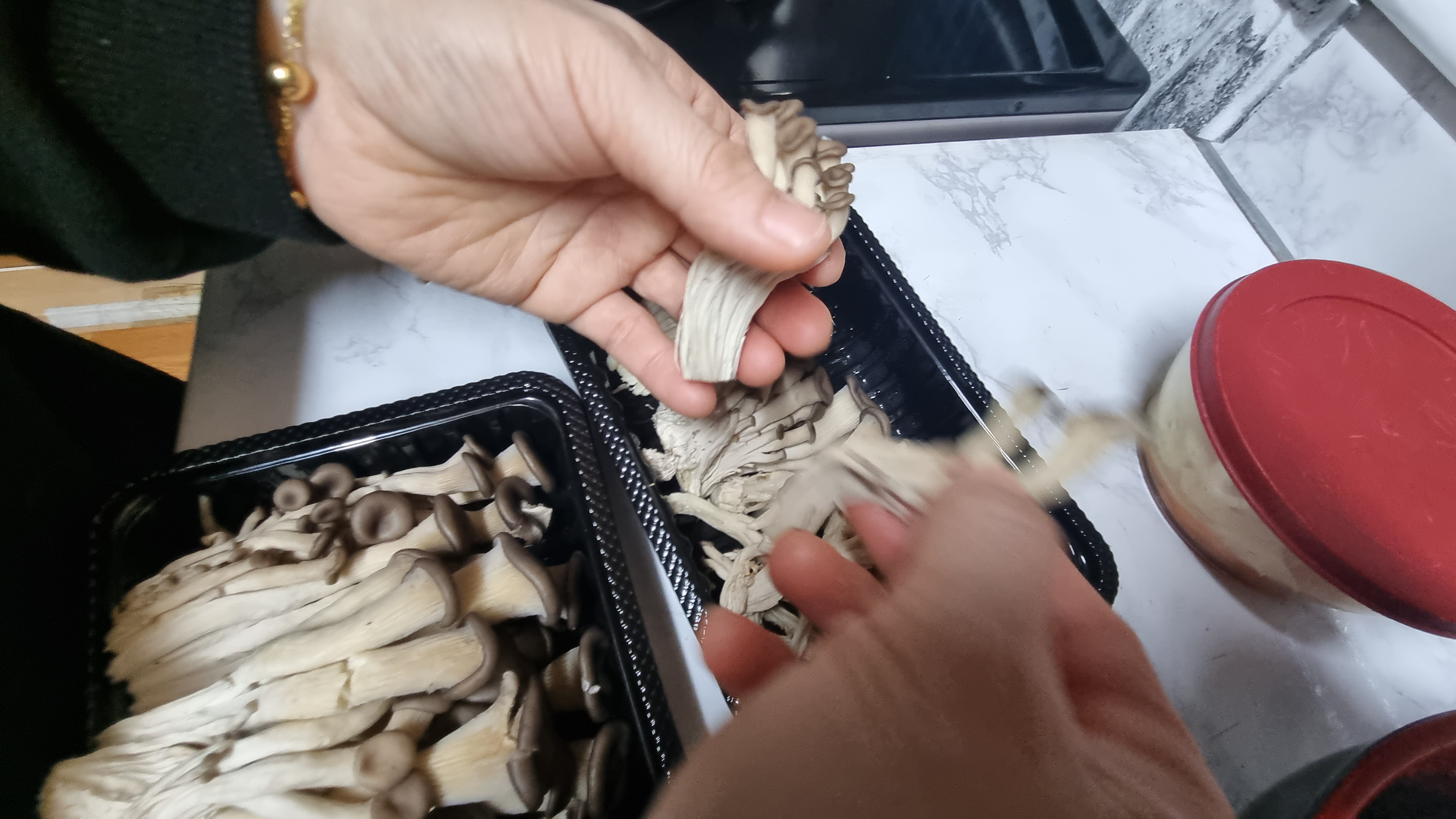 포장을 개봉하여 버섯을 모두 꺼내어 손으로 잡아당겨 찢어줍니다. 느타리버섯은 송이가 작아 많은데 이것이 여러 개씩 붙어 있으므로 하나하나 찢어 작게 해주는 것이 중요합니다.