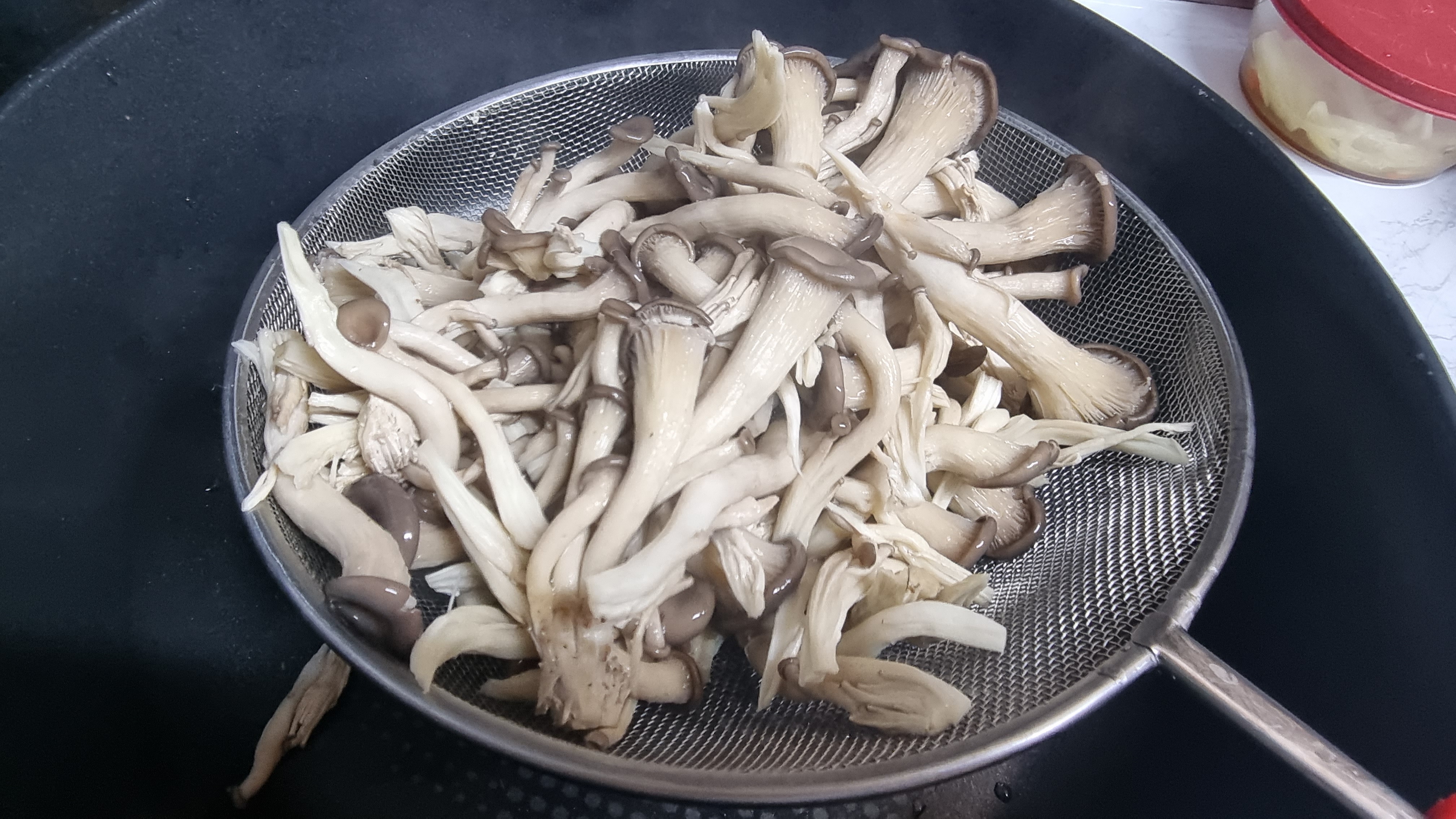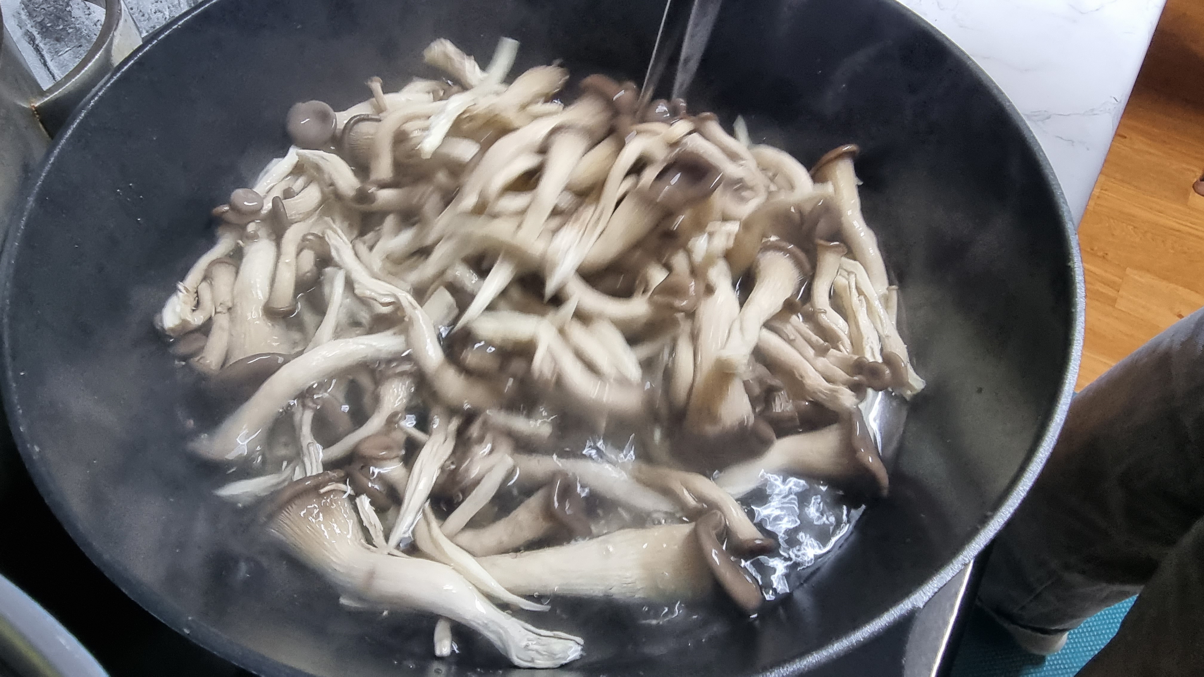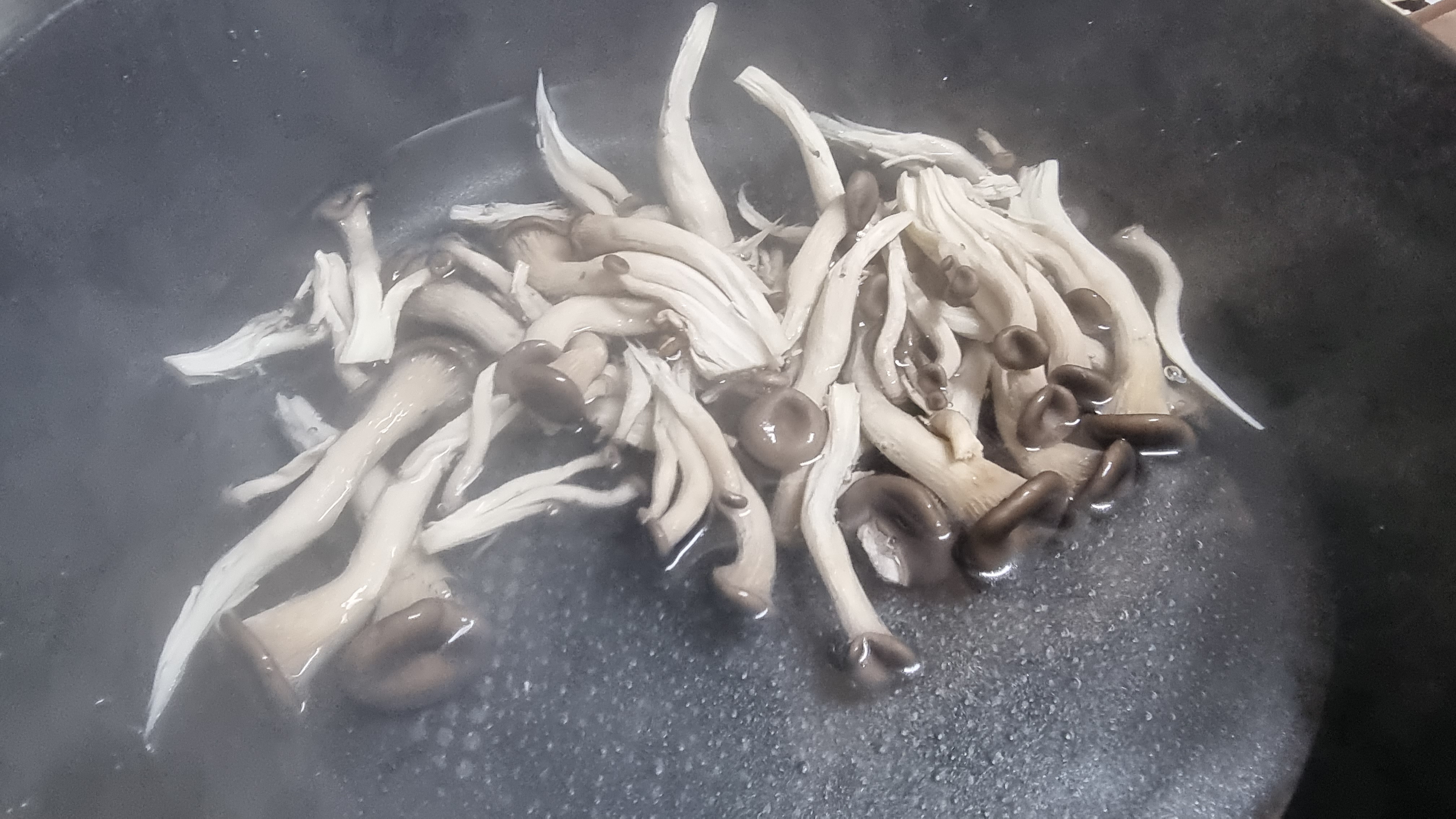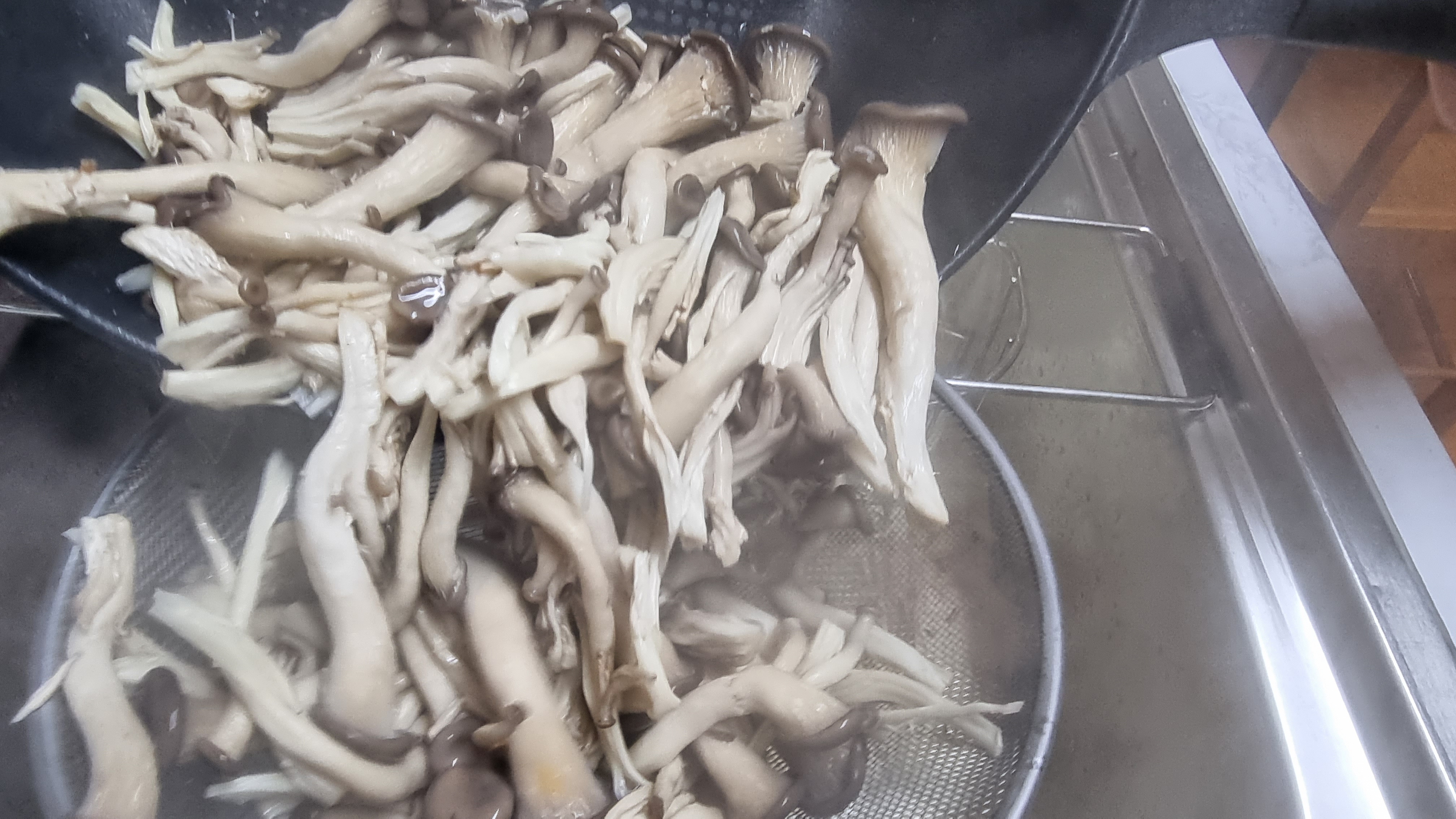 데치기가 끝나면 바로 체망들을 이용하여 물과 버섯을 분리하고 찬물로 바로 헹구어 주면서 차갑게 식히면 맛이 더 좋아지게 됩니다.