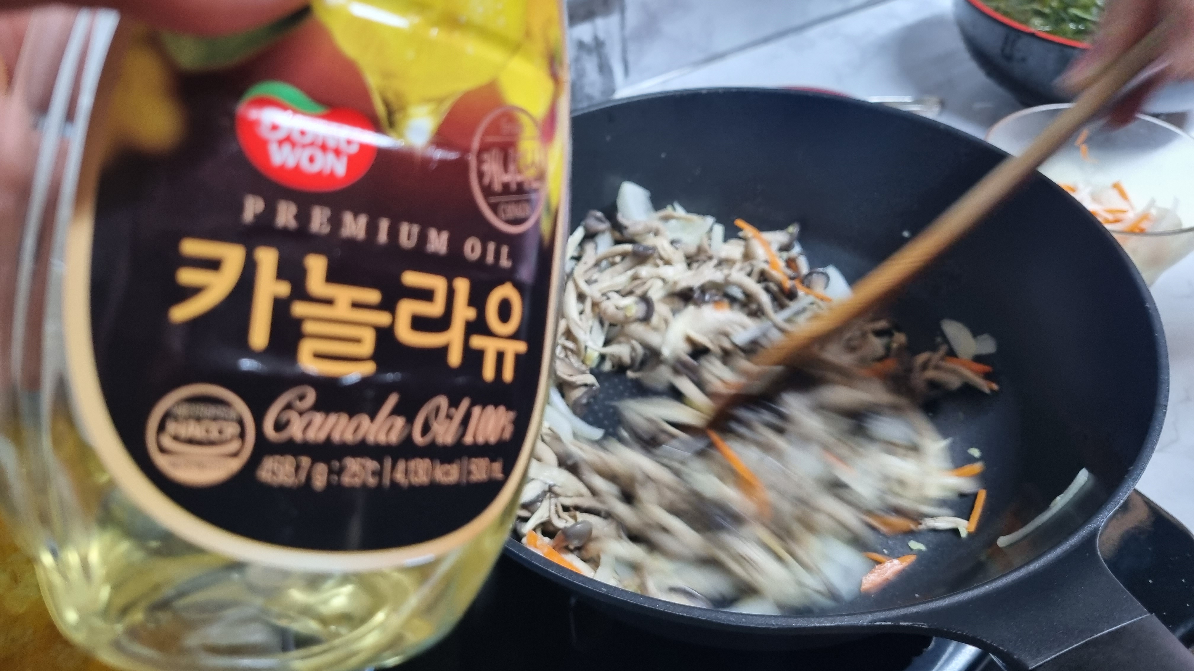 식용유를 붓고 5분 정도 약한 불에서 볶아주면 대부분 맛있게 되는데 이때 계속해서 골고루 볶아지도록 잘 저어 주워야 합니다.