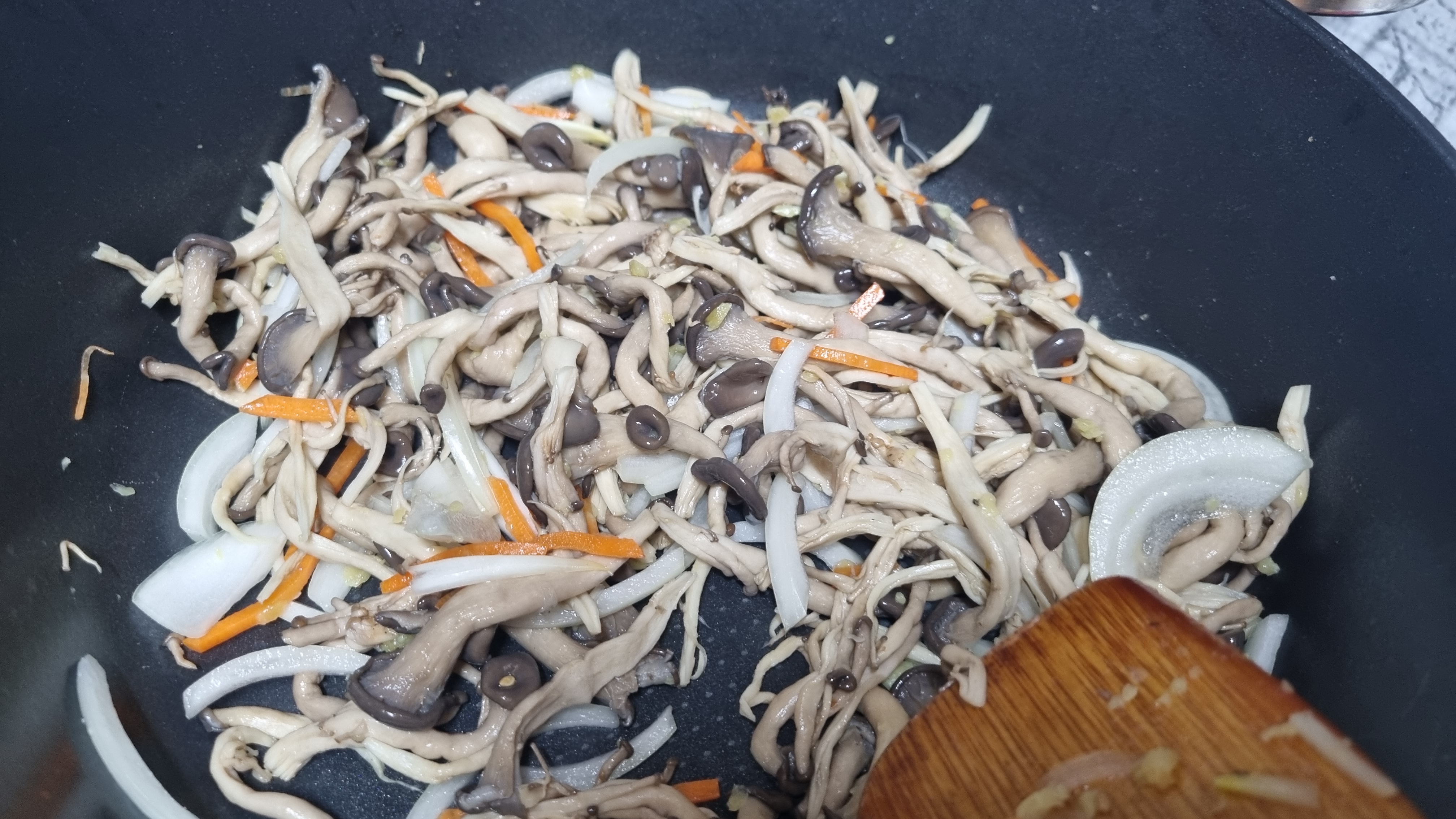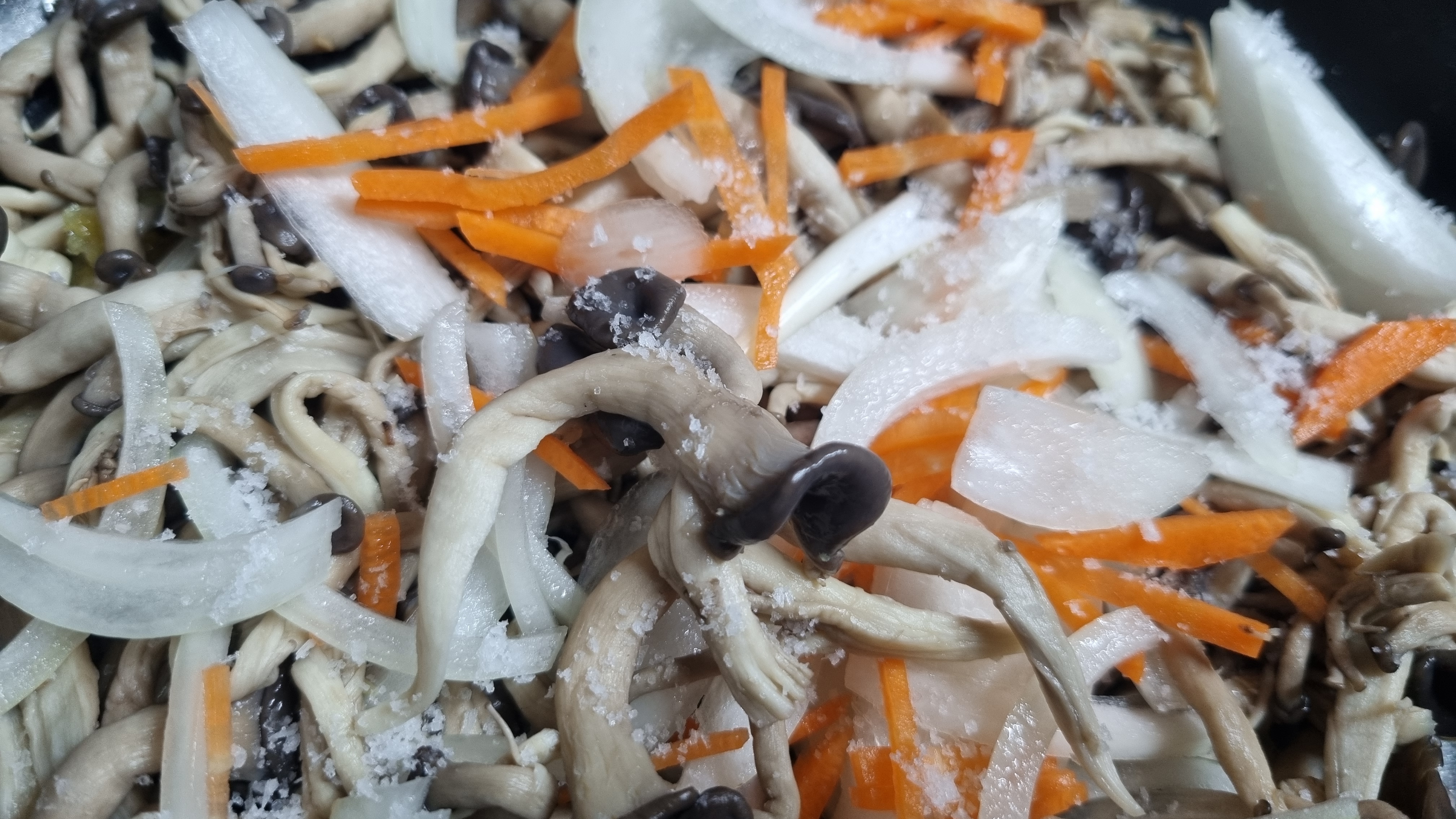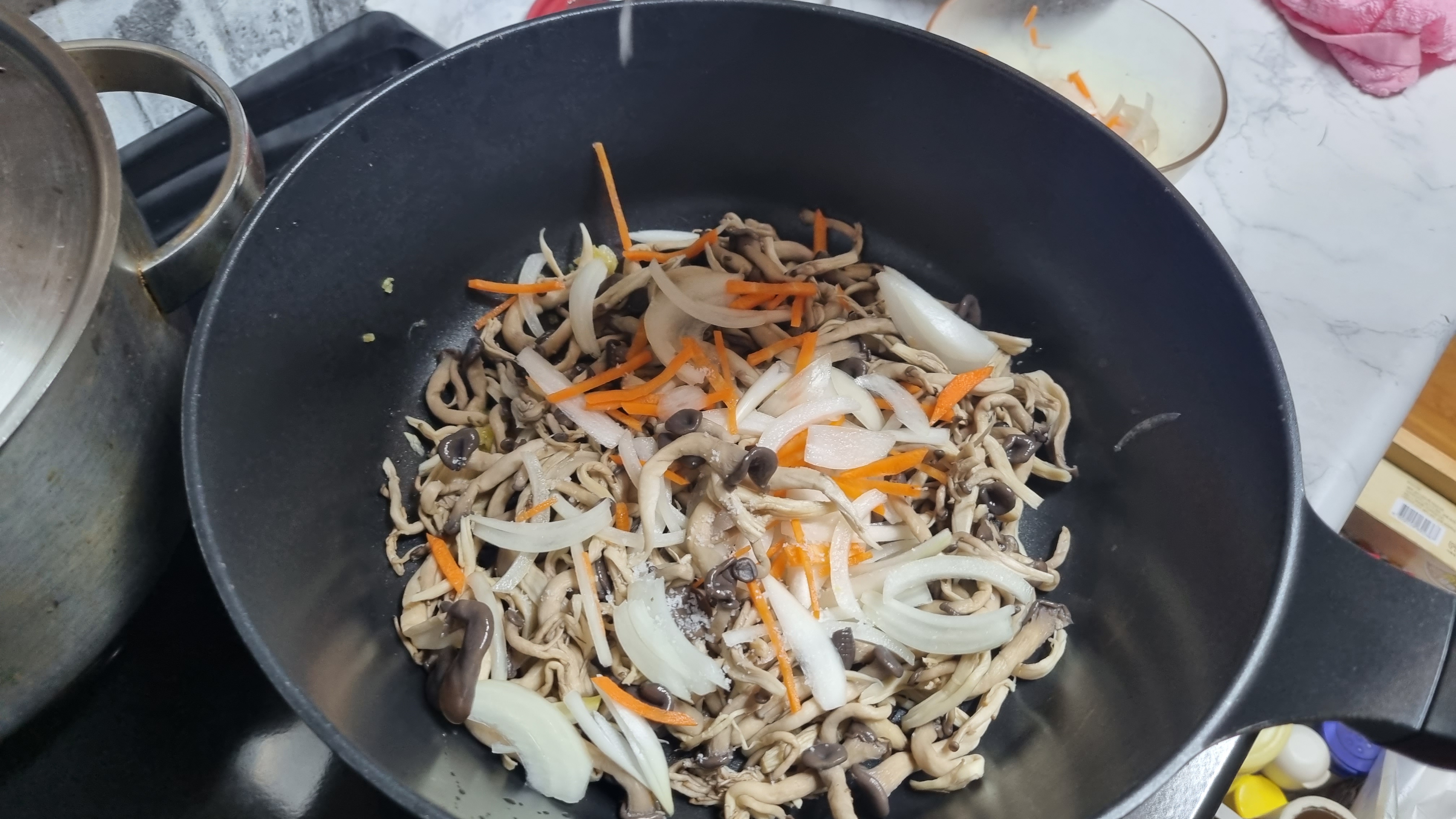 이때 다진 마늘과 양파, 당근을 잘게 썰은 것으로 함께 넣어줍니다.
