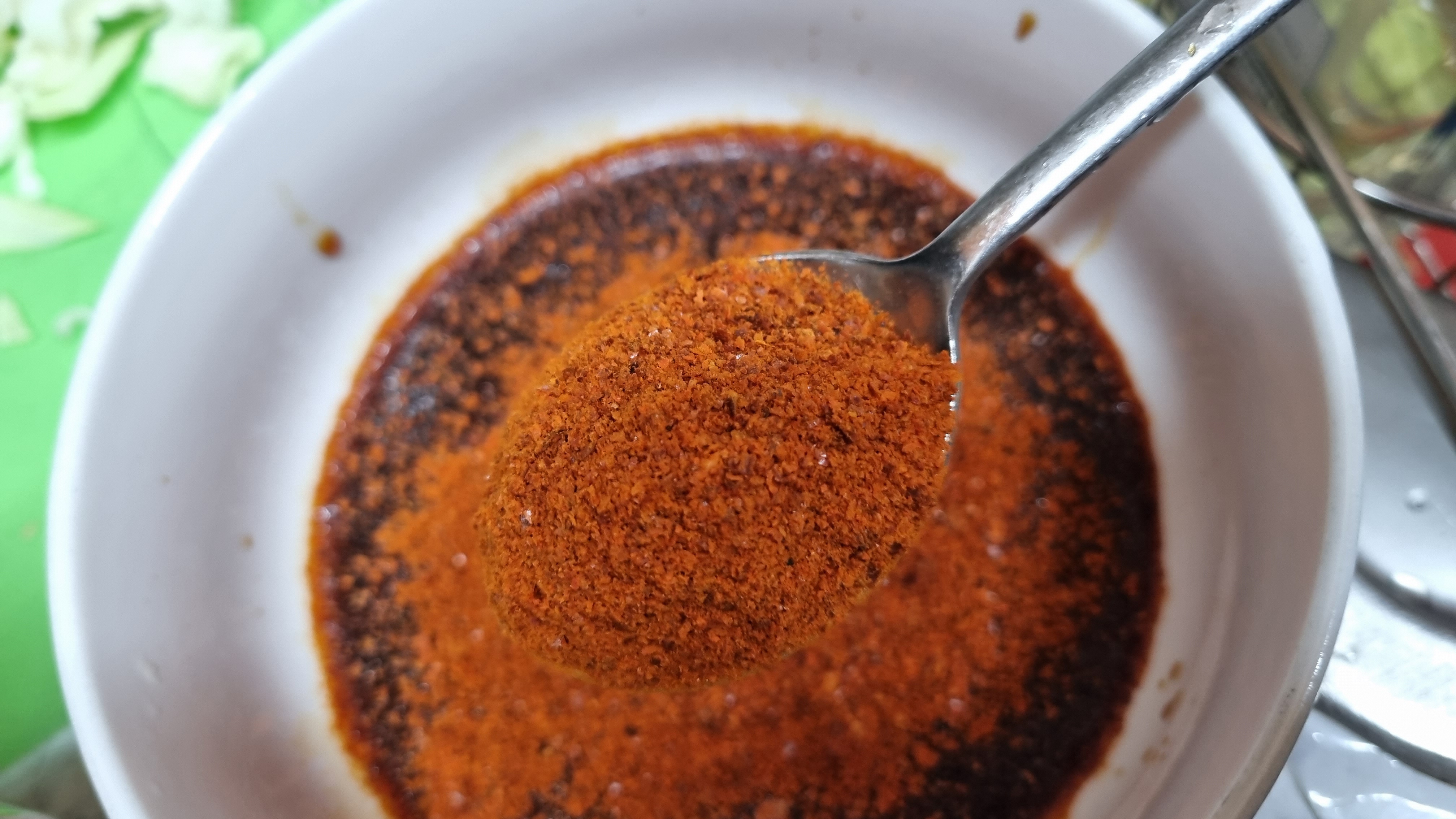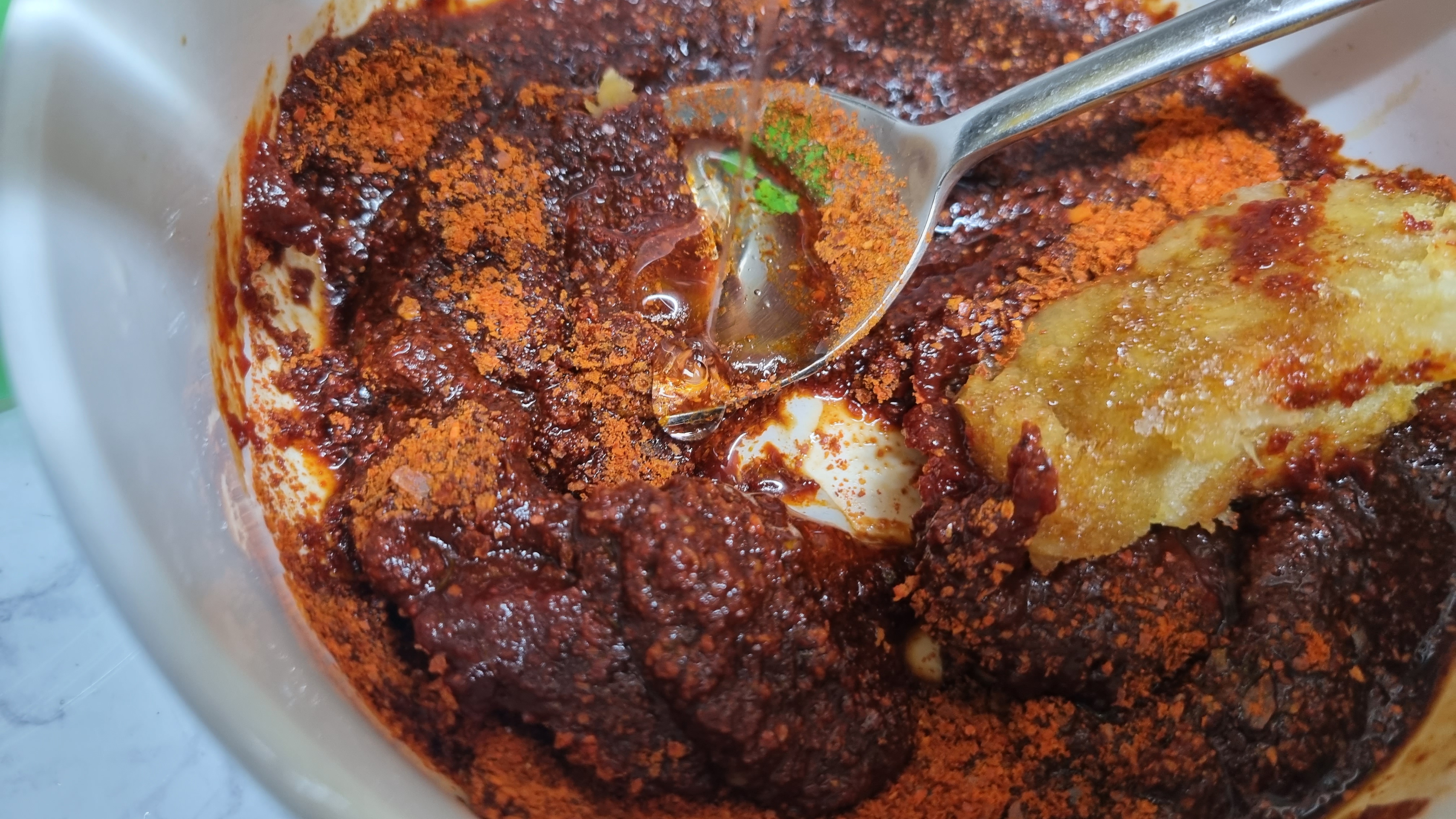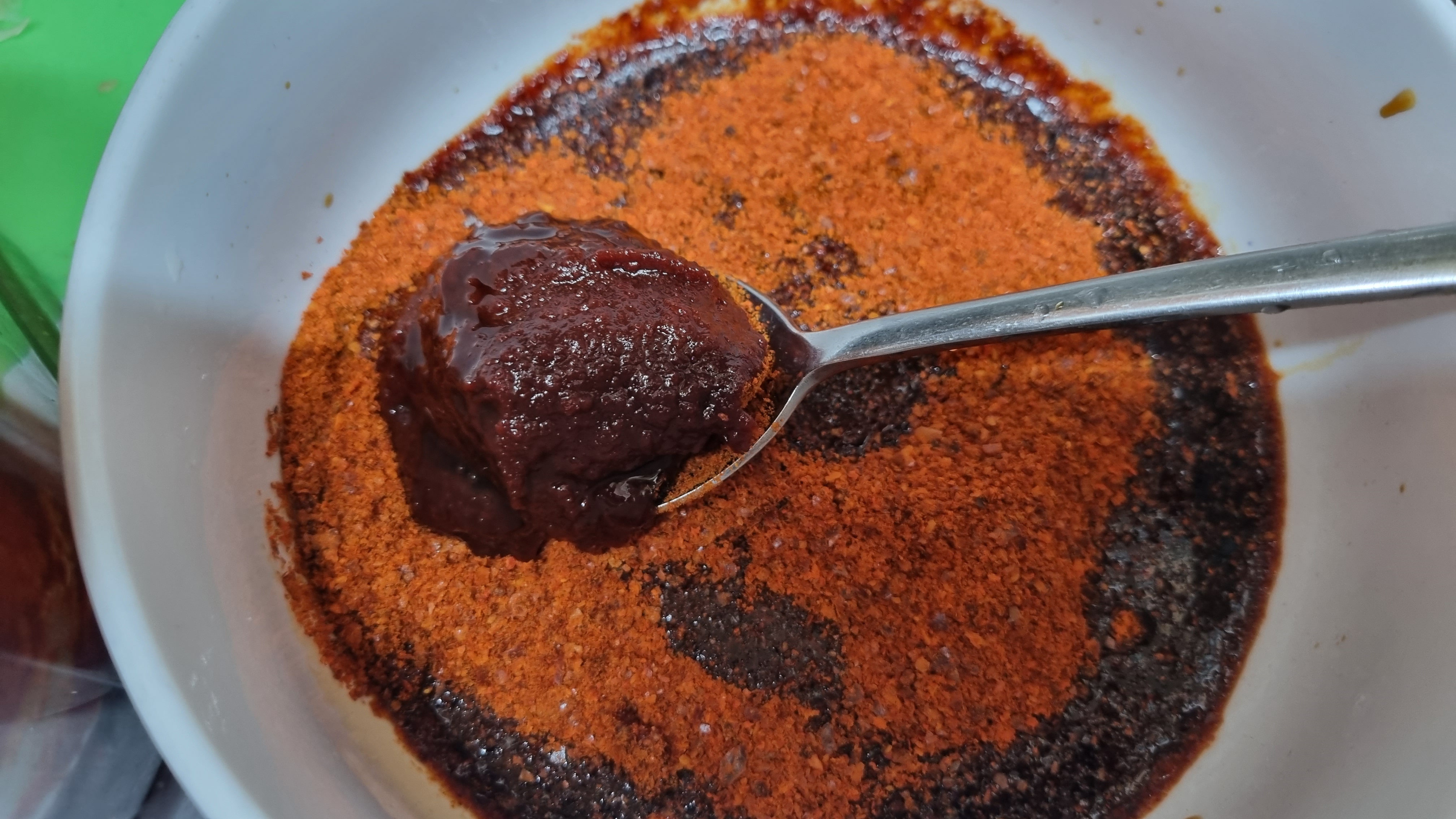 이어서 준비한 양념장을 고르게 뿌려주고 잘 혼합하여 줍니다. 이때 물을 조금 넣는데 물의 양은 맥주컵 기준 반컵정도만 넣으면 충분하는데 최대로 넣어도 한 컵이상 넣으면 안 됩니다.