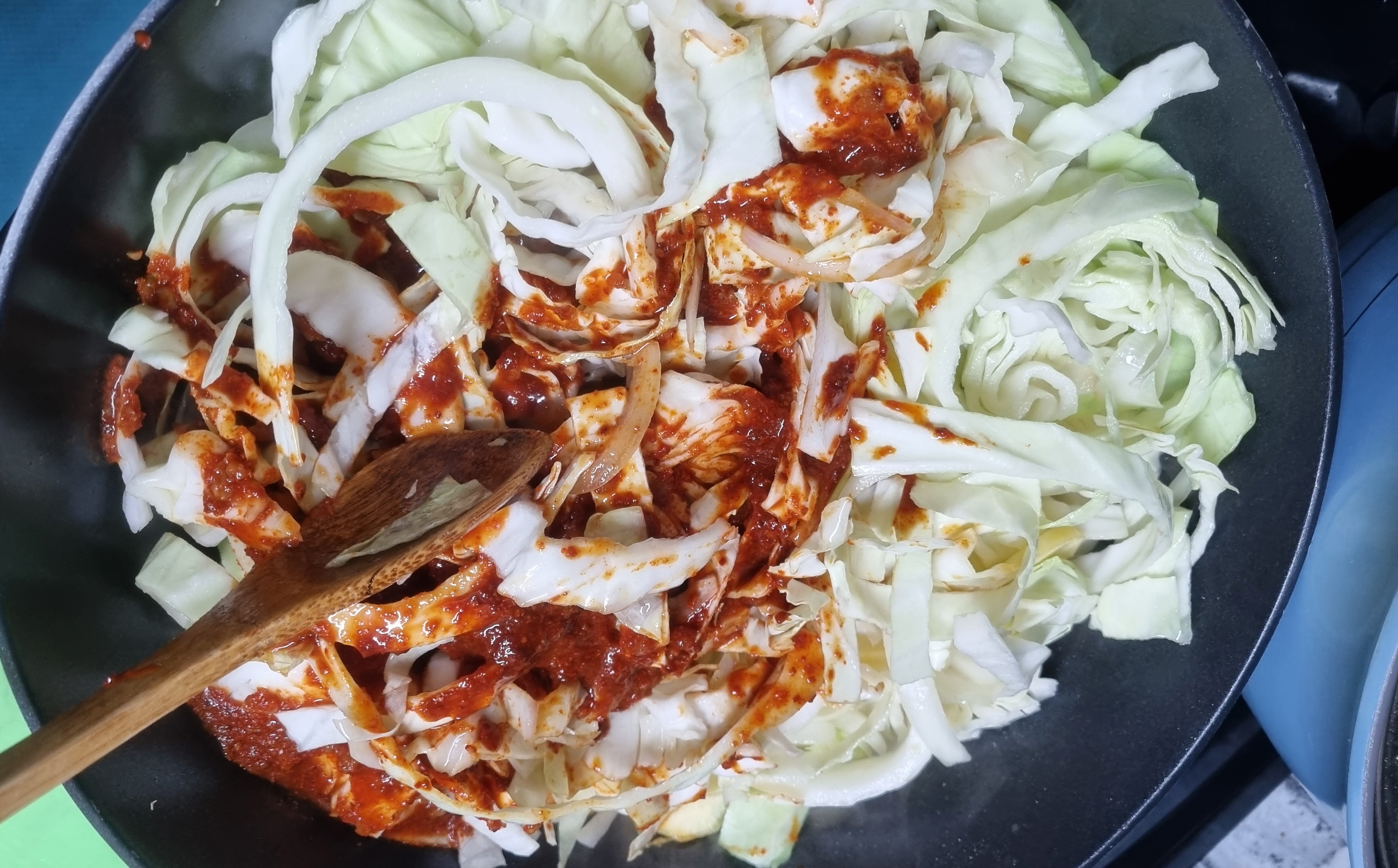 물을 조금만 넣어도 양배추에서 물을 많이 빠져나와 국물이 어느 정도 형성되므로 불필요하게 물을 많이 넣지 않아야 합니다.