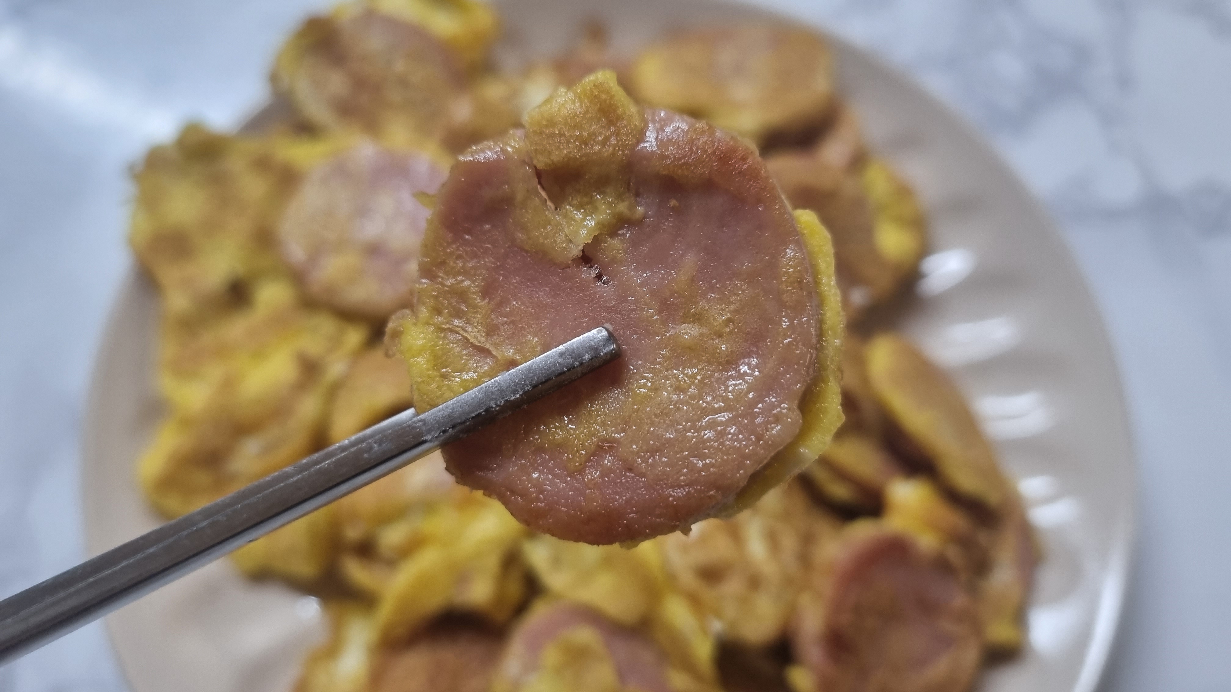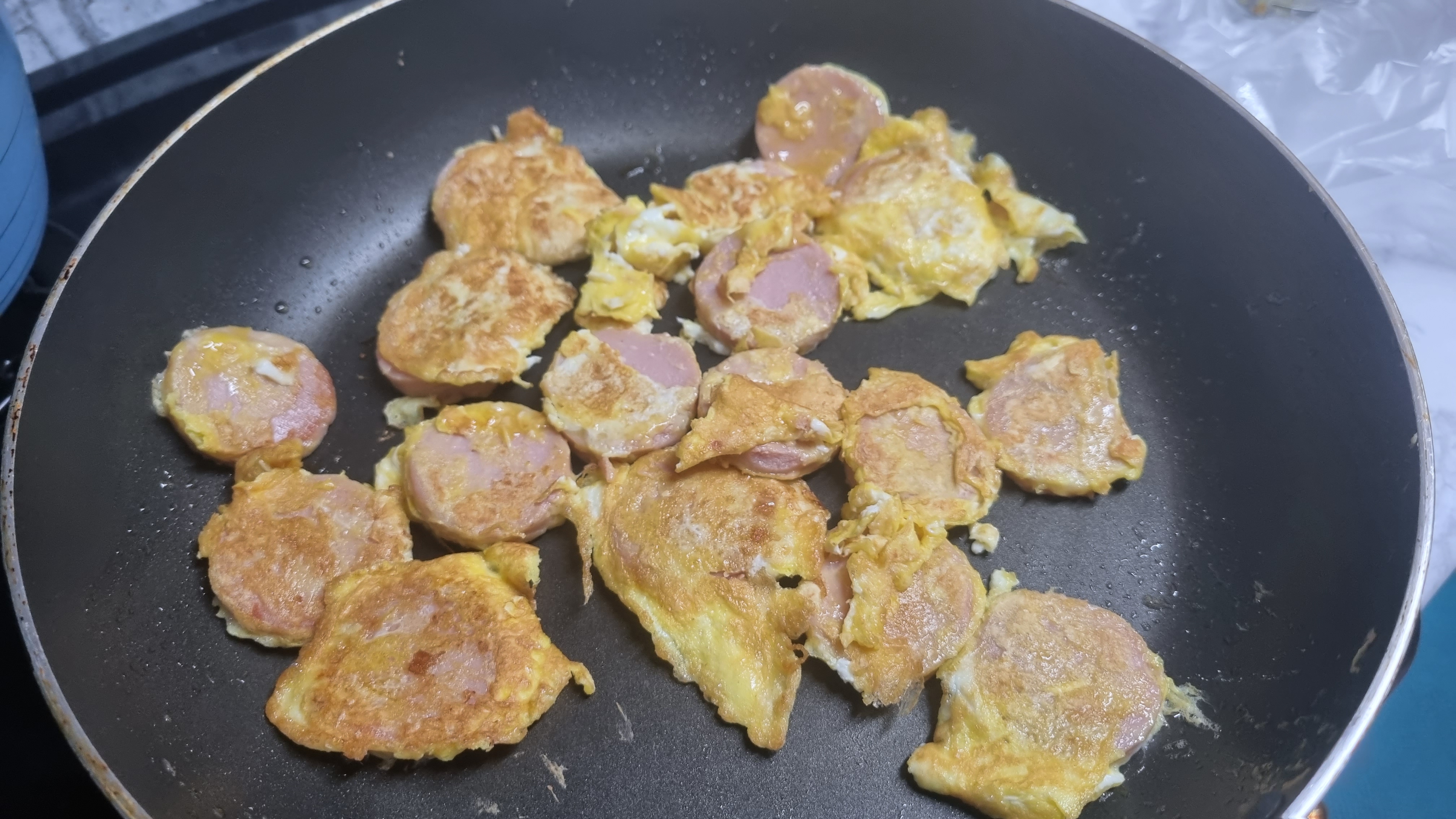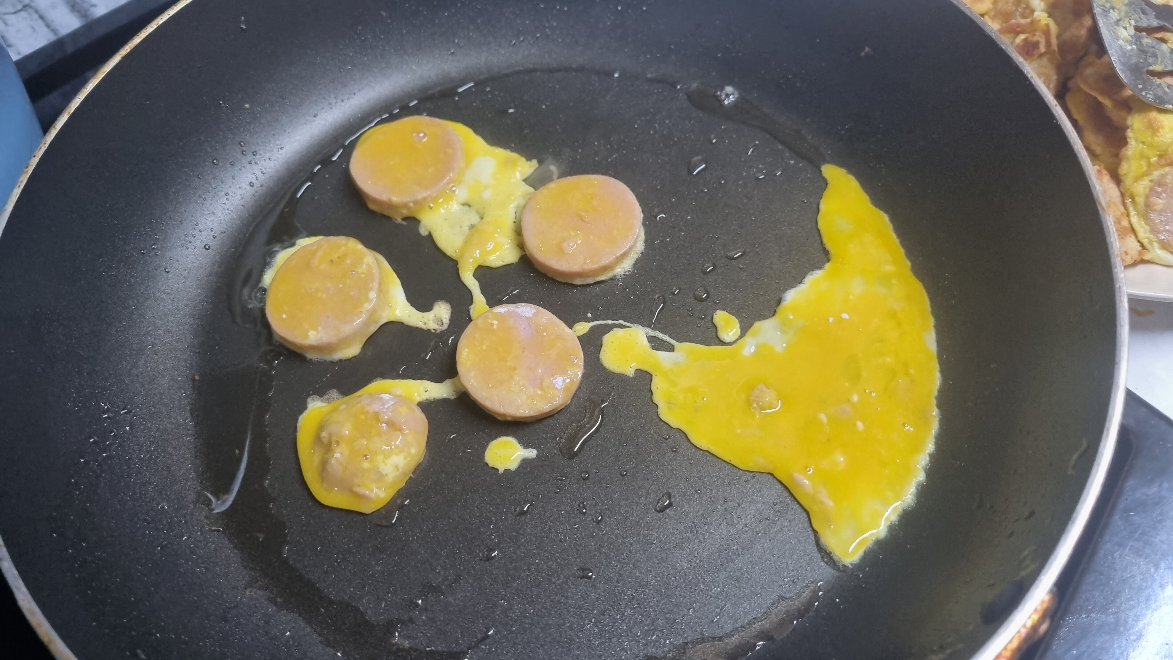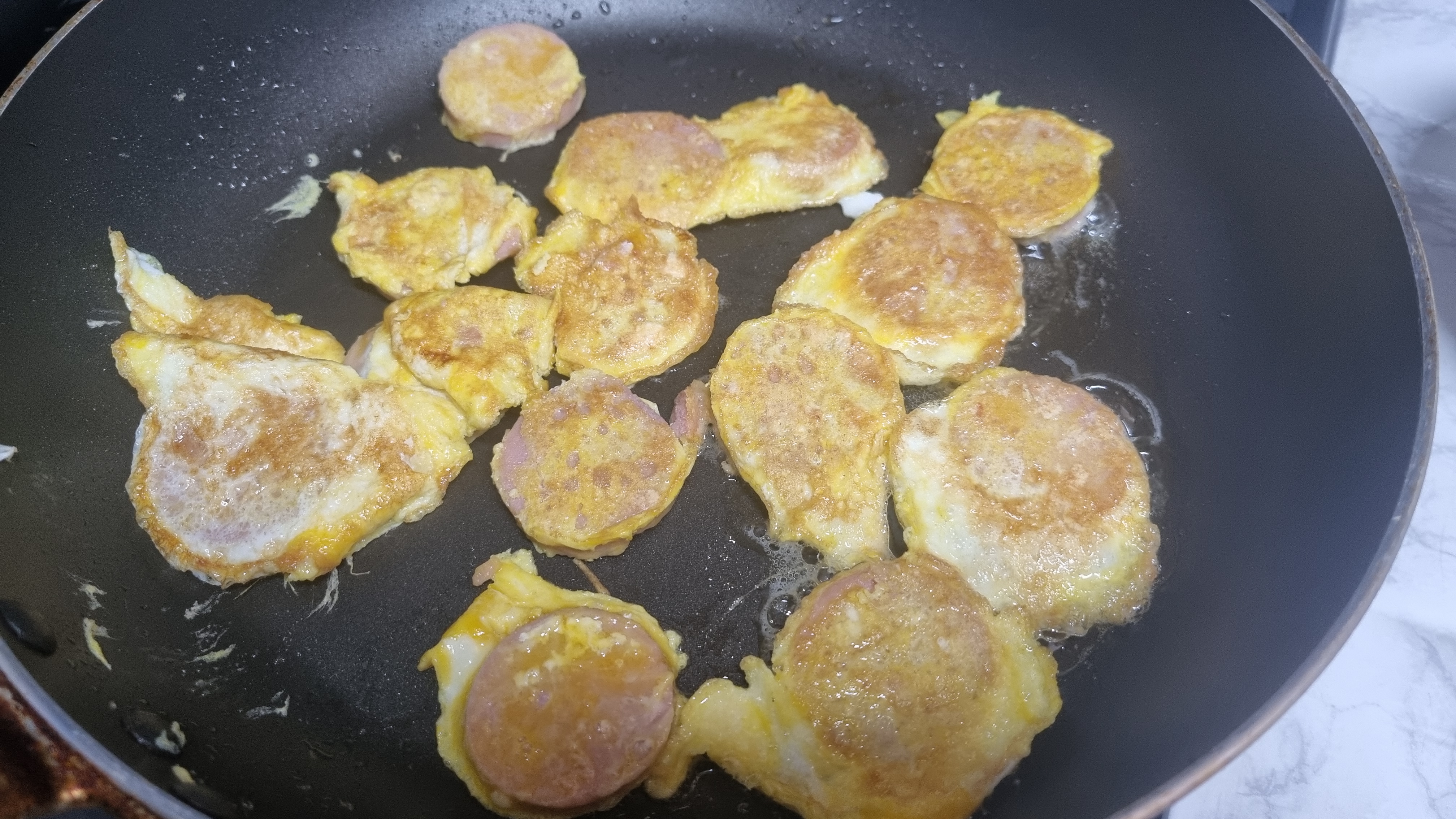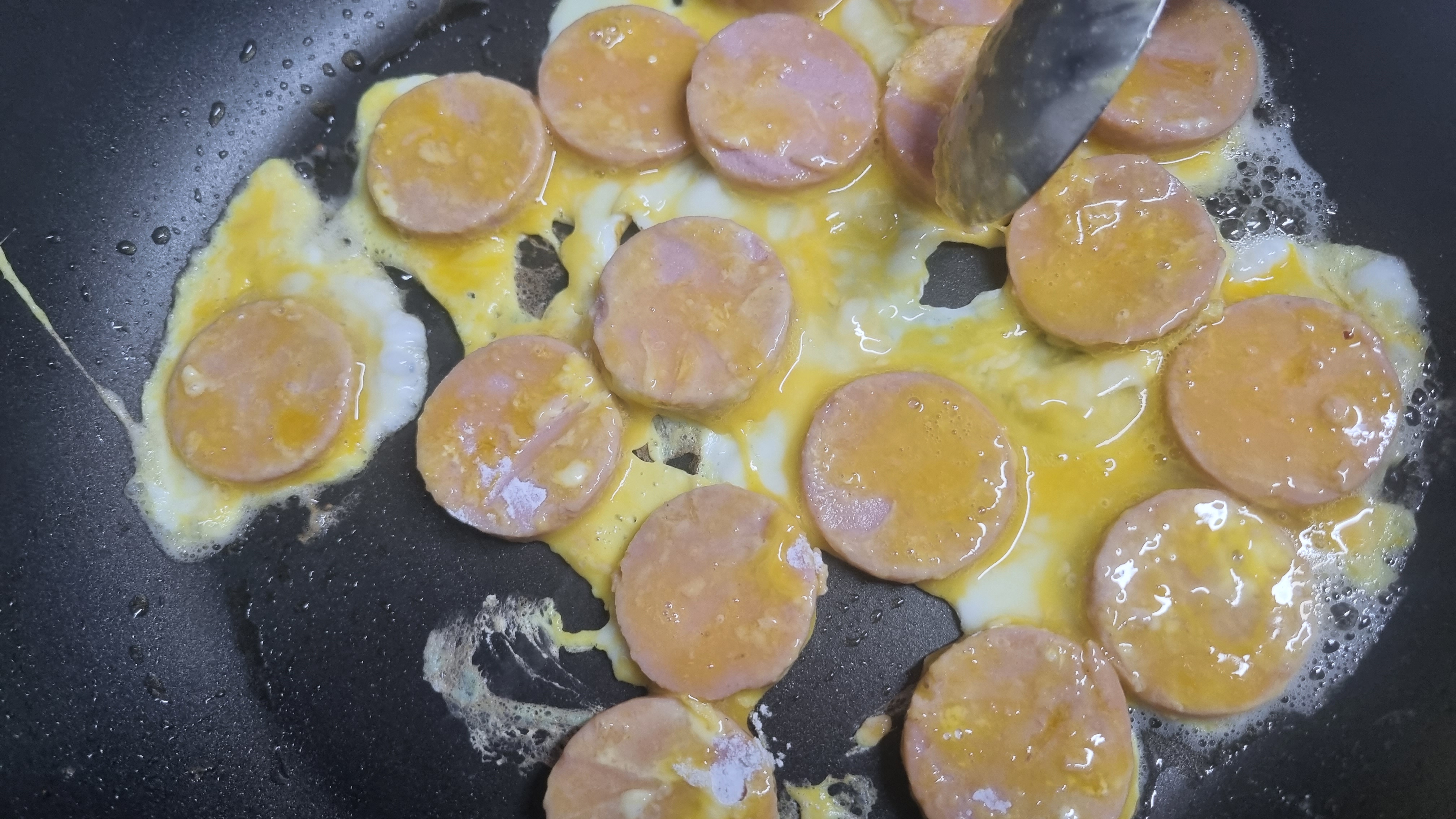소시지를 프라이팬에 올리고 1~2분 후 바로 뒤집어주고 또 1~2분이 지나면 맛있는 계란부침 소시지가 됩니다. 사실 동그랑땡이나 소시지 계란부침은 똑같습니다.