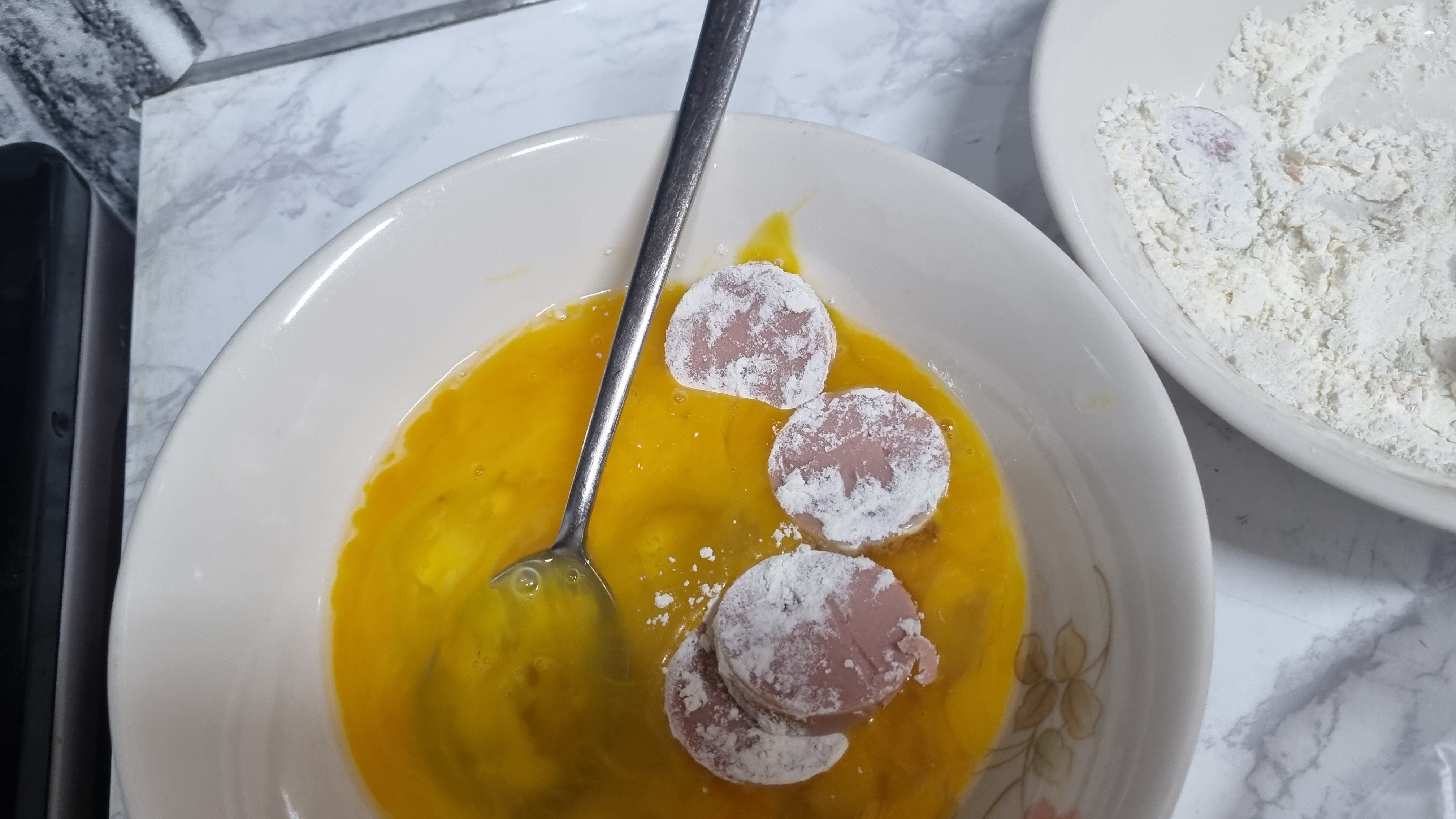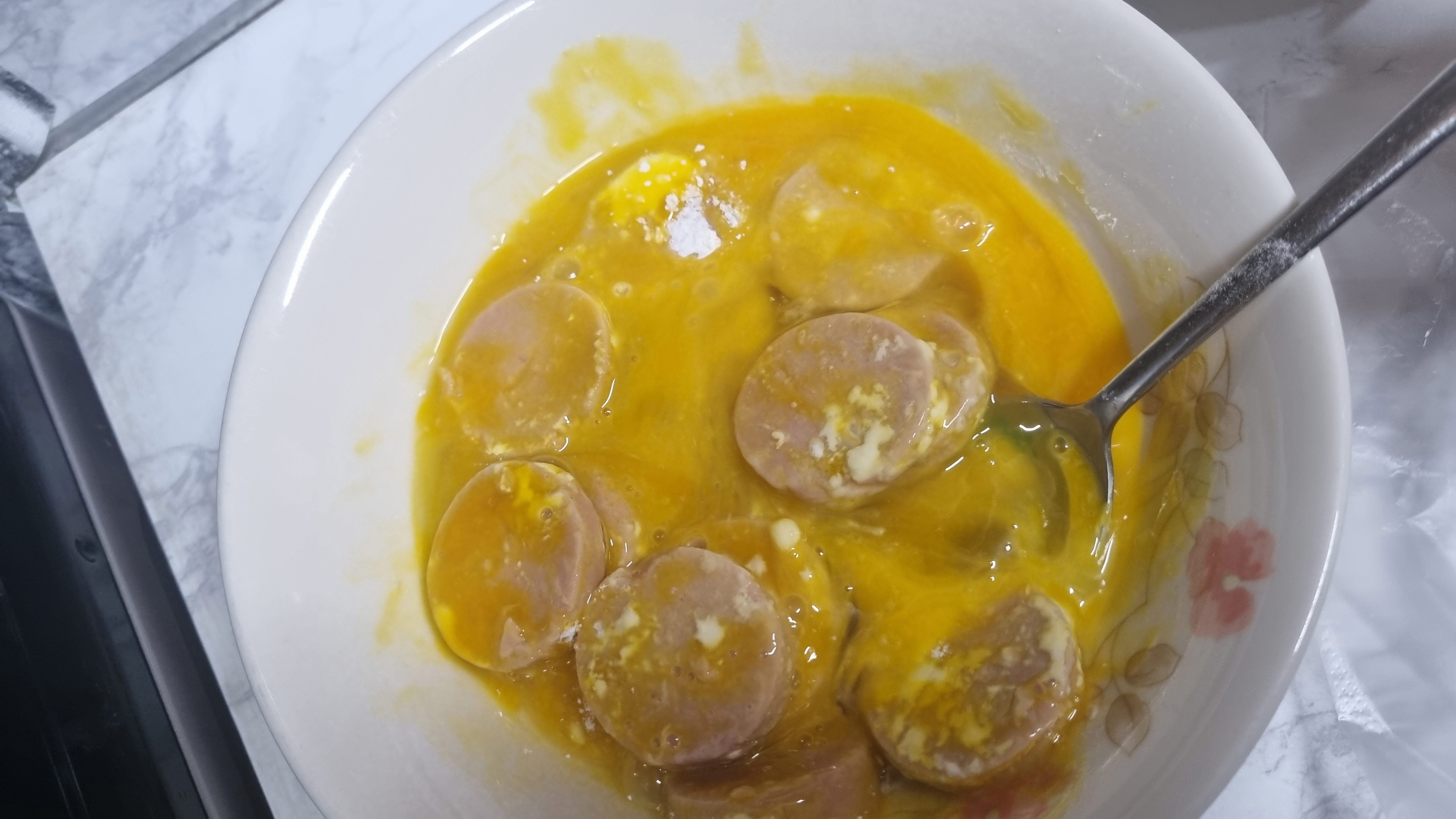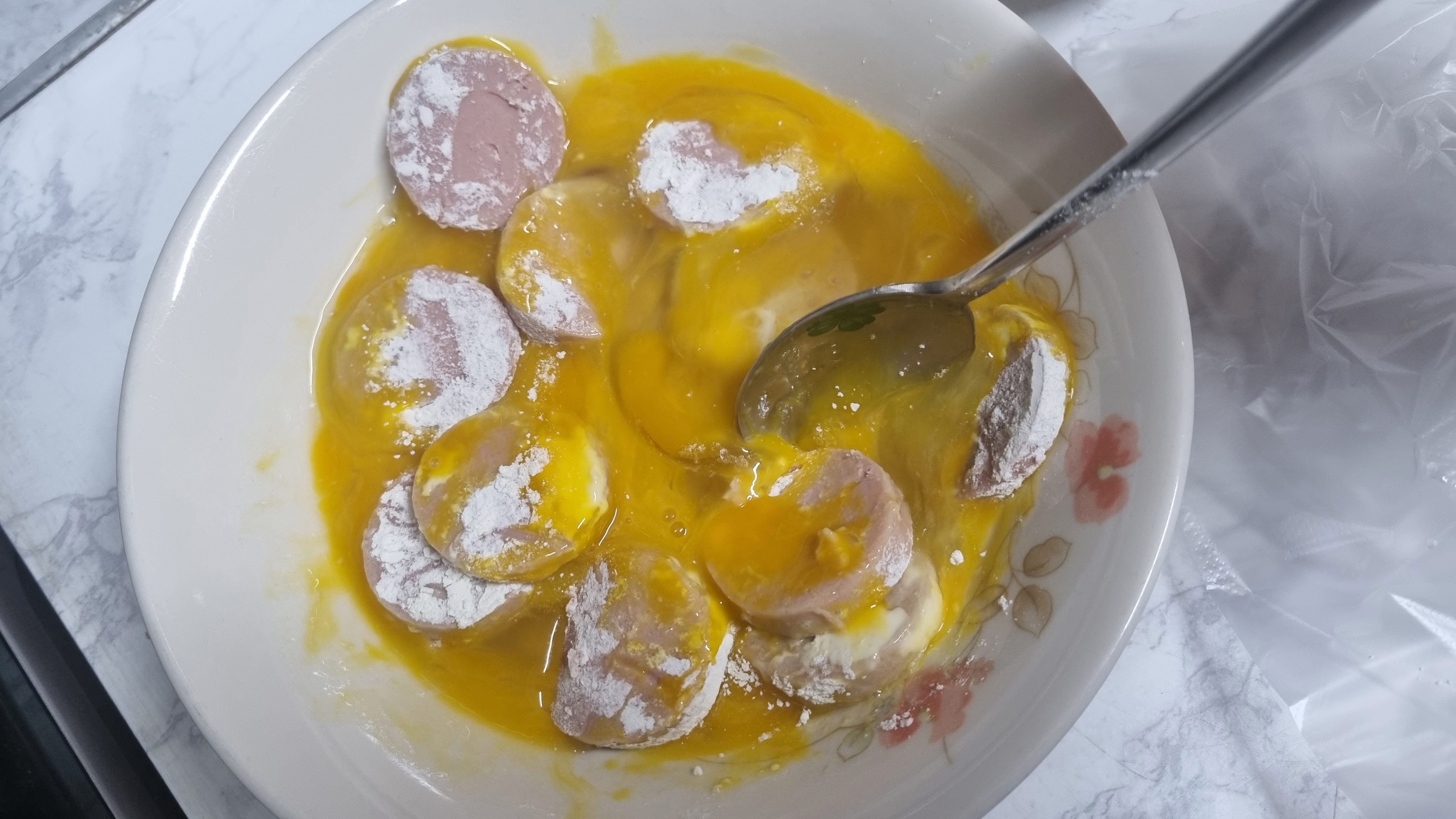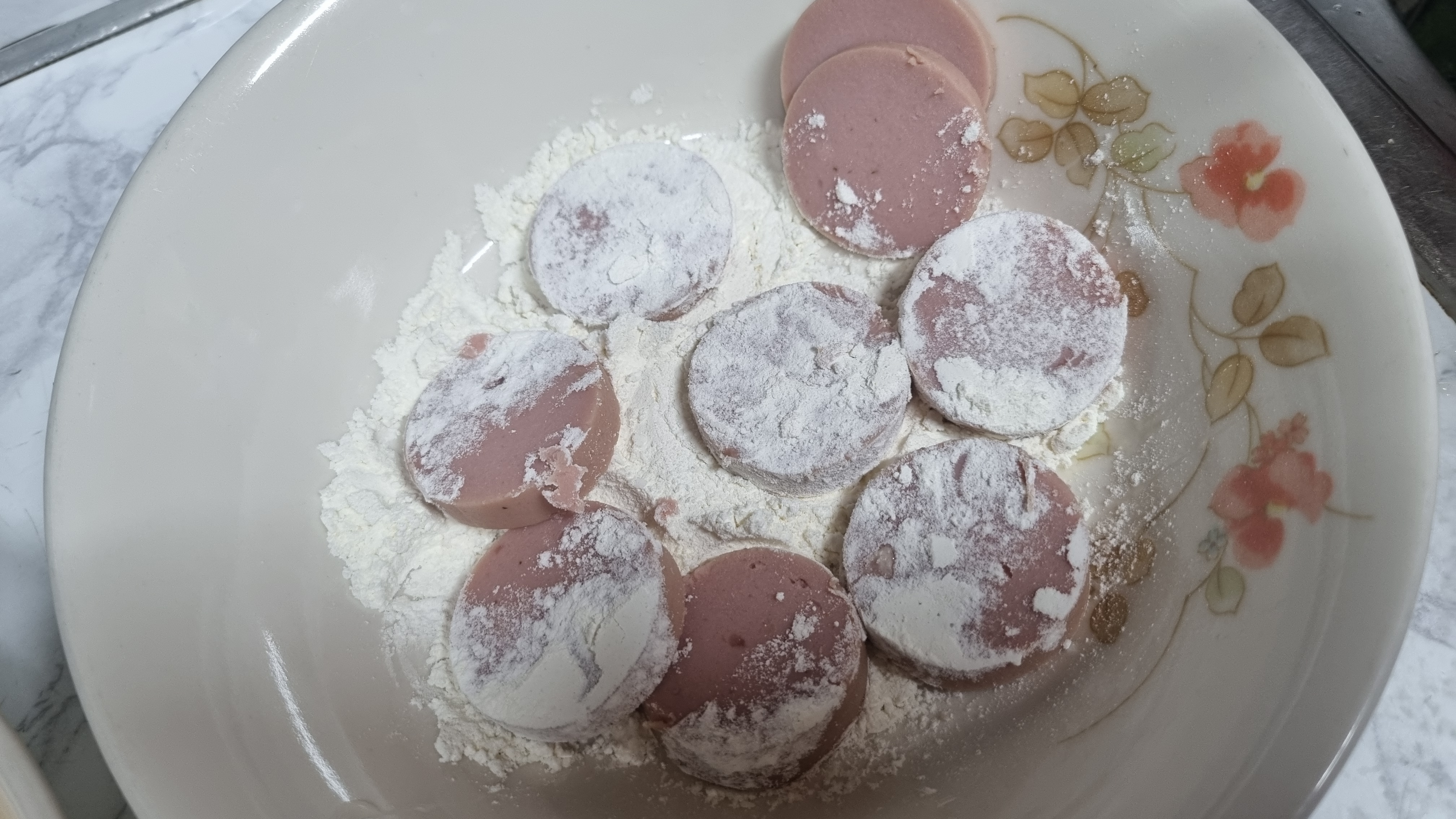 먼저 부침가루에 소시지를 골고루 묻혀서 계란반죽에 넣어 다시 계란이 골고루 묻힐 수 있도록 섞어 주면 됩니다.