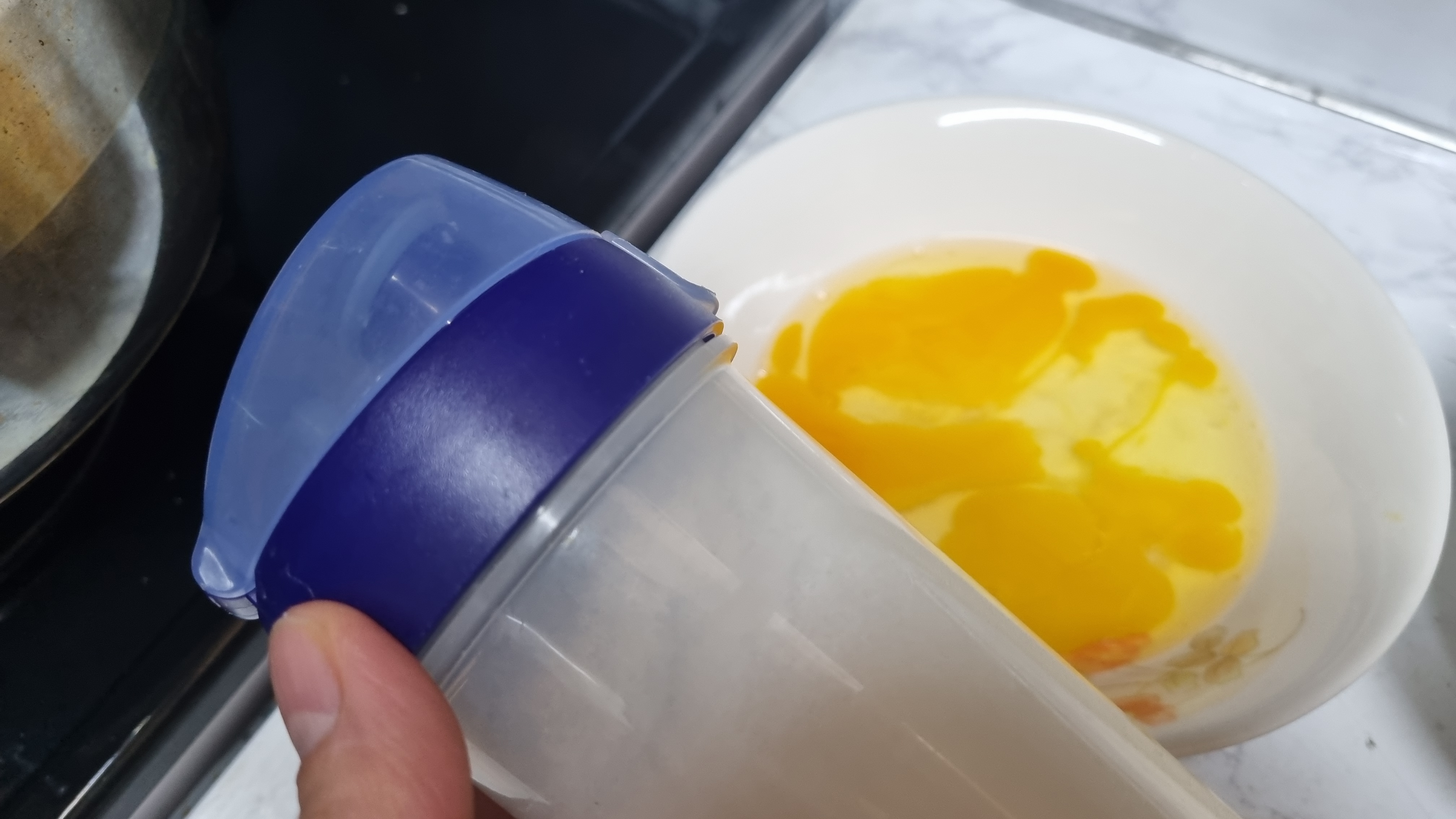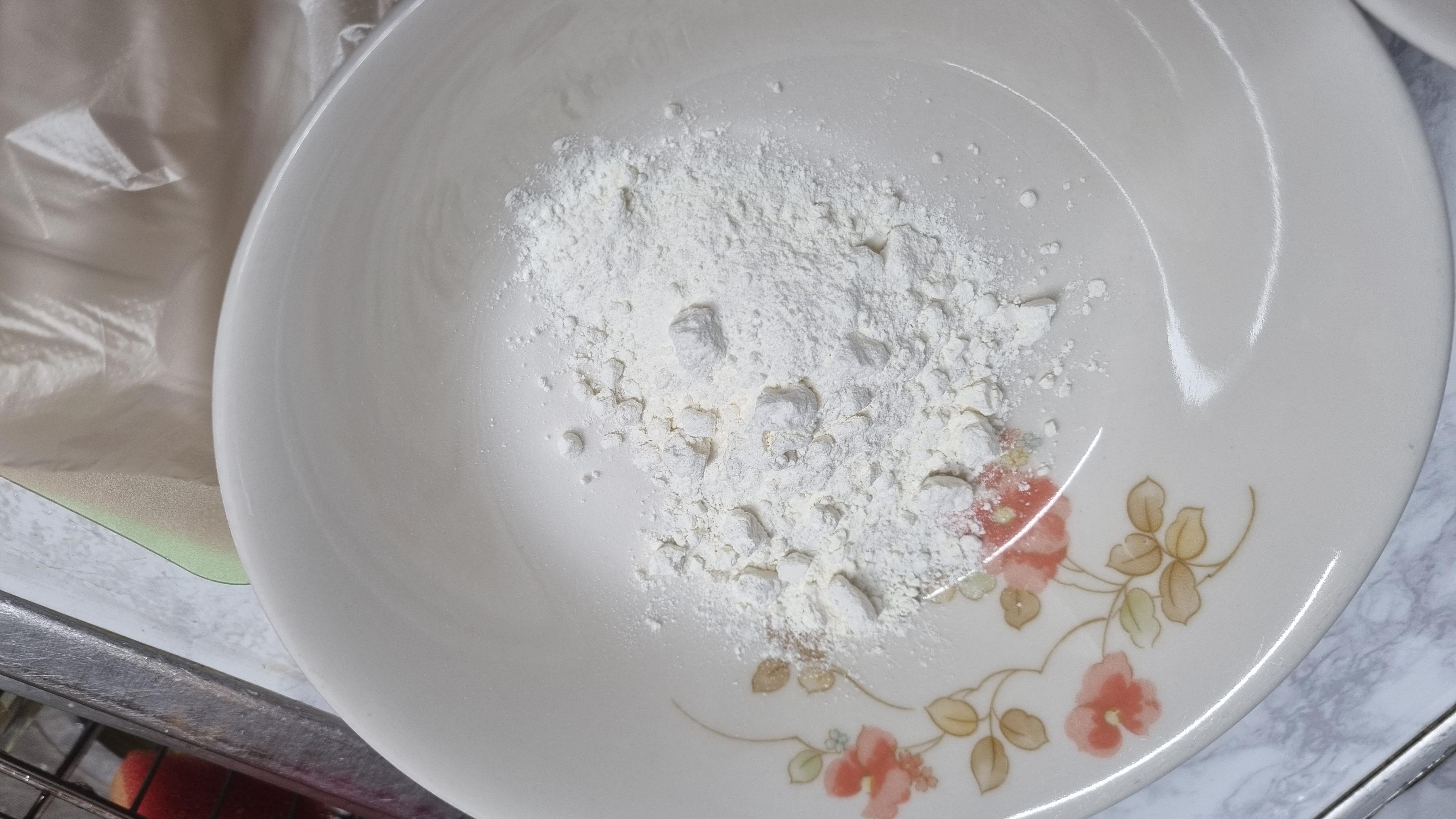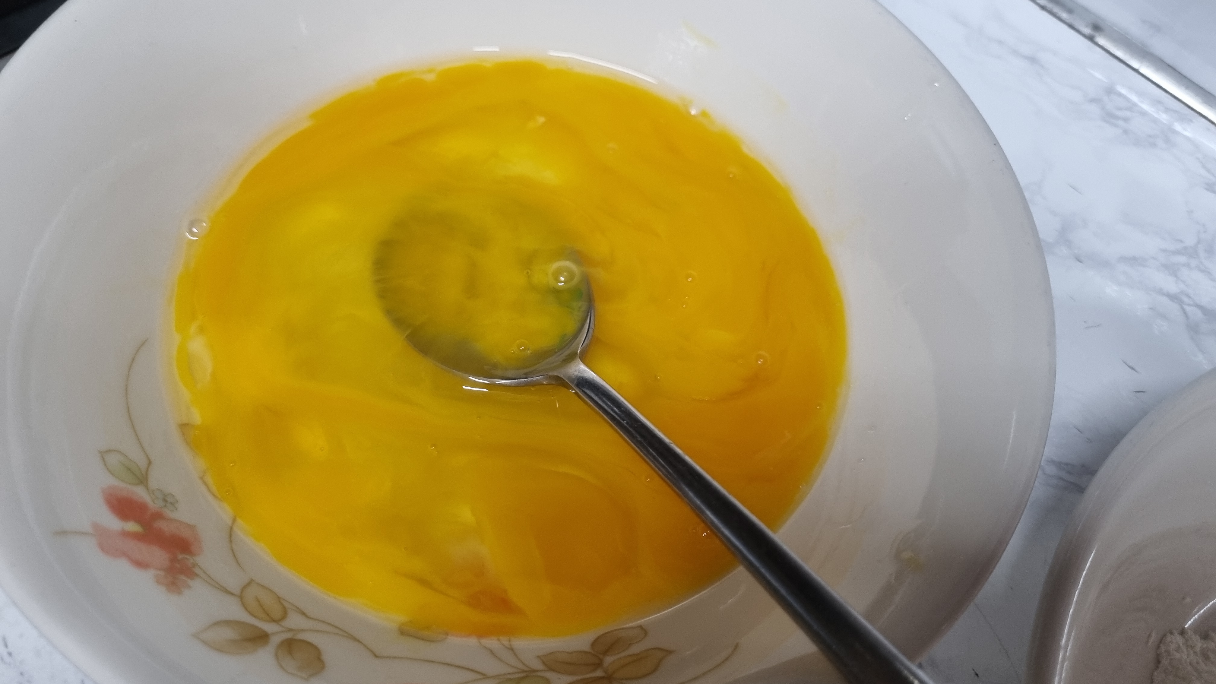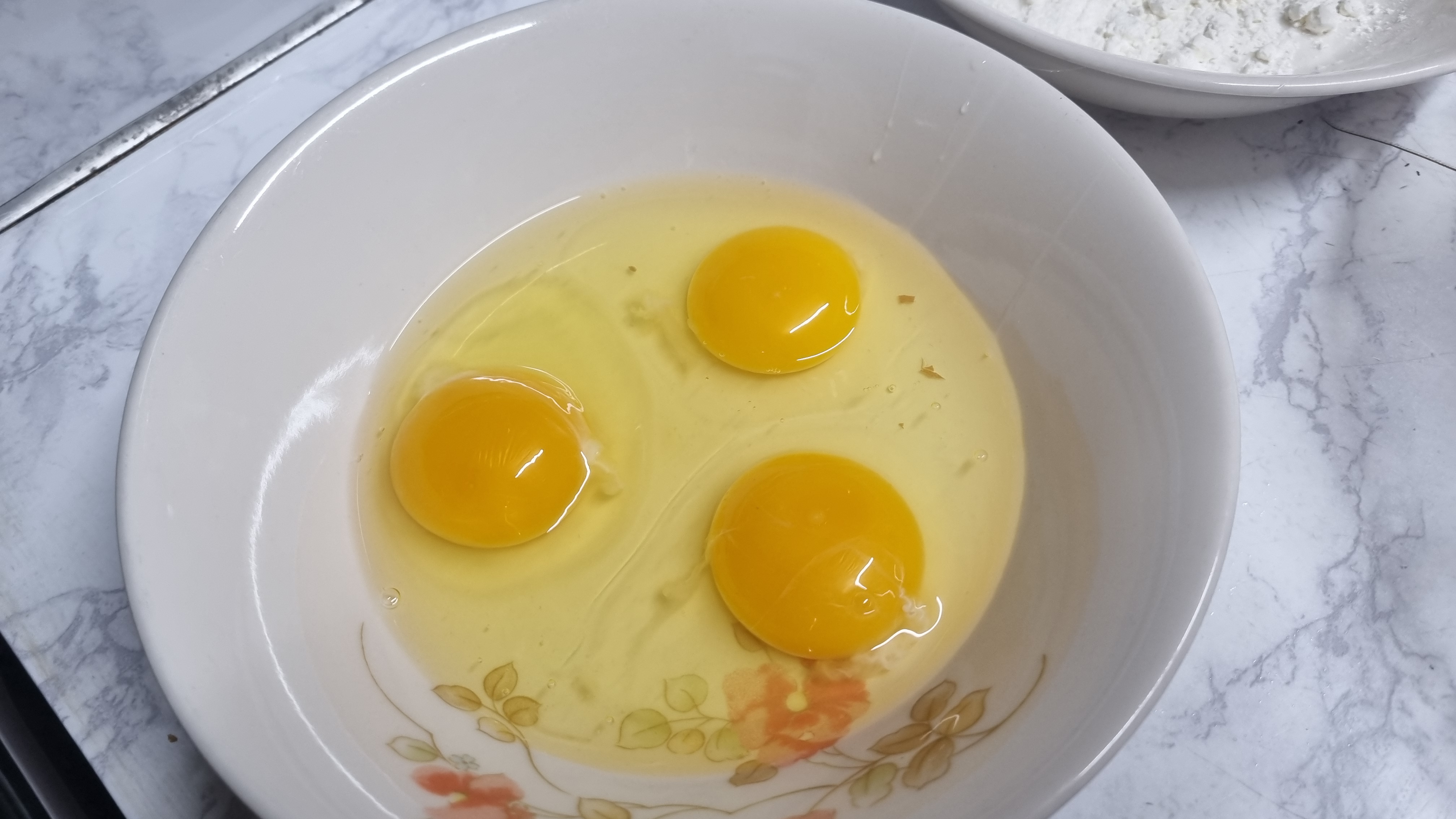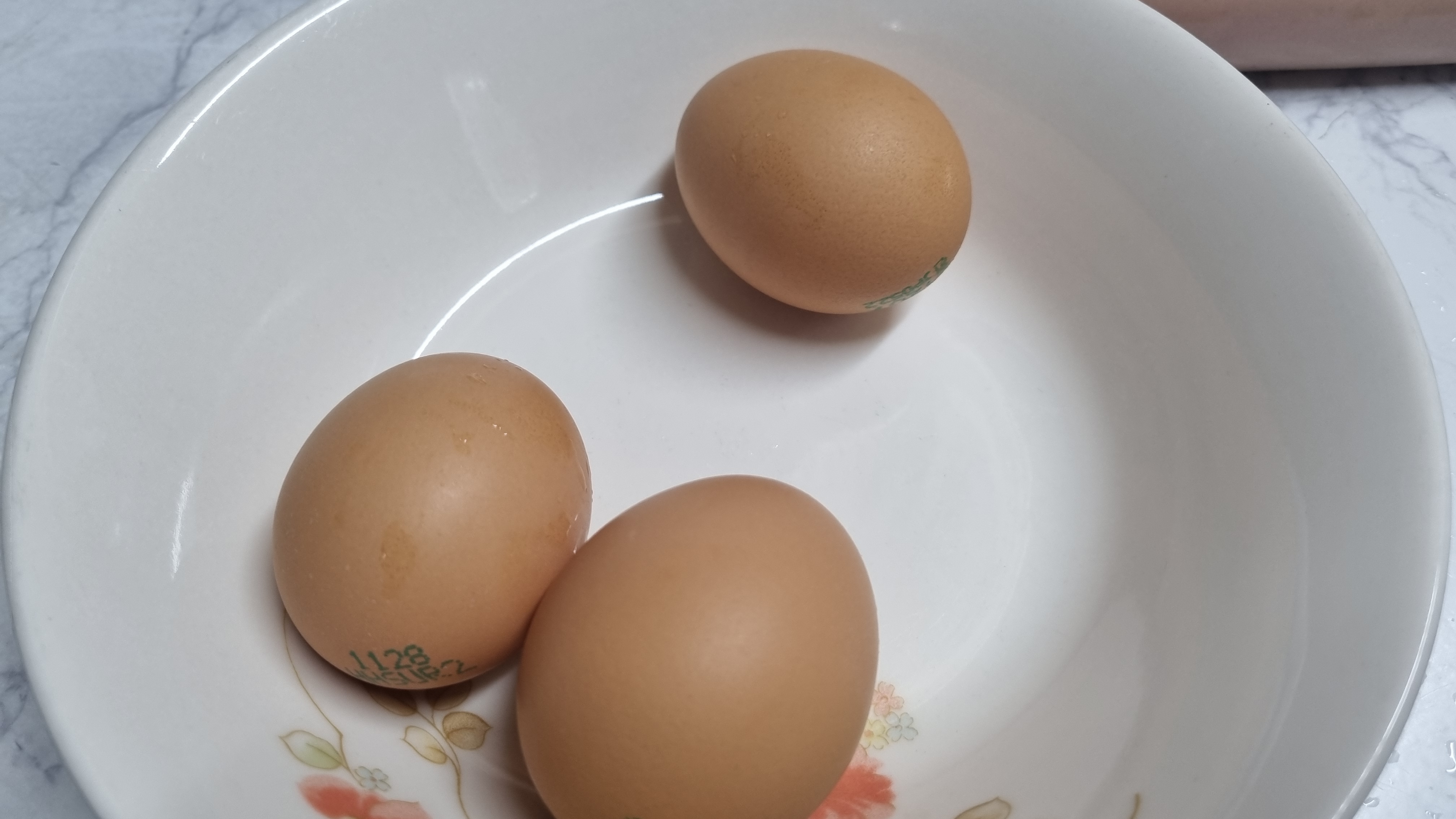 이어서 그릇에 계란 3개를 깨서 넣어 섞어주고 일반 접시에 부침가루를 조금 담아 준비를 합니다.