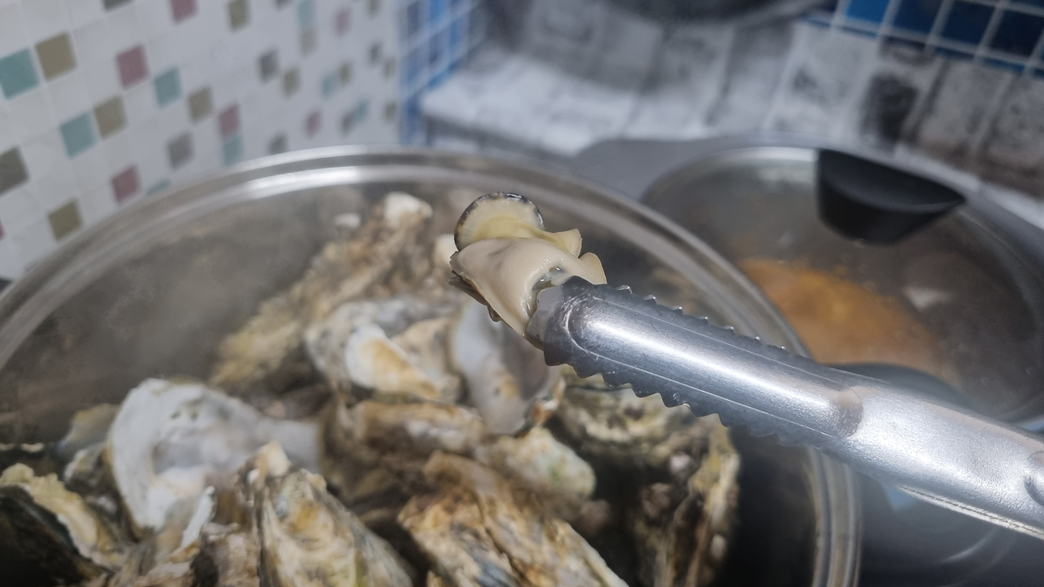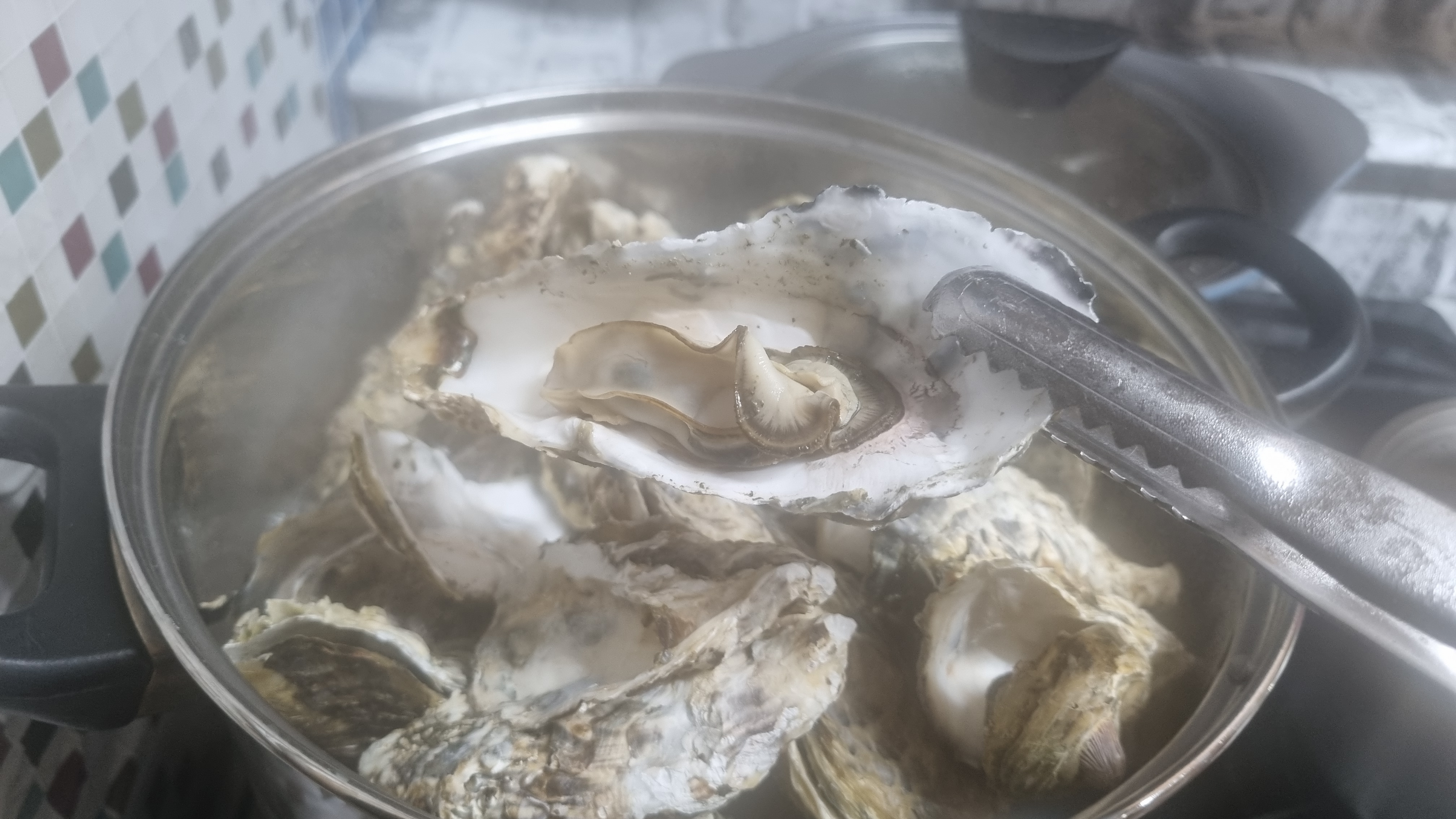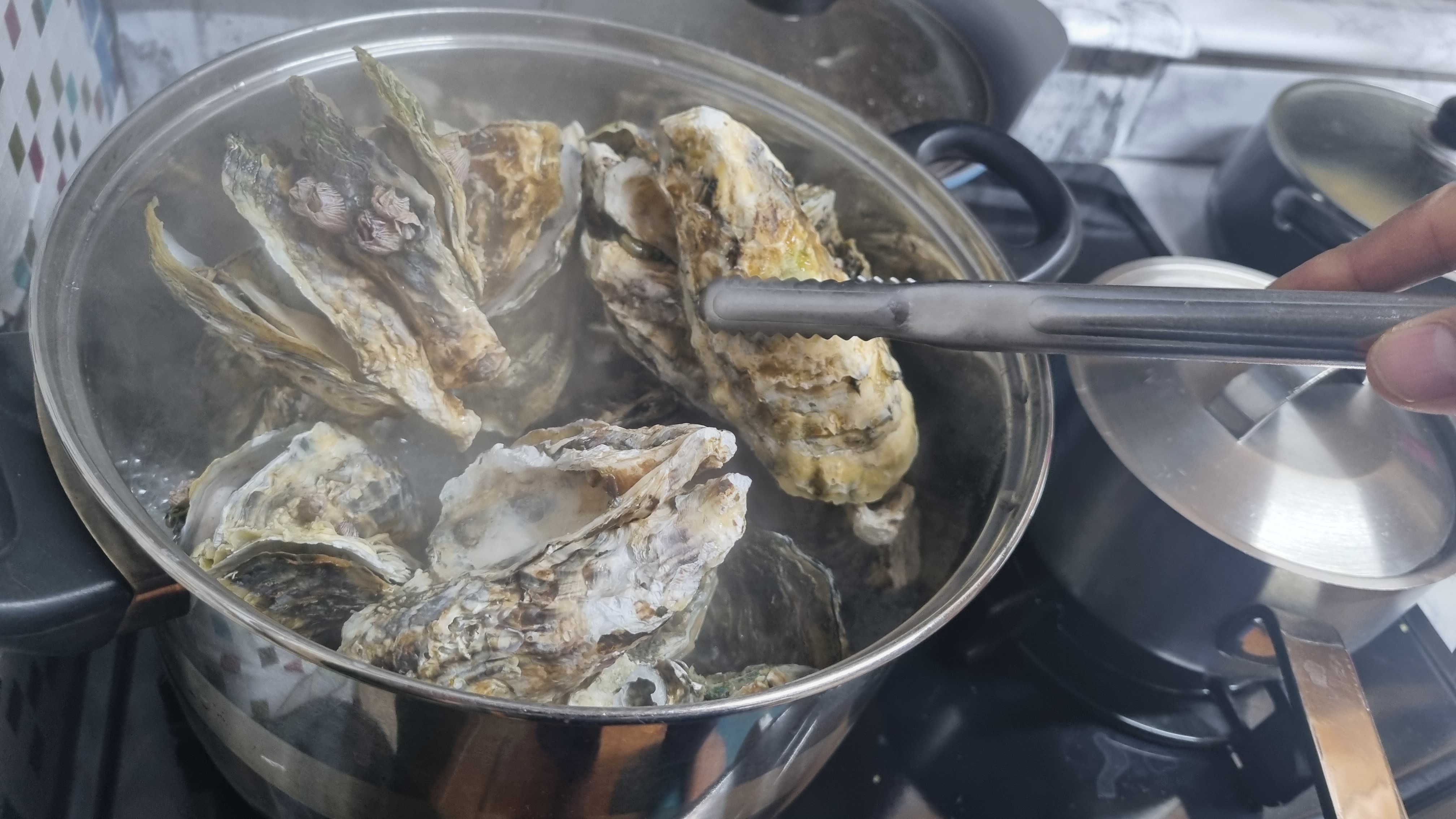 끓은 지 10분이 지나면 뚜껑을 열면 껍질이 벌어진 굴들이 많으면 어느 정도 삶아졌다는 것인데 이때 한두 개 굴을 까서 먹어보아 잘 삶아졌으면 가스레인지 불을 꺼도 됩니다.