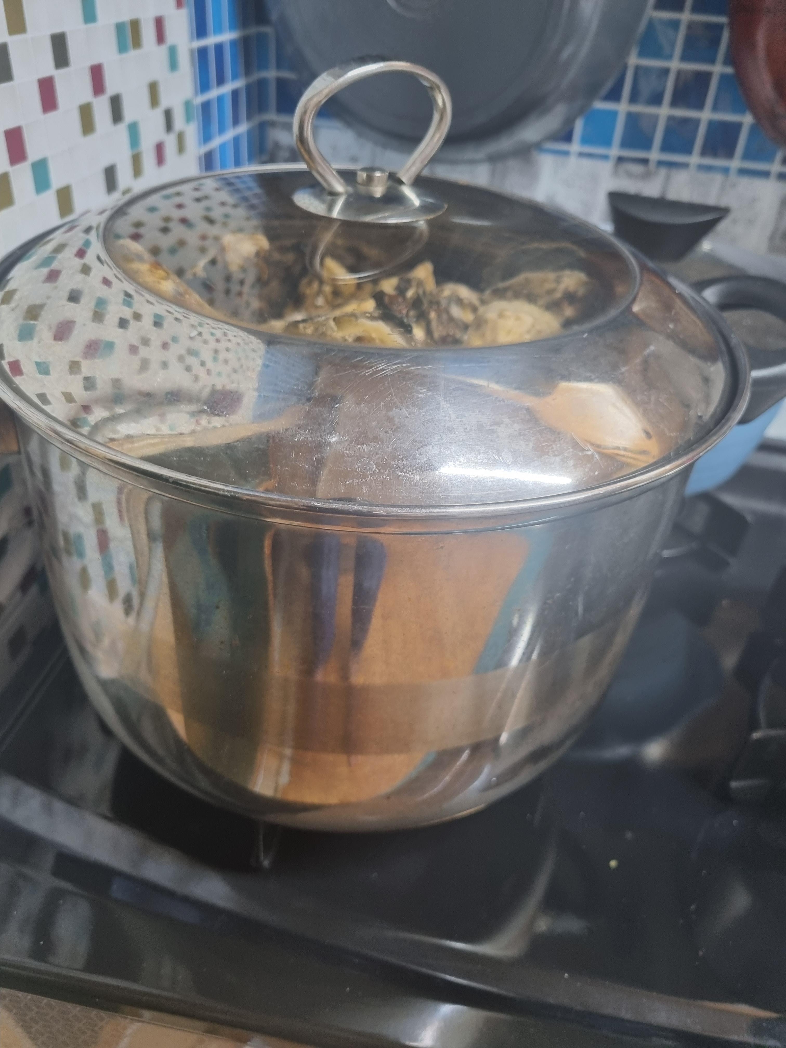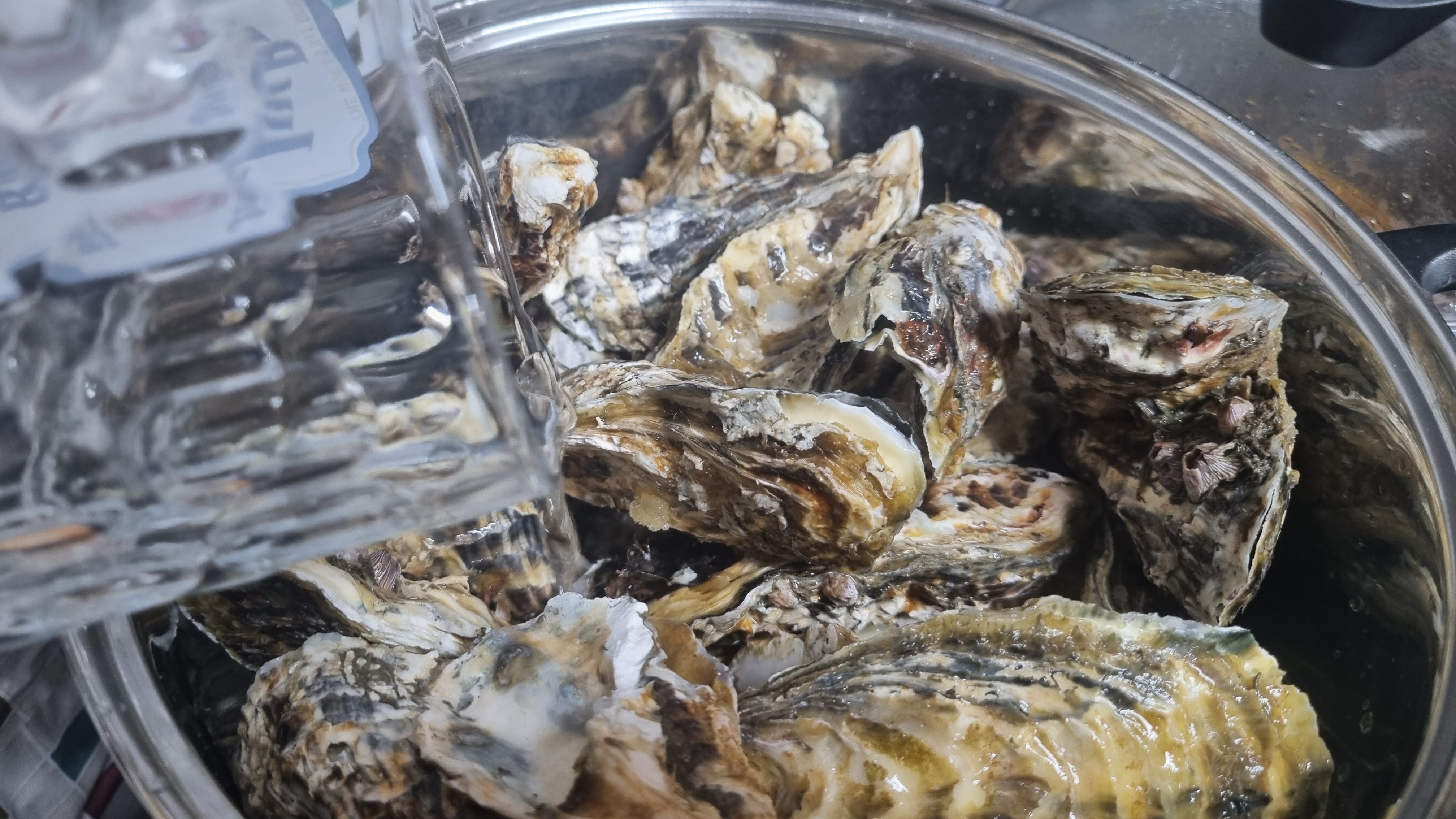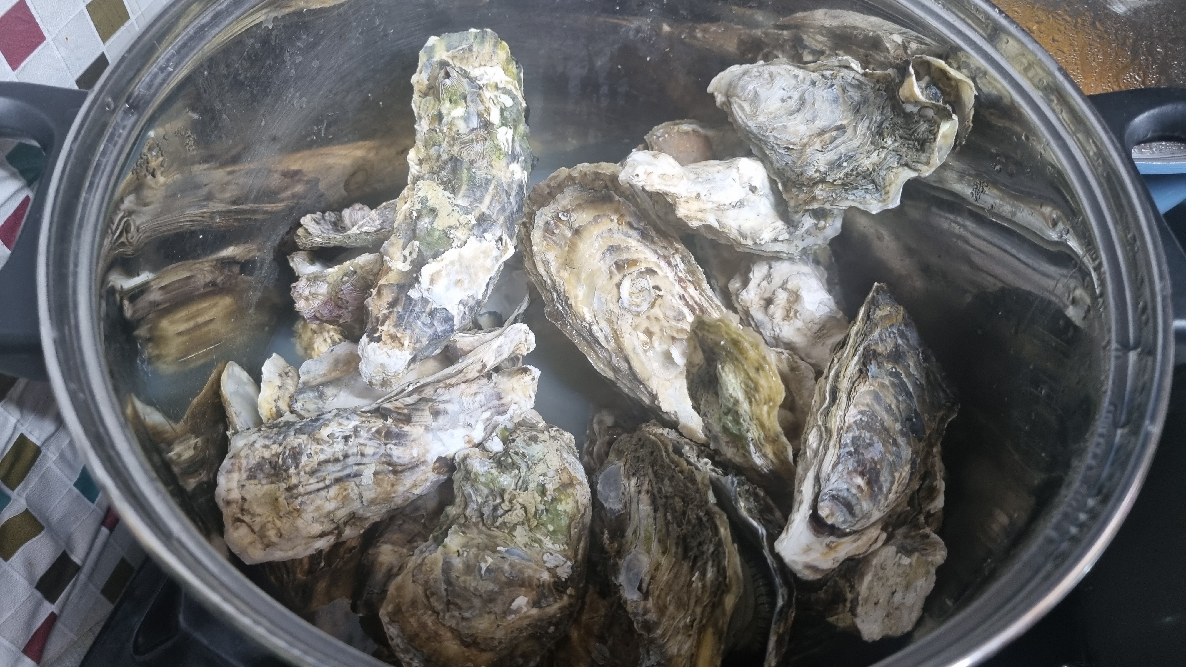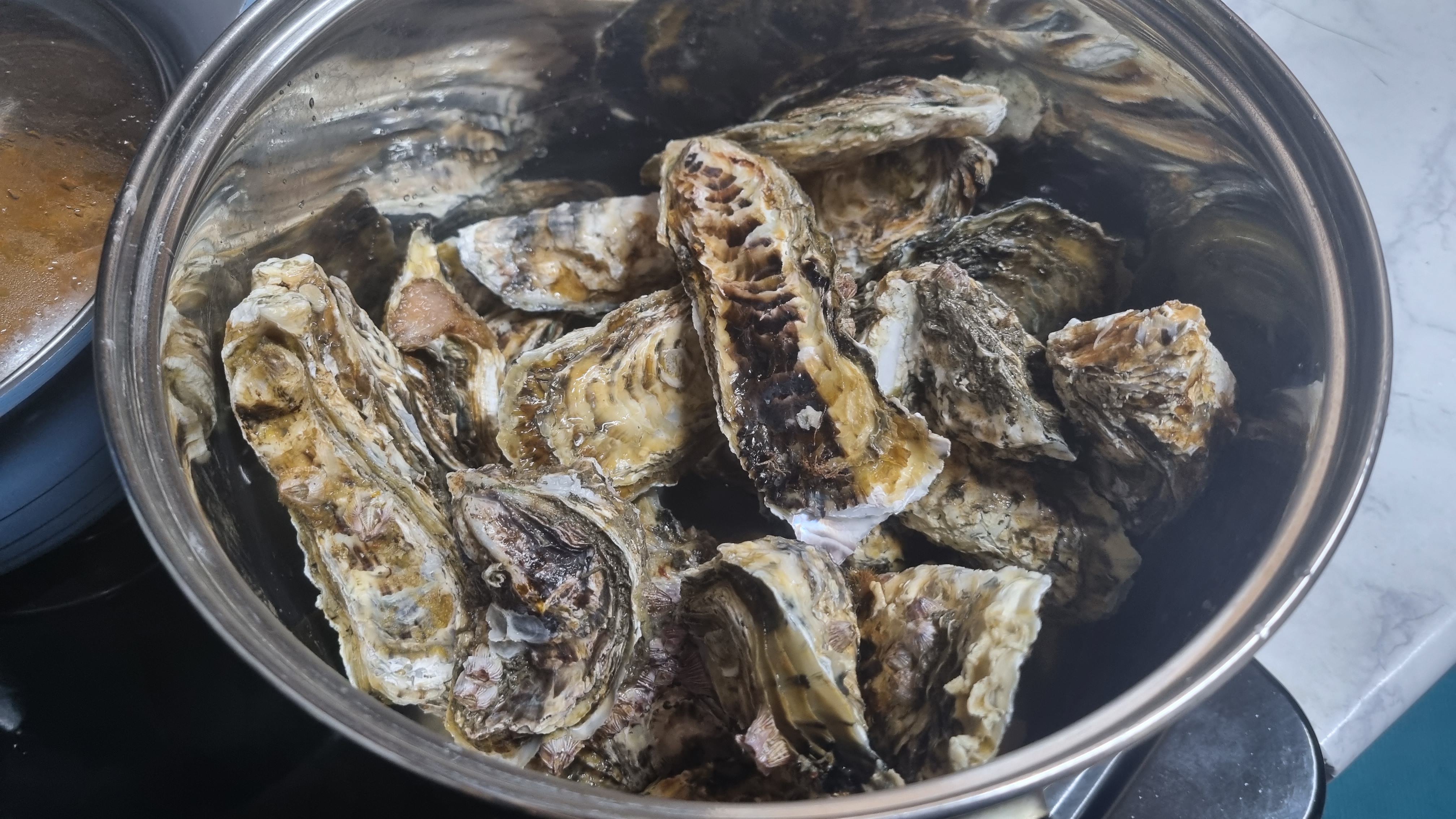 끓은 지 10분이 지나면 뚜껑을 열면 껍질이 벌어진 굴들이 많으면 어느 정도 삶아졌다는 것인데 이때 한두 개 굴을 까서 먹어보아 잘 삶아졌으면 가스레인지 불을 꺼도 됩니다.
