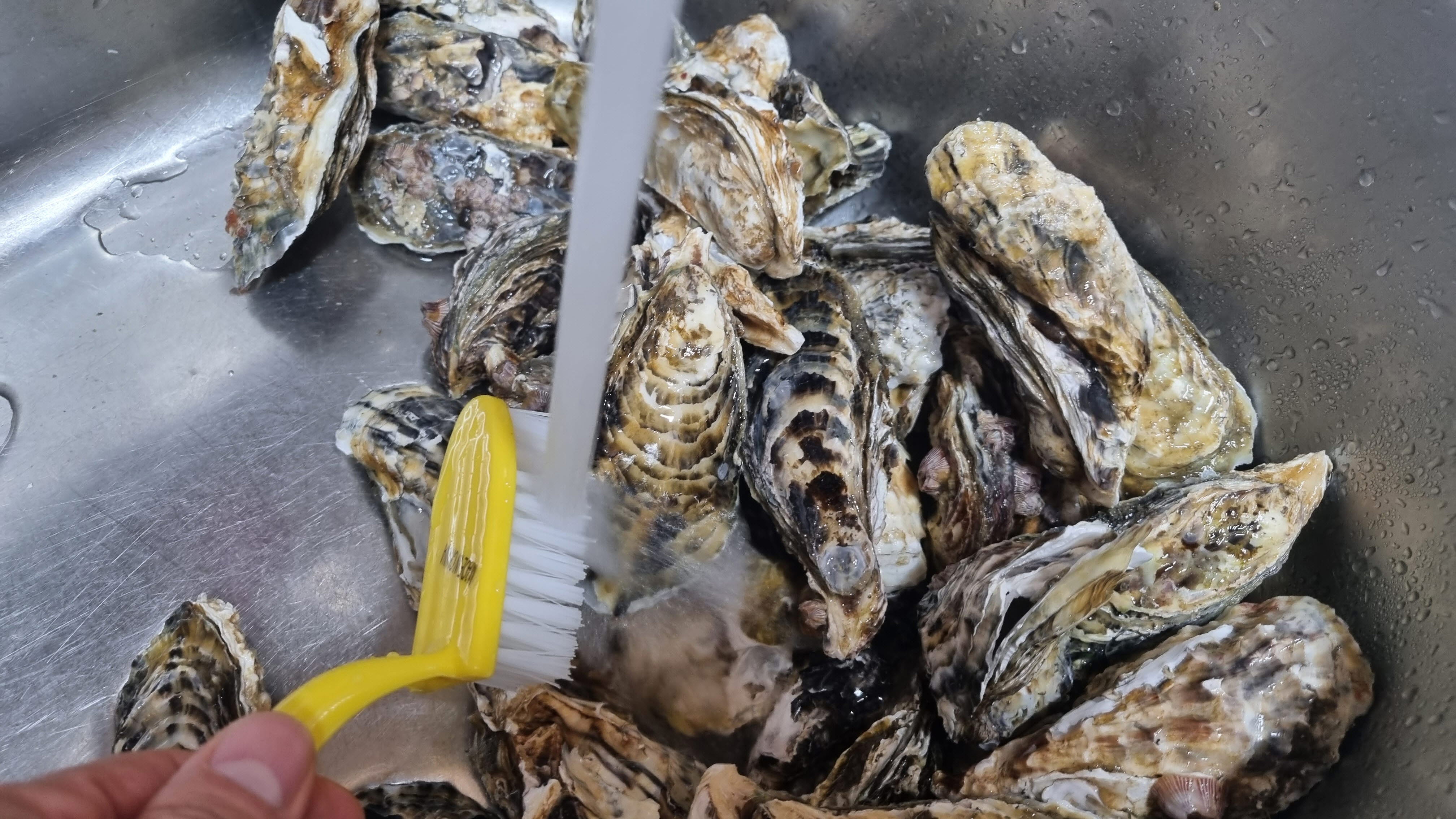기본적으로 씻어서 판매하지만 그래도 집에서 삶아 먹기 위해서는 다시 한번 씻어야 합니다. 굴껍데기에 워낙 많은 굴 쪼가리들이나 뻘이 조금씩 묻어 있기 때문에 흐르는 수돗물에 솔을 이용하여 가볍게 닦아주면 됩니다.