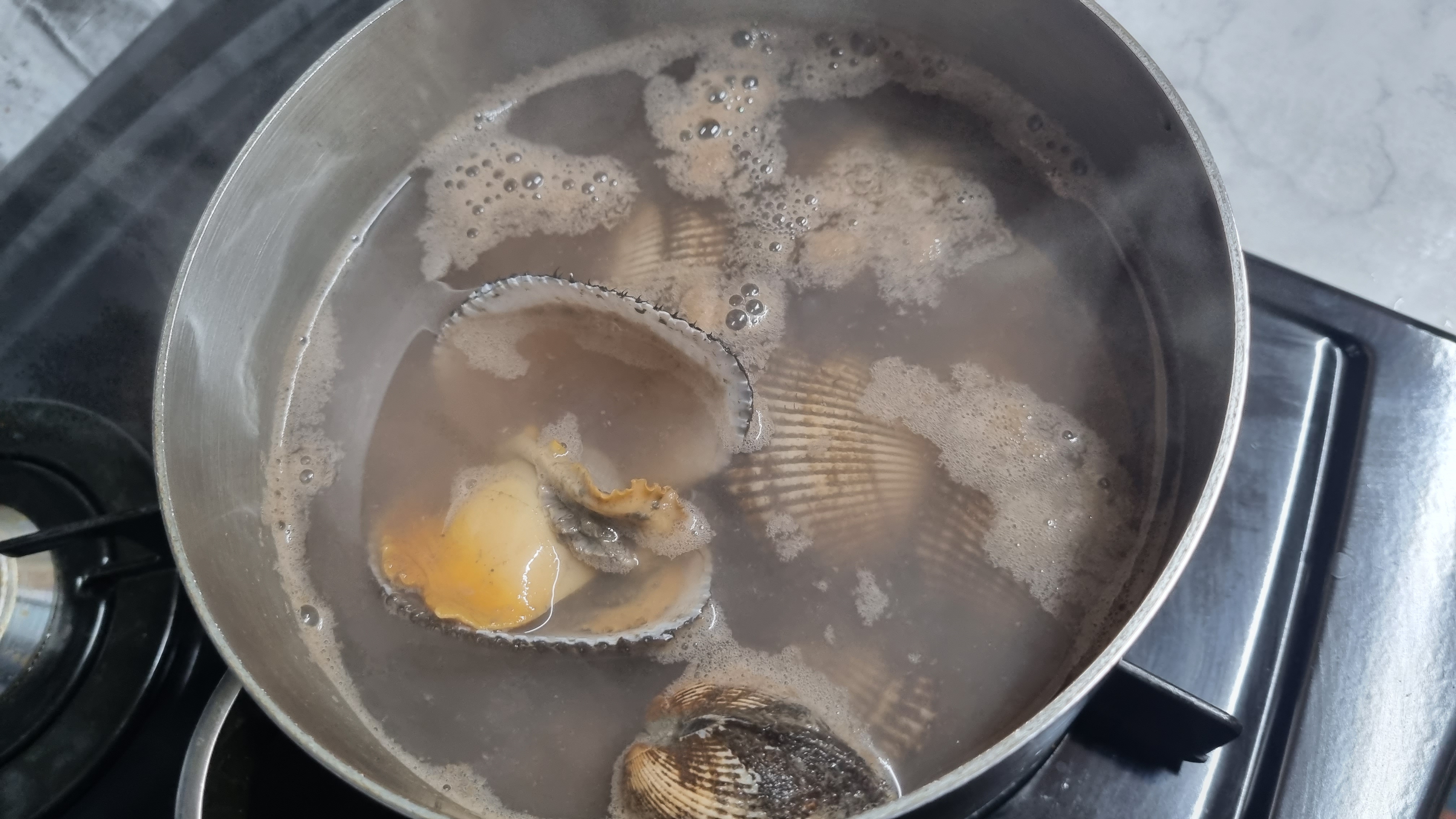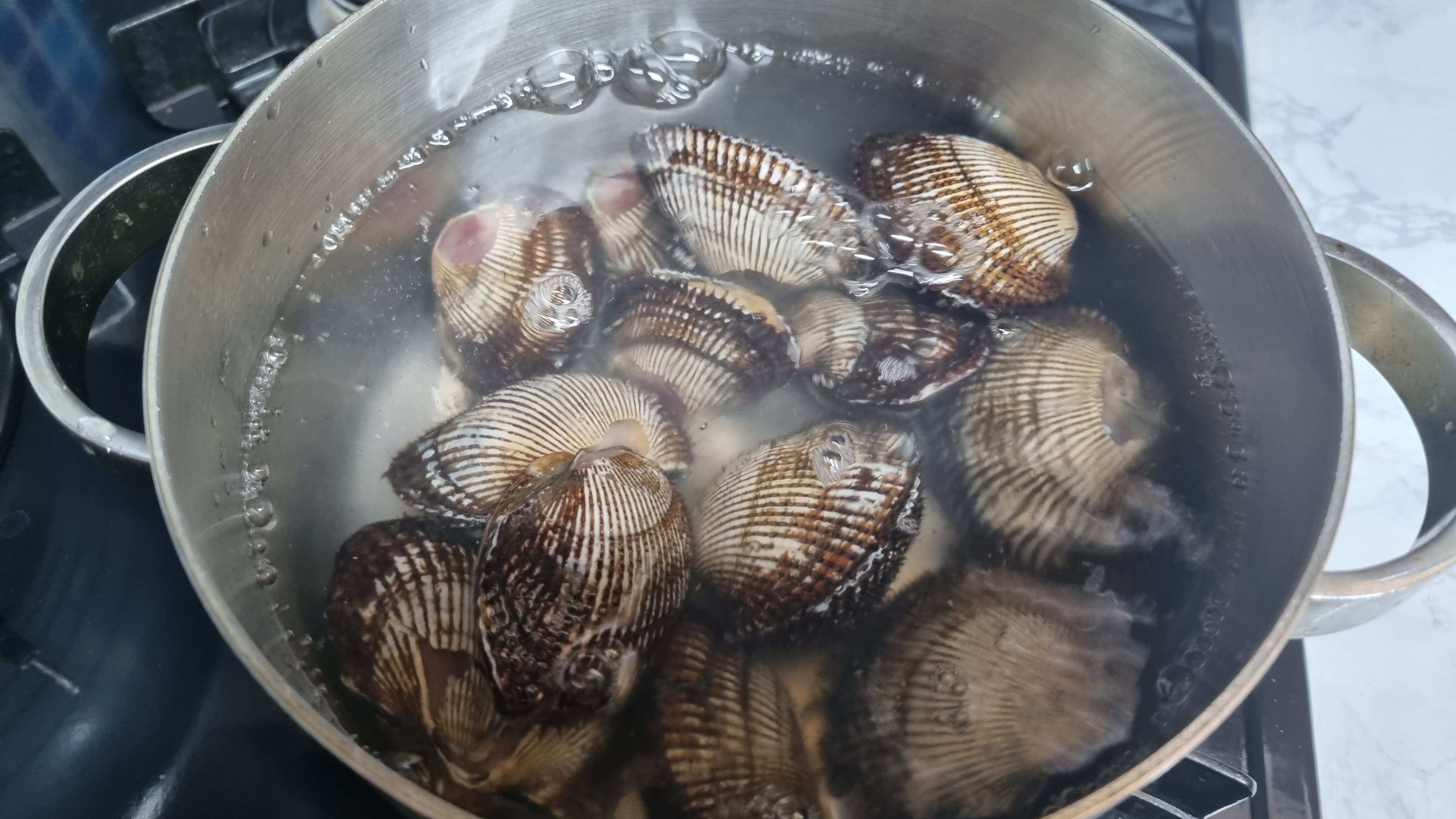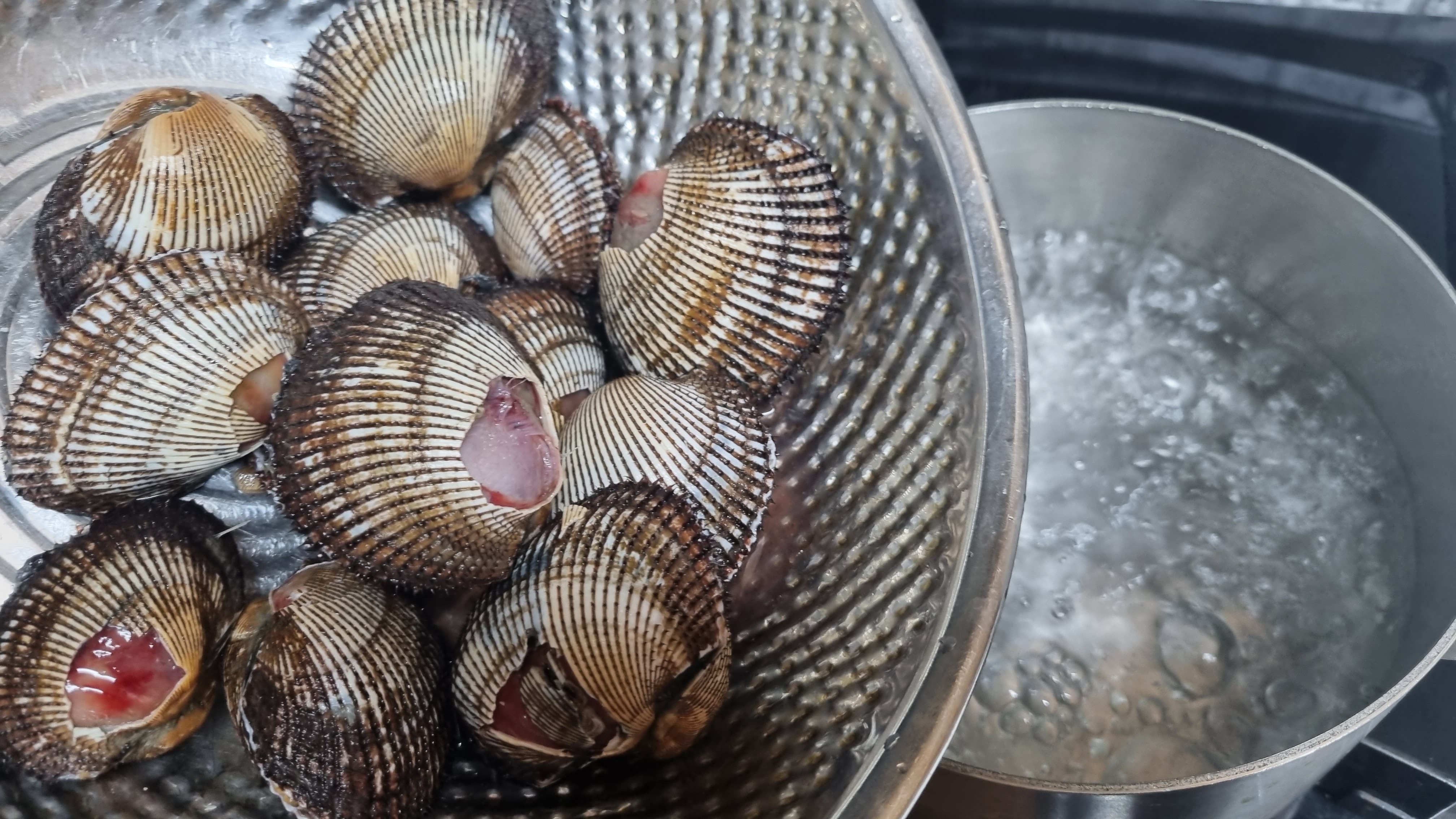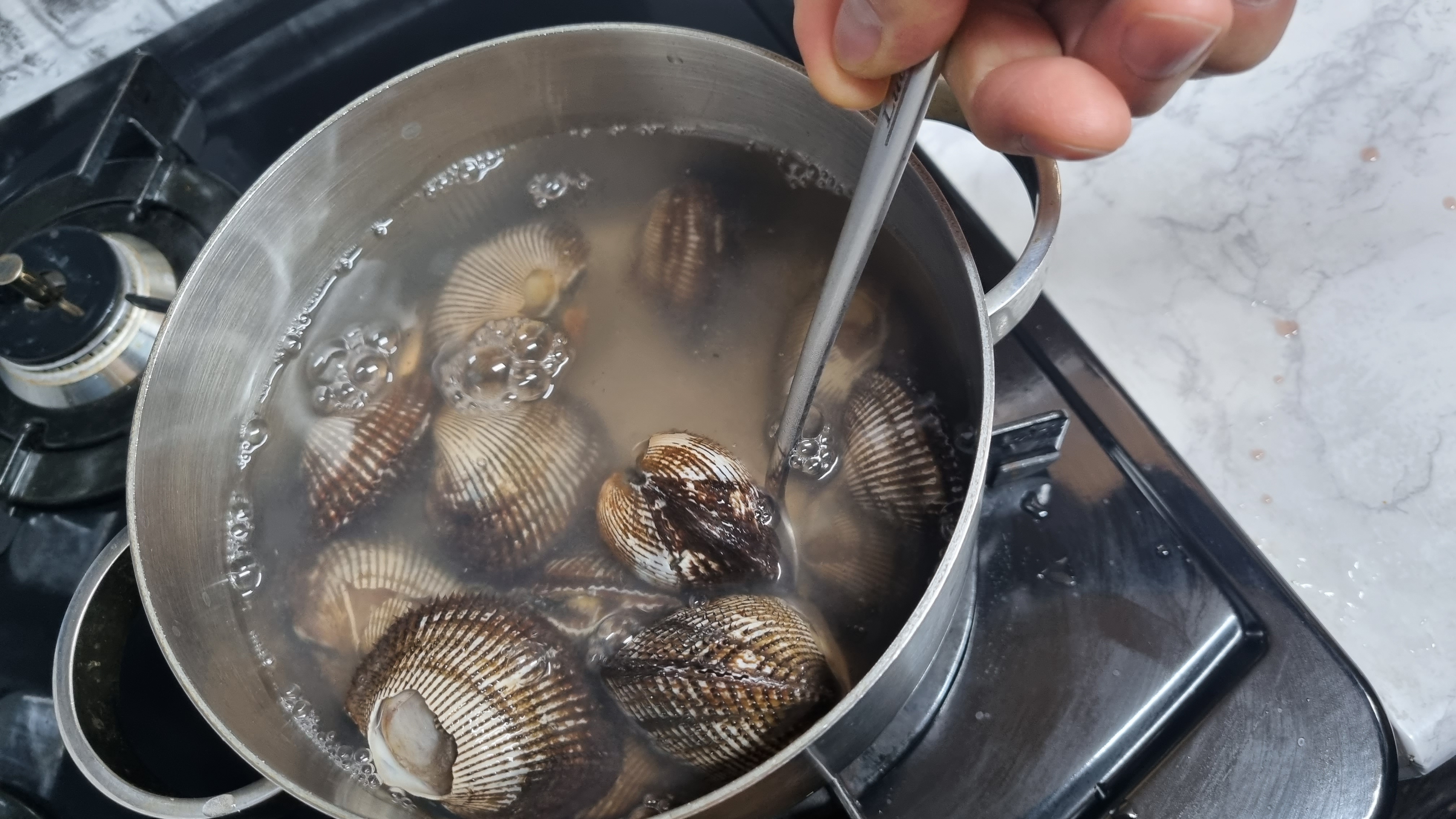 일단 물을 팔팔 끓여야 하는데 물의 양은 피꼬막을 충분히 잠길 정도로 해야 합니다. 최대한 물속에서 뜨겁게 짧은 시간 내에 삶아야 쫄깃하고 부드럽고 맛있게 됩니다.