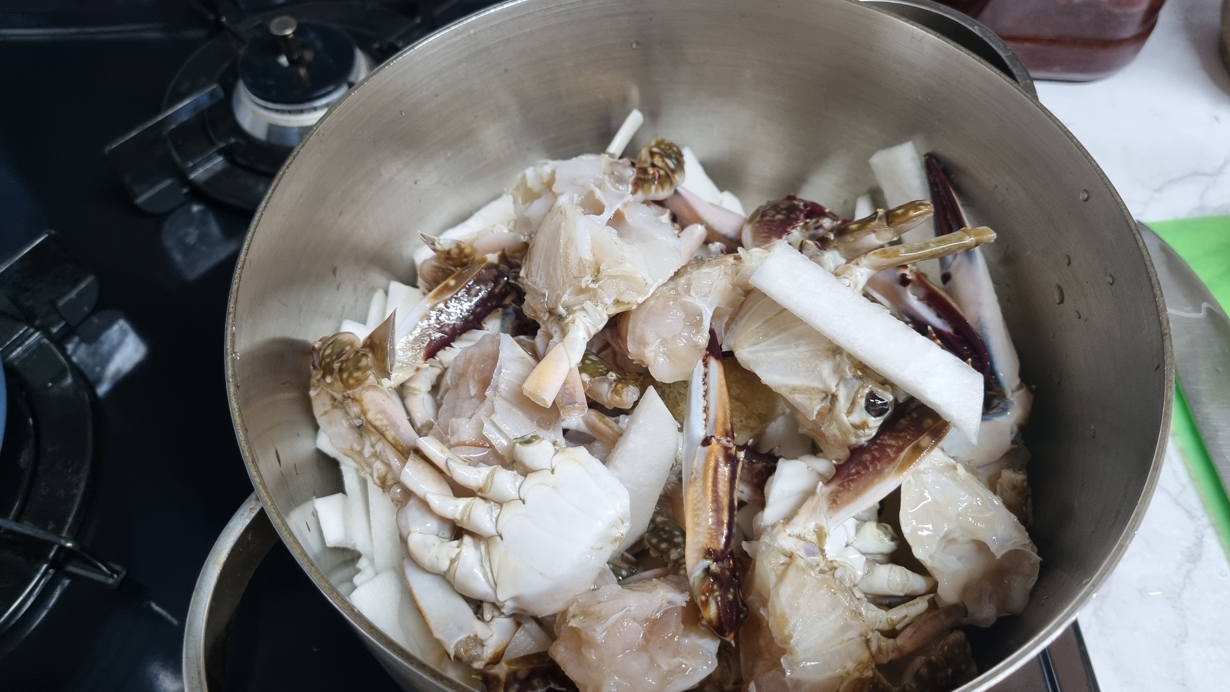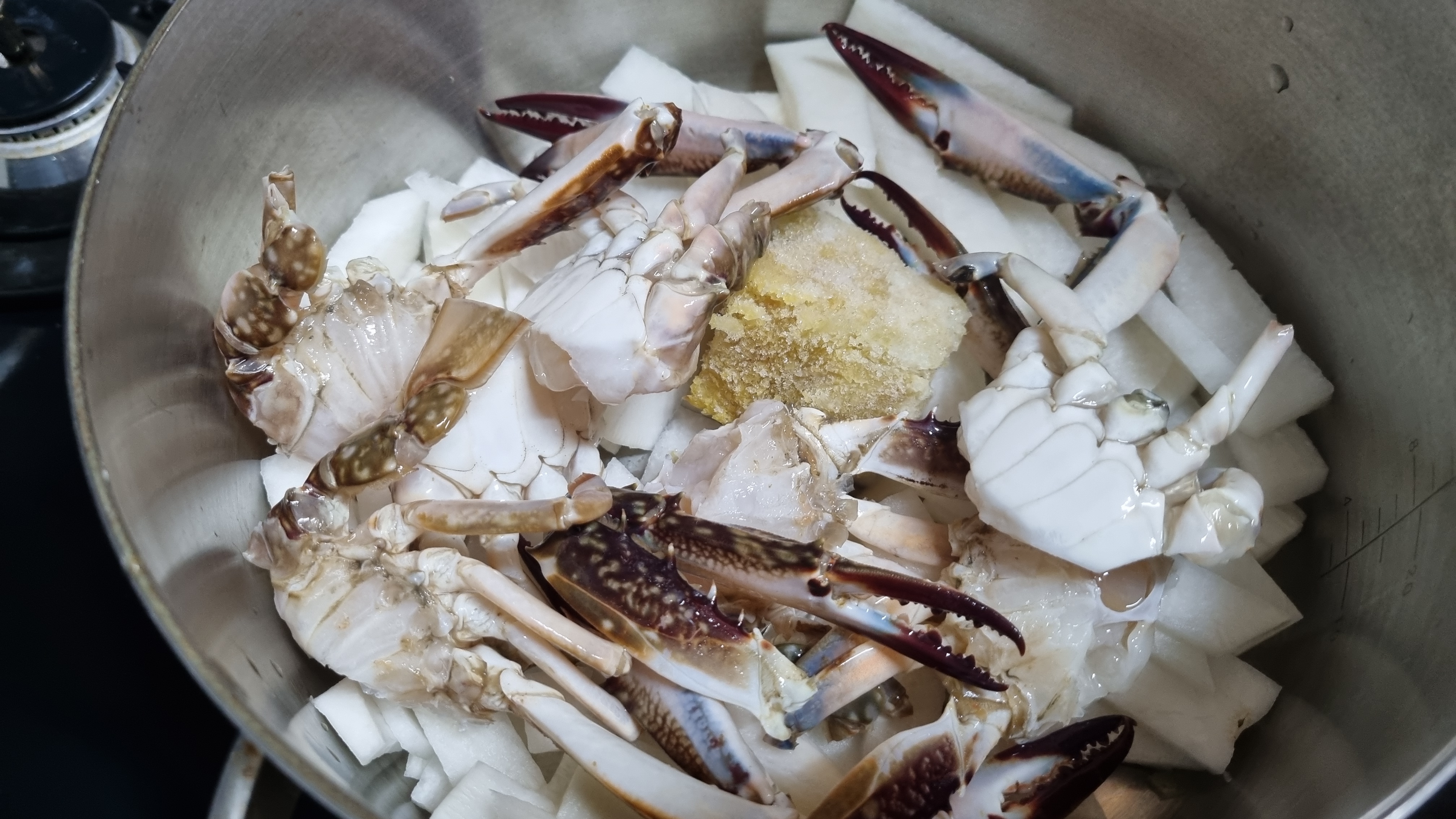 먼저 무를 썰어 냄비에 넣고 이어서 다진 마늘도 넣습니다. 다음으로 손질된 꽃게를 차례로 넣으면서 이제 본격적으로 탕을 만들기 시작합니다.