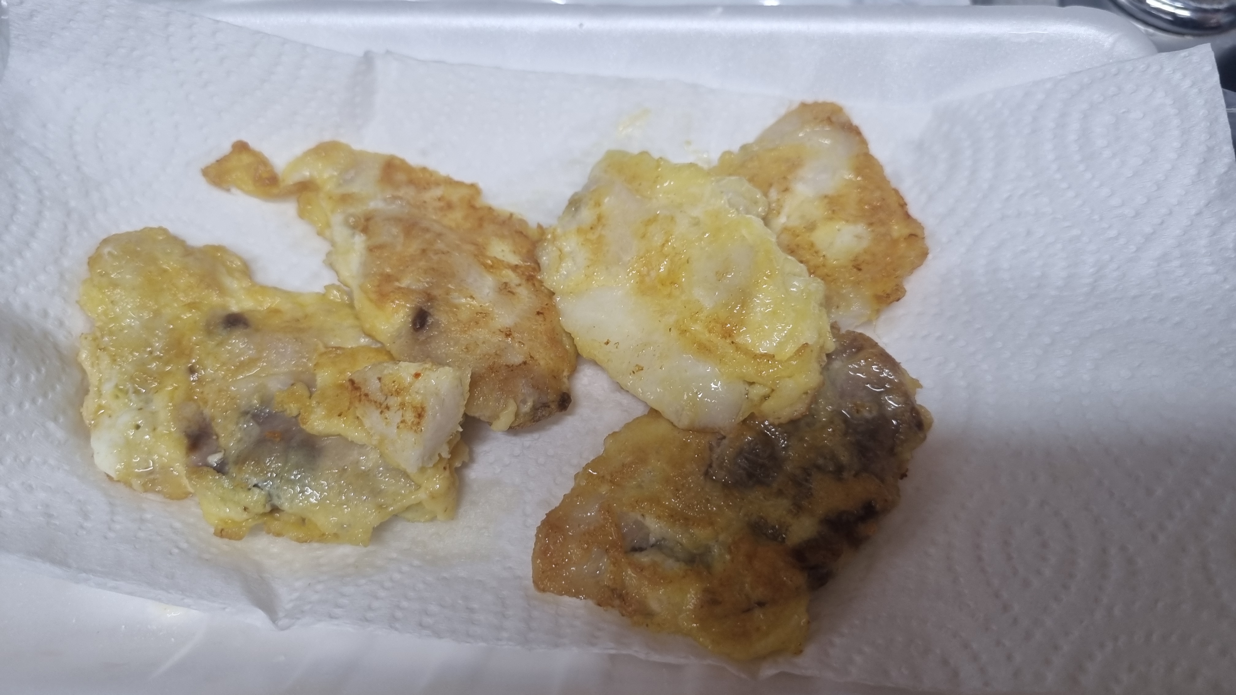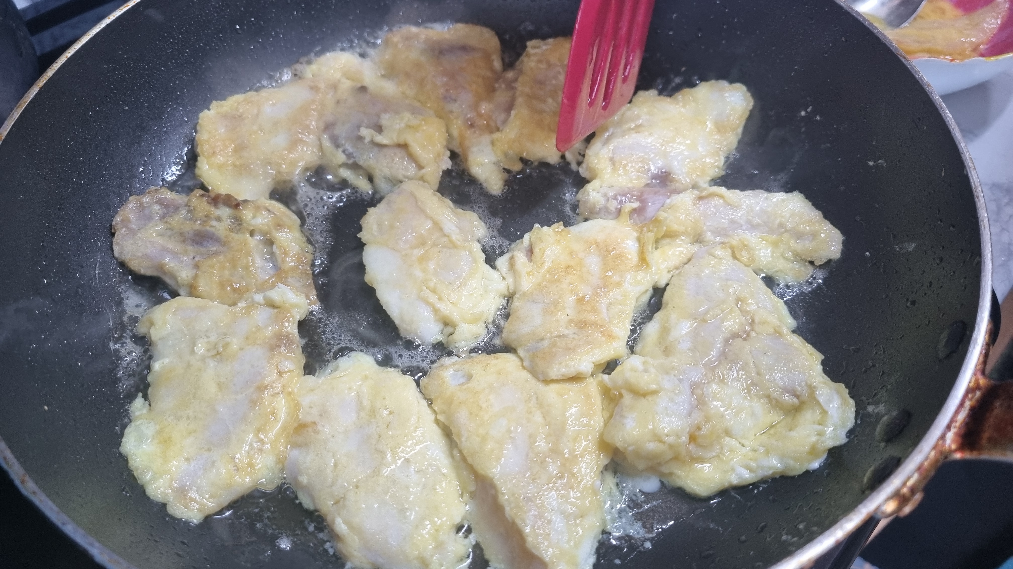 이렇게 민어를 계란까지 골고루 묻혀주고 잘 섞어주면 재료준비는 완벽하게 되었습니다. 이제 프라이팬에 넣어 부치기만 하면 되는데 뜨거우므로 다치지 않게 조심해야 합니다.