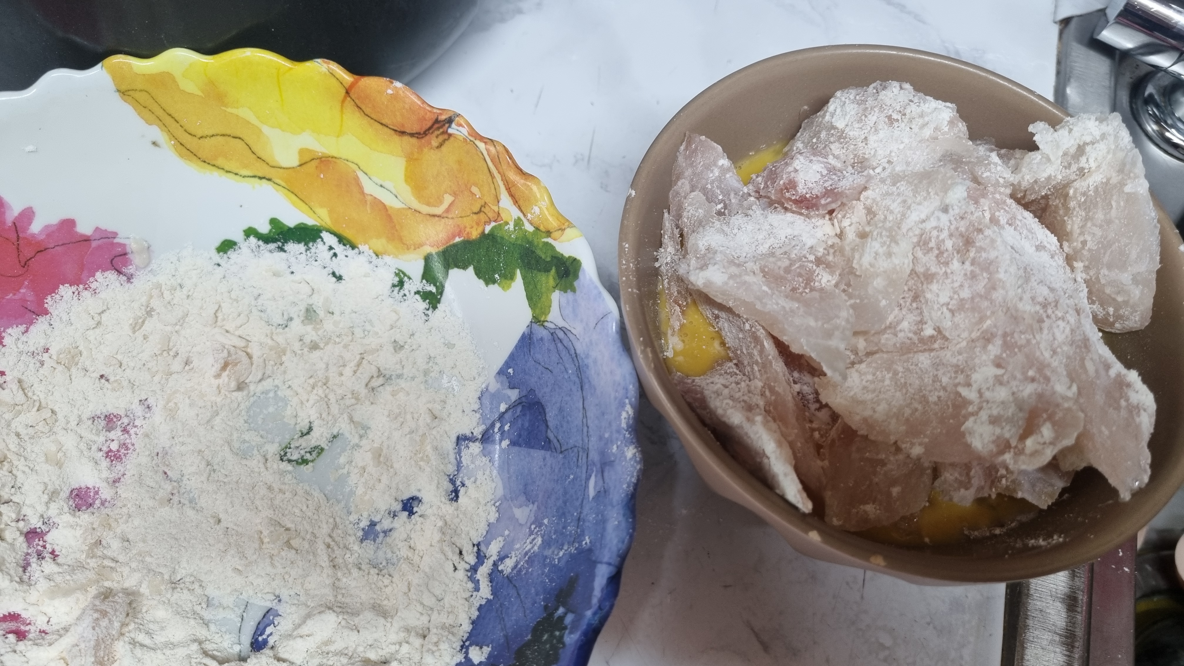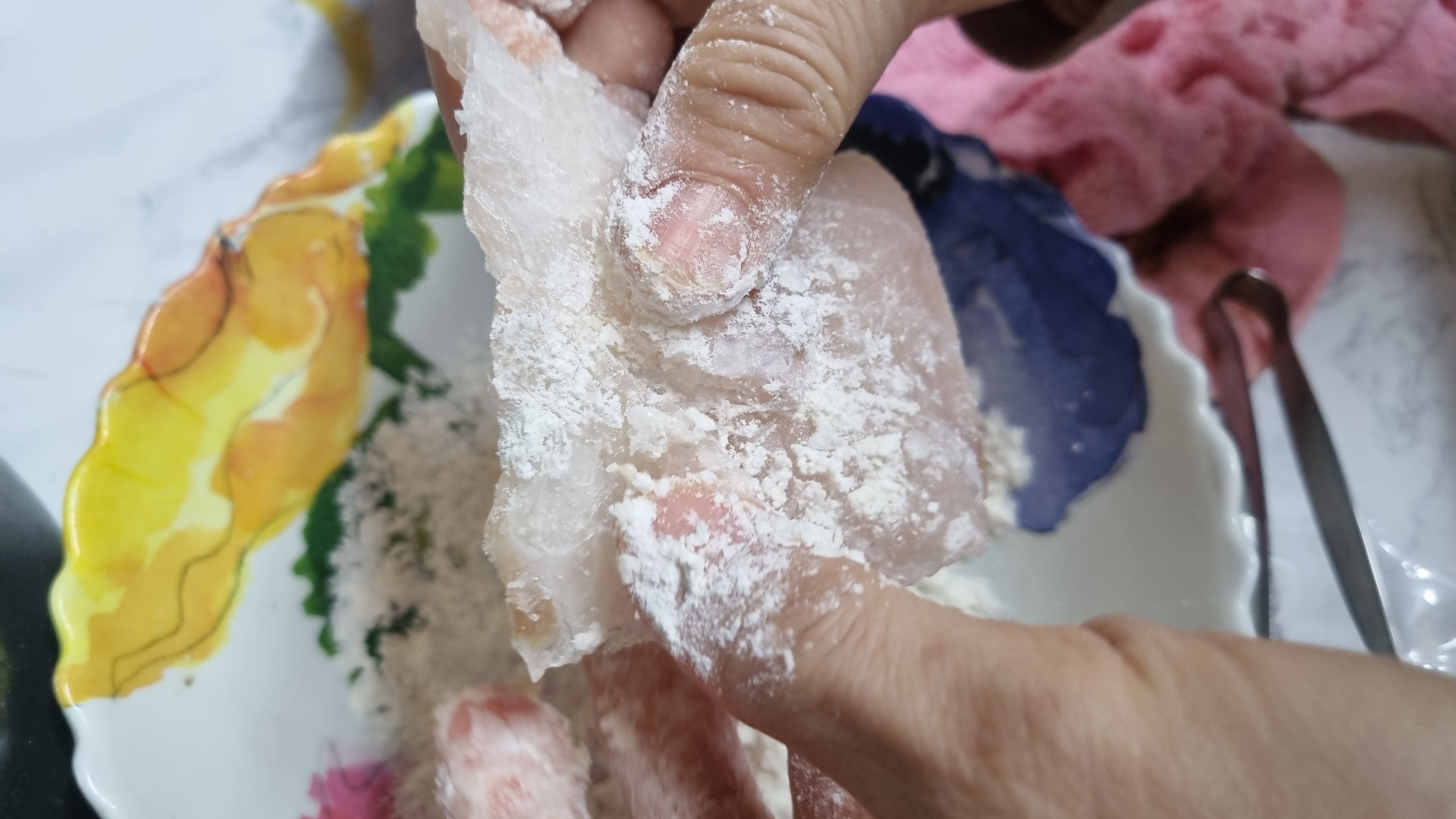 밀가루는 접시나 그릇에 조금 넣어 넓게 하여 민어에 골고루 발라줍니다. 밀가루를 비늘봉지에 넣고 민어를 함께 넣고 한꺼번에 흔들어 묻히는 방법도 있는데 양이 적으면 이렇게 이렇게 하나하나 묻혀서 만들면 됩니다.