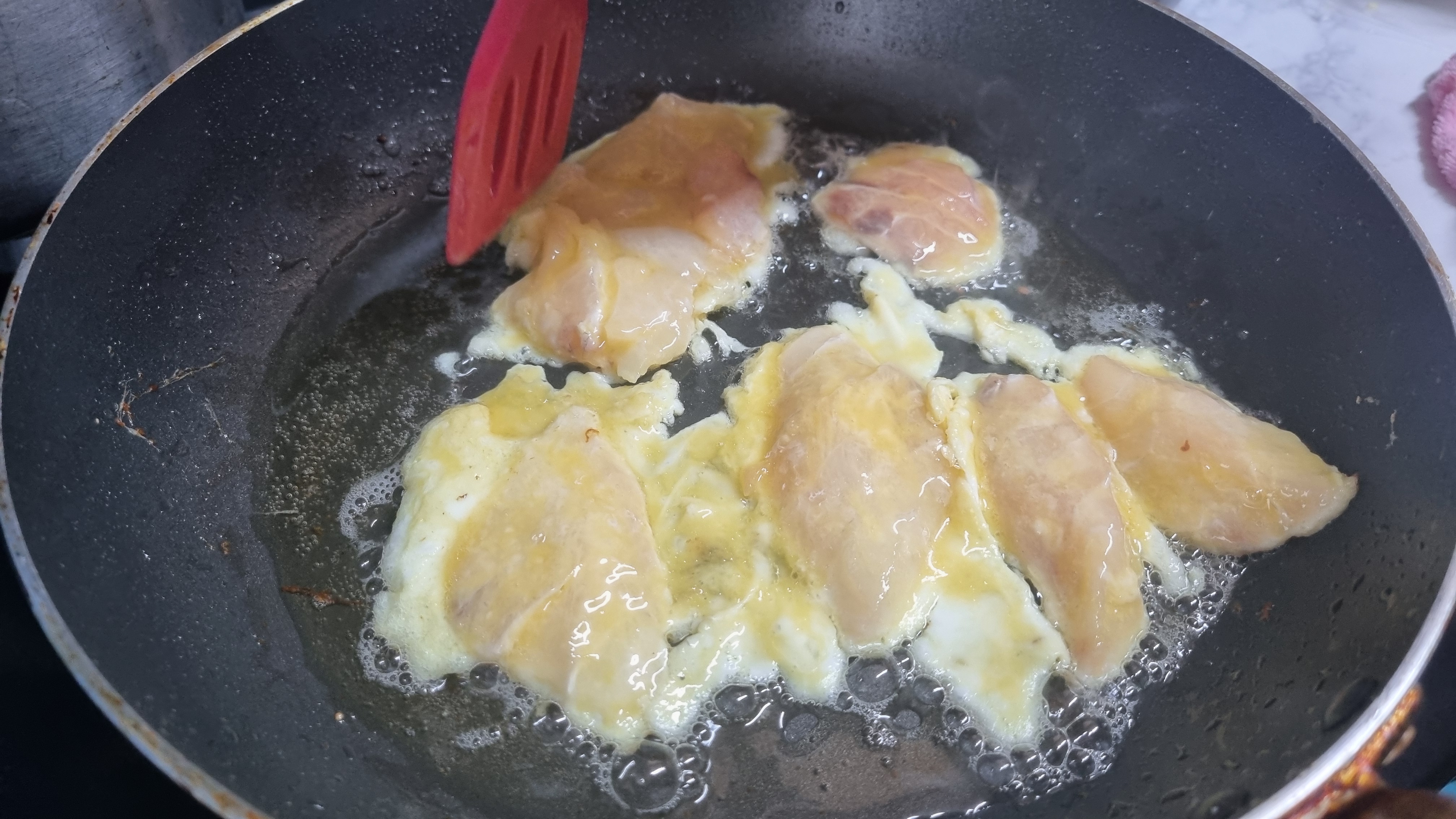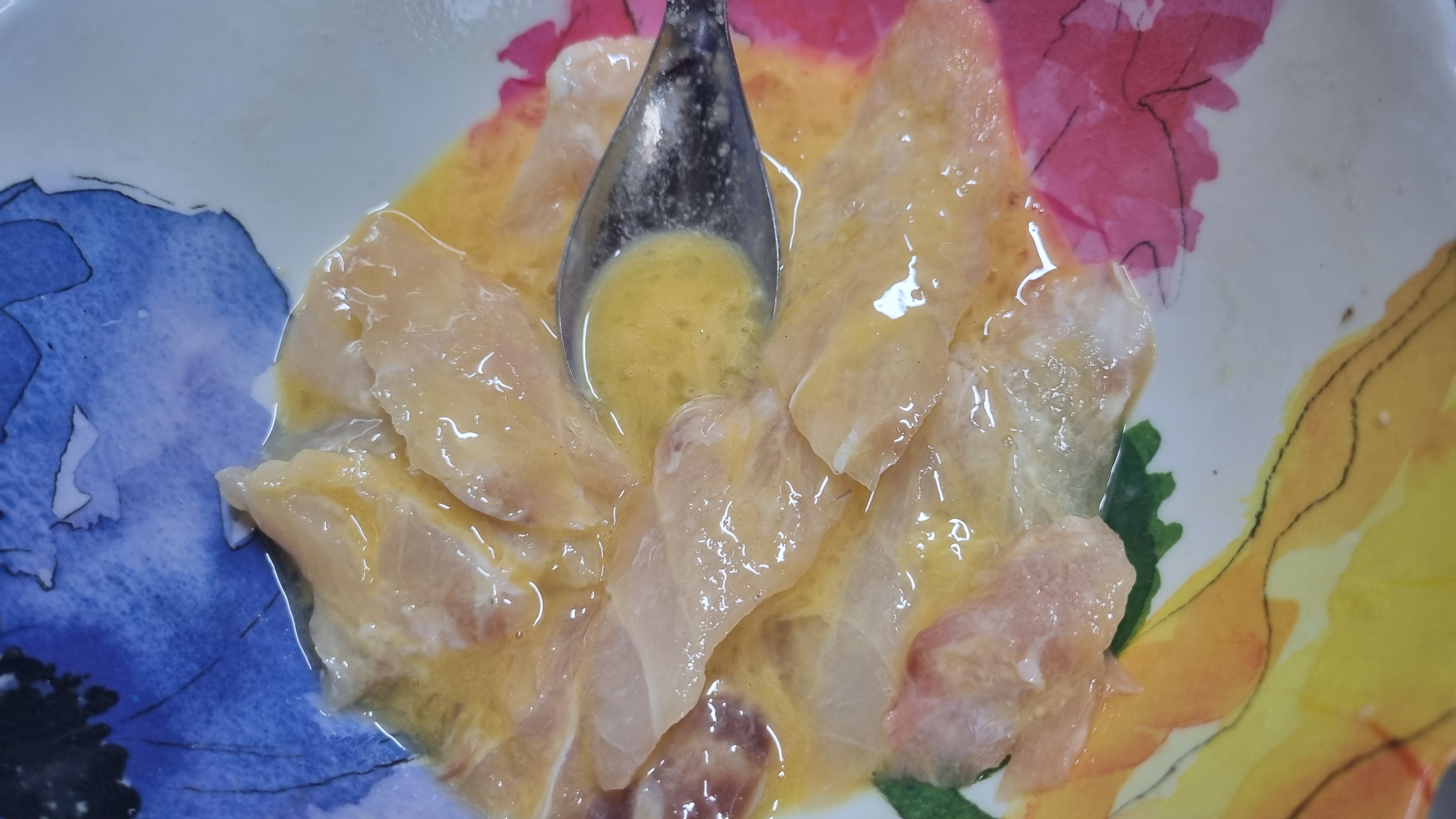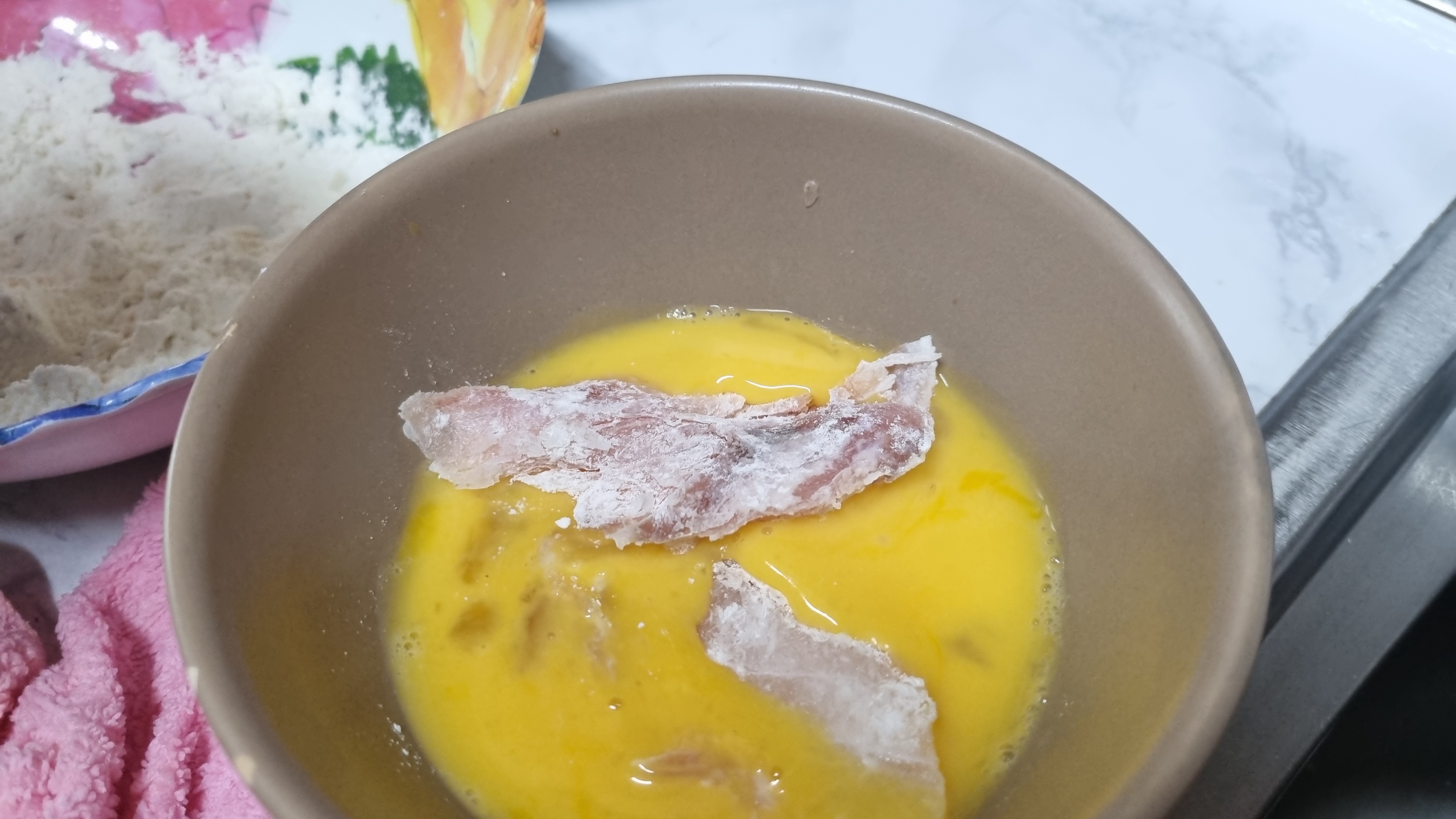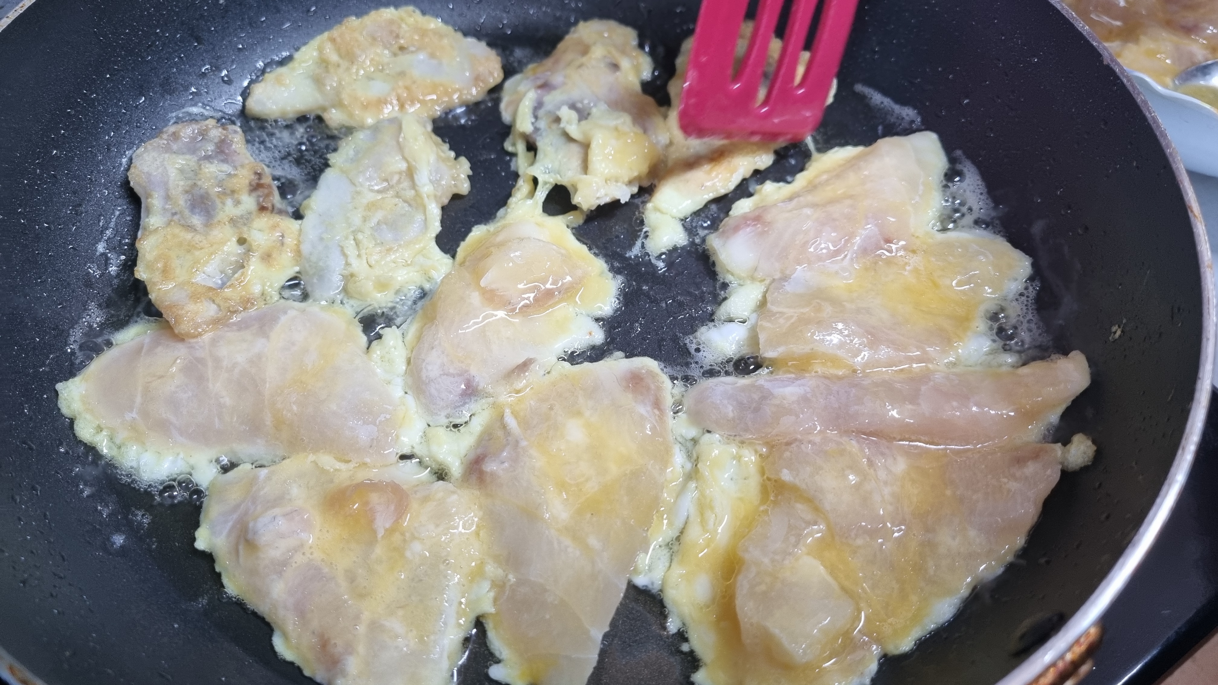 밀가루를 묻히고 이어서 계란에 넣어 골고루 저어주면서 묻히면 됩니다.