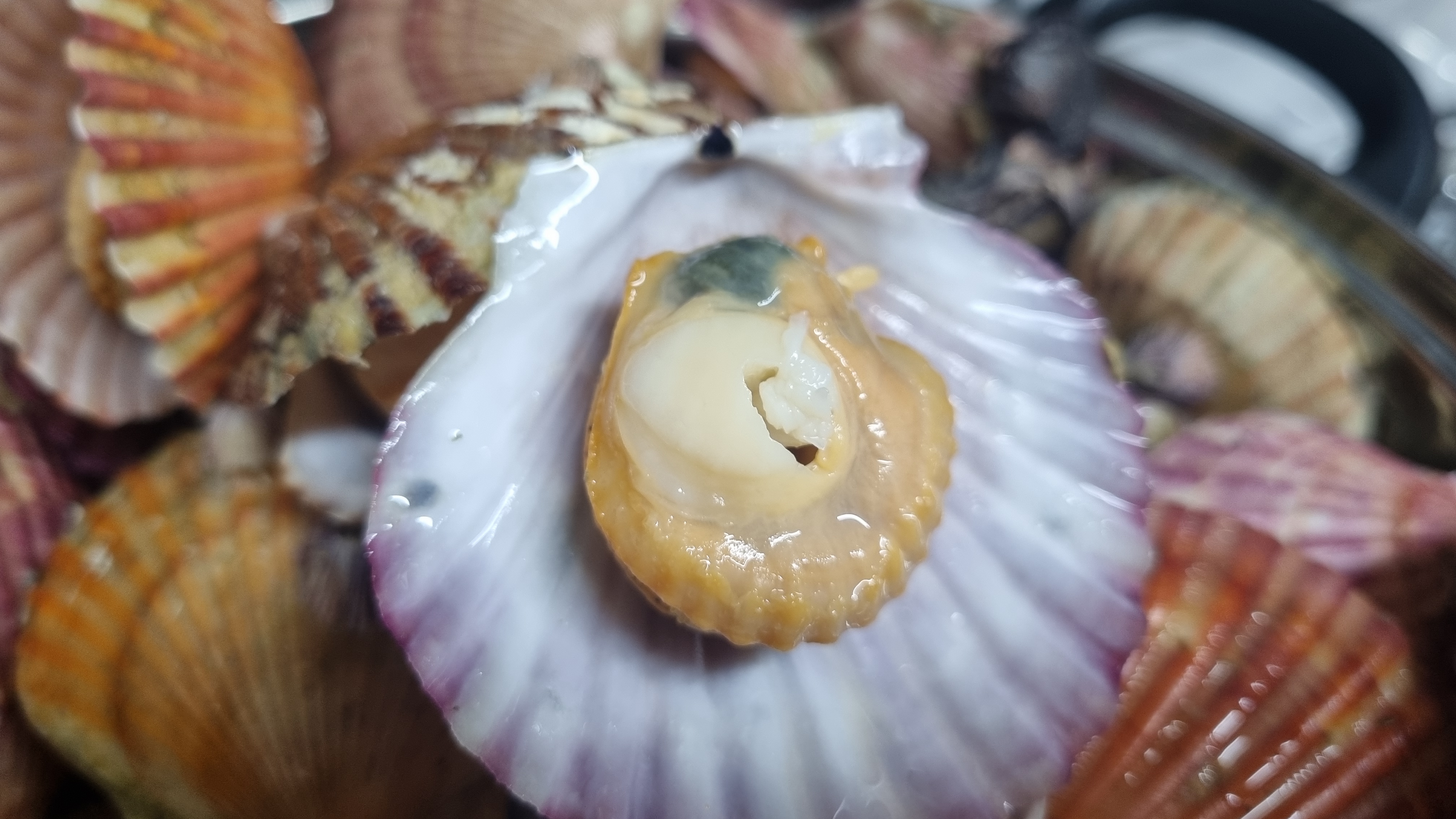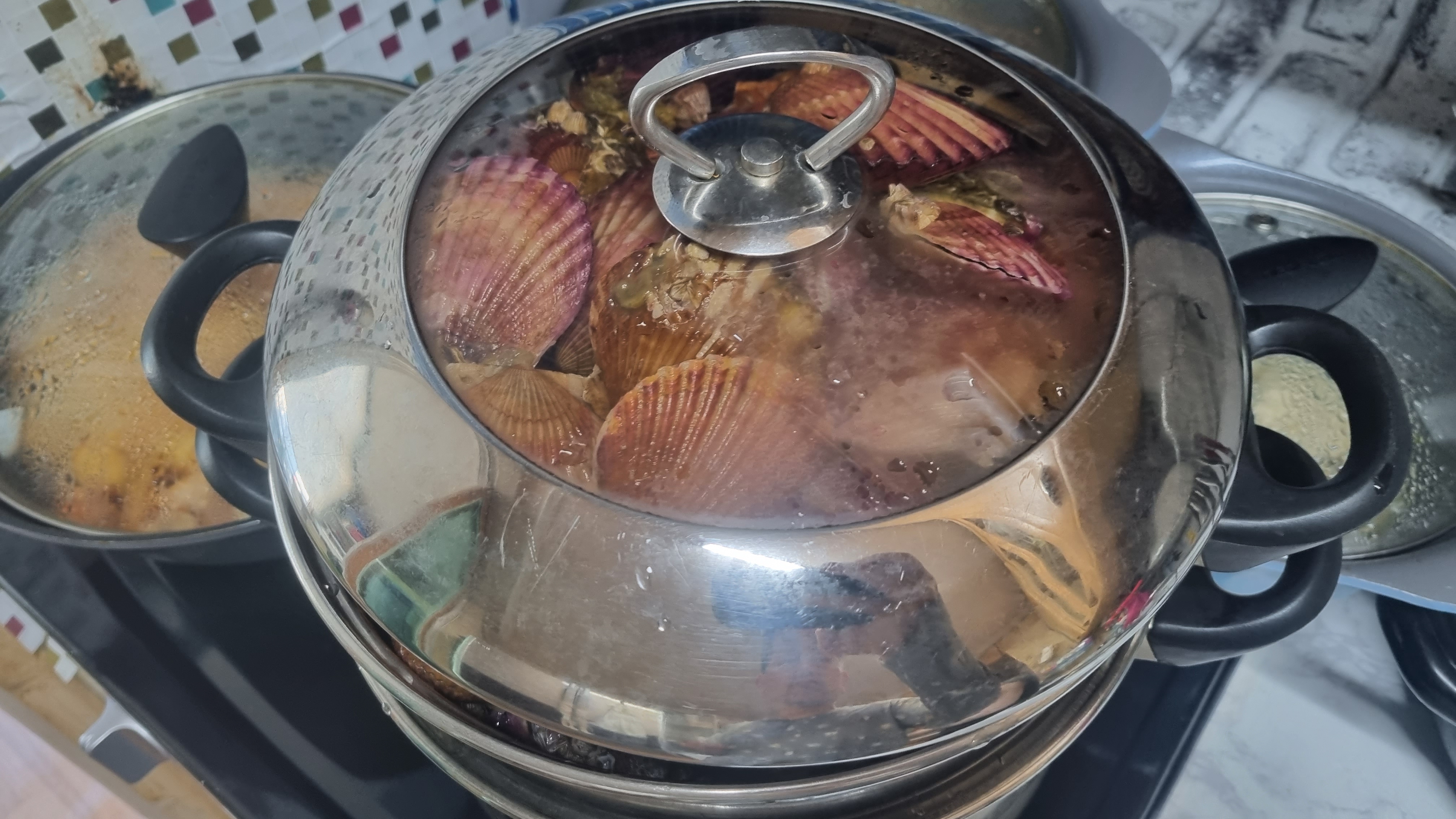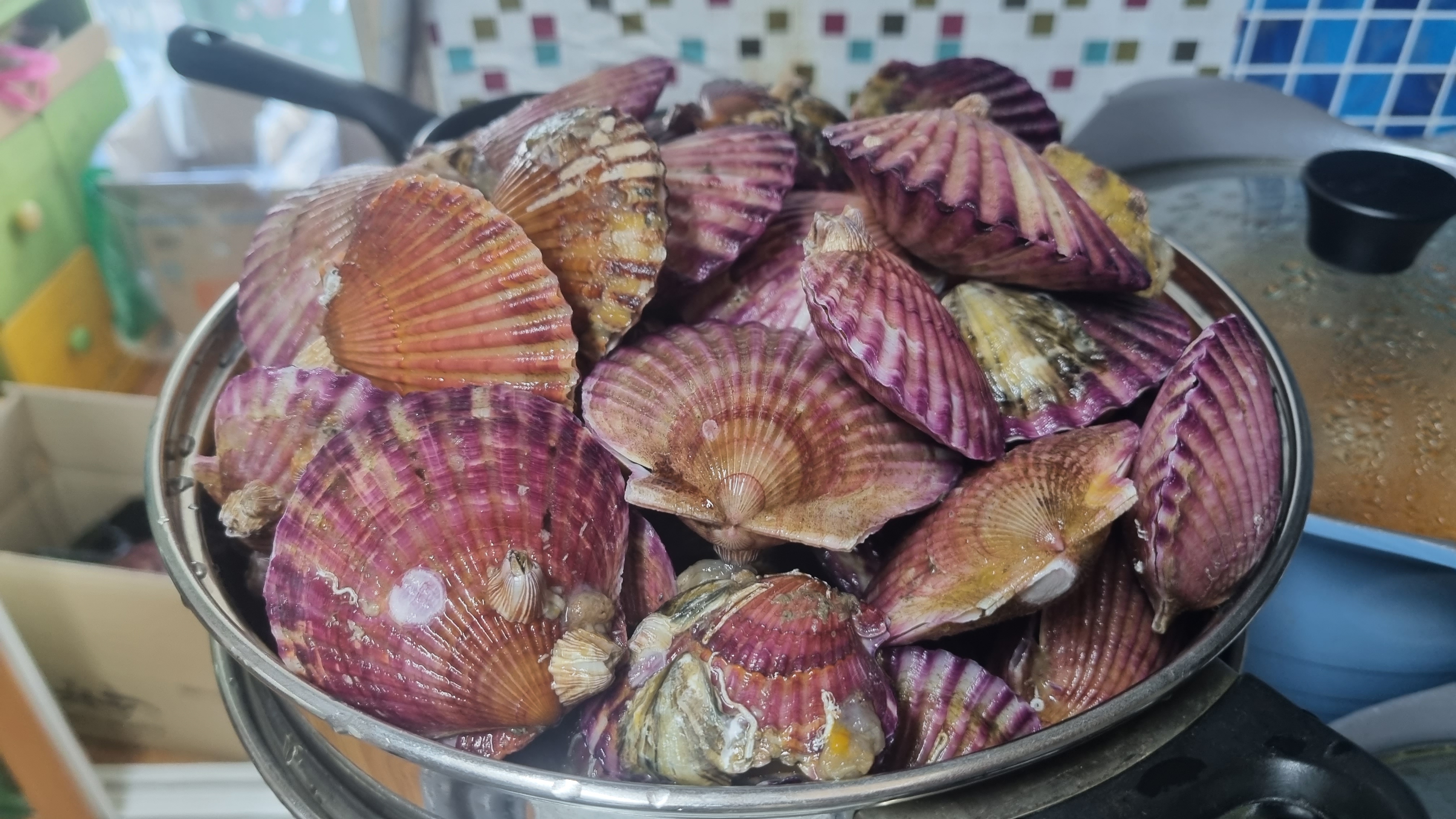 이후 10분에서 12분 정도 끓이면 아주 맛있게 되는데 10분쯤 되면 뚜껑을 열어보고 확인하는데 이때쯤 되면 대부분의 가리비들이 입을 벌리고 있을 것입니다.