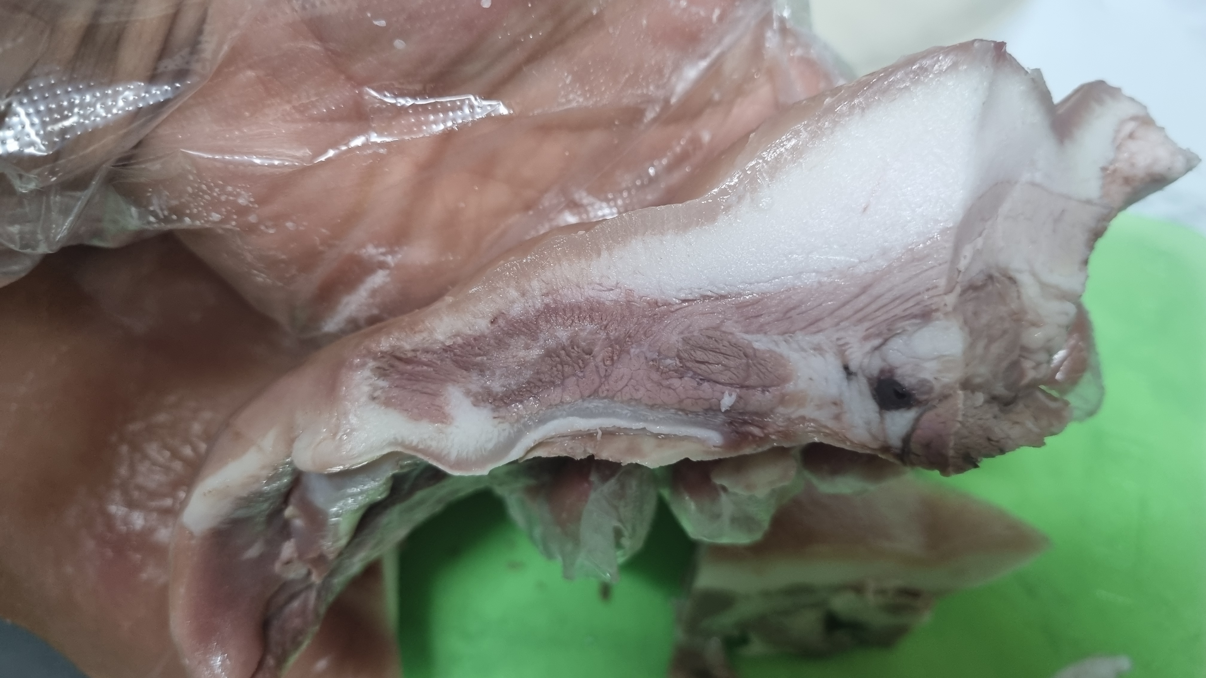 포장지를 벗기 상태인데 제품 상태는 아주 잘 삶아져 그대로 드시기만 하는 것으로 괜찮아 보였습니다. 돼지머리 그대로 한 덩어리로 되어 있어 썰어서 바로 드실 수 있는 상태입니다.