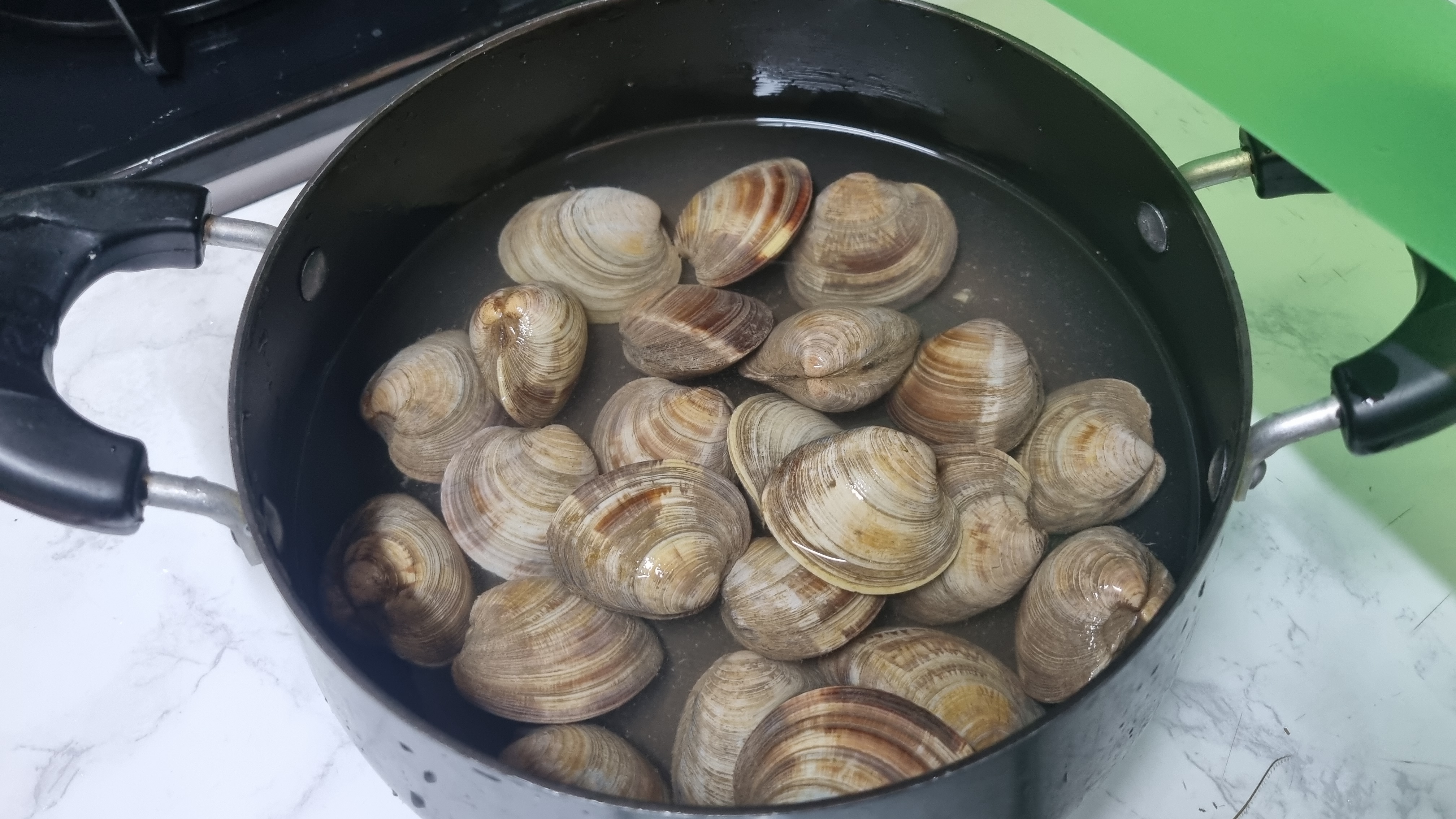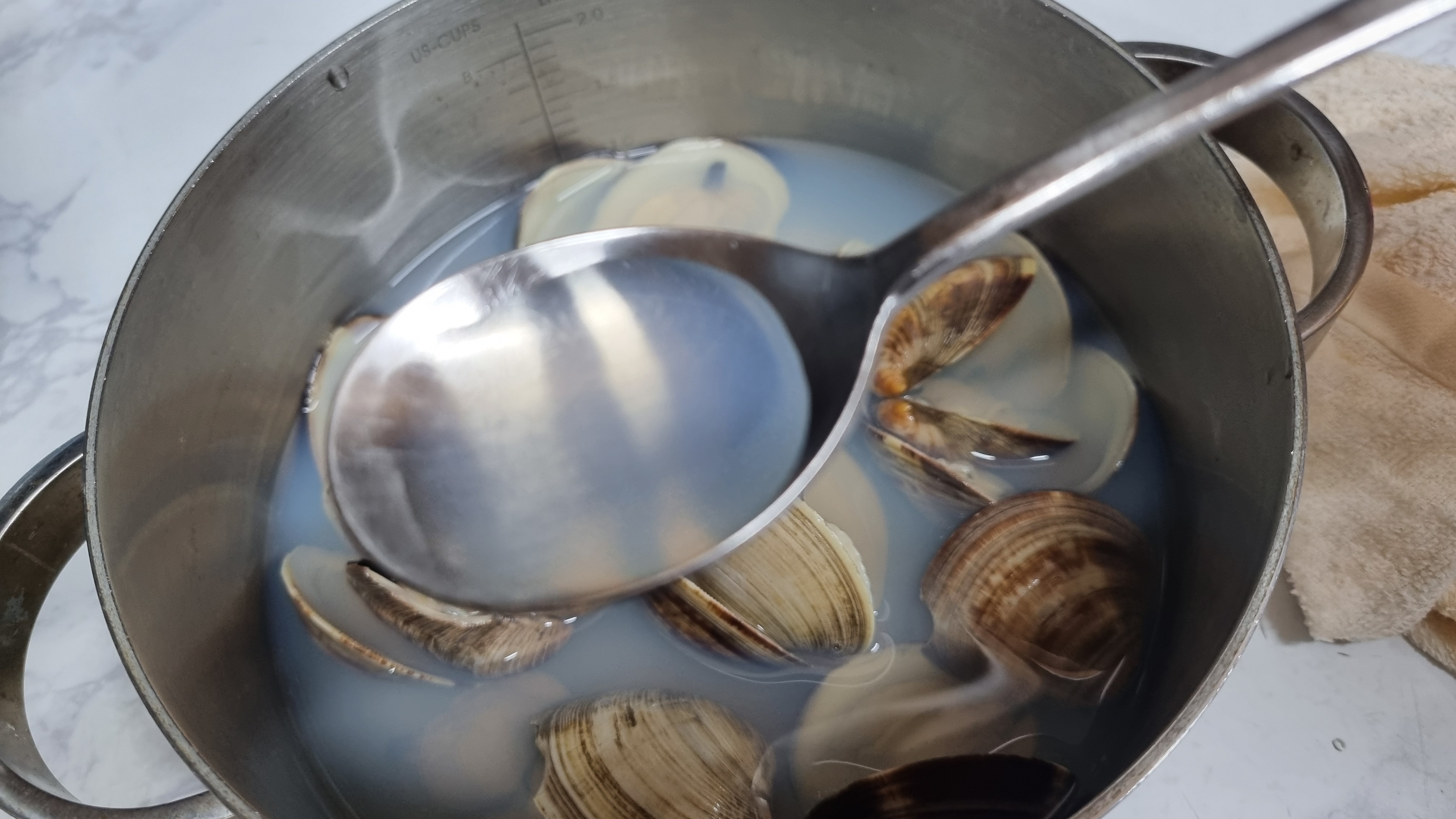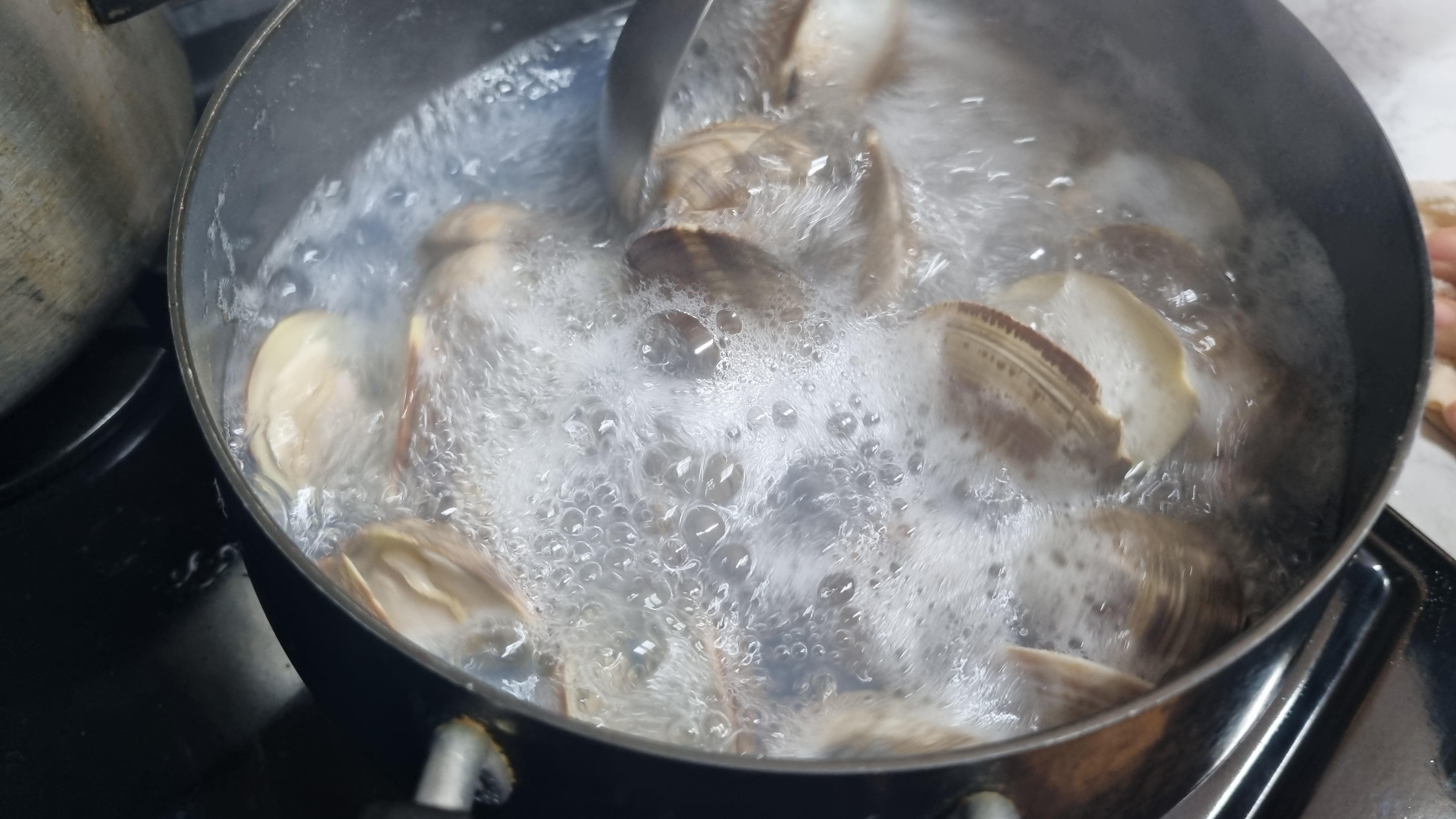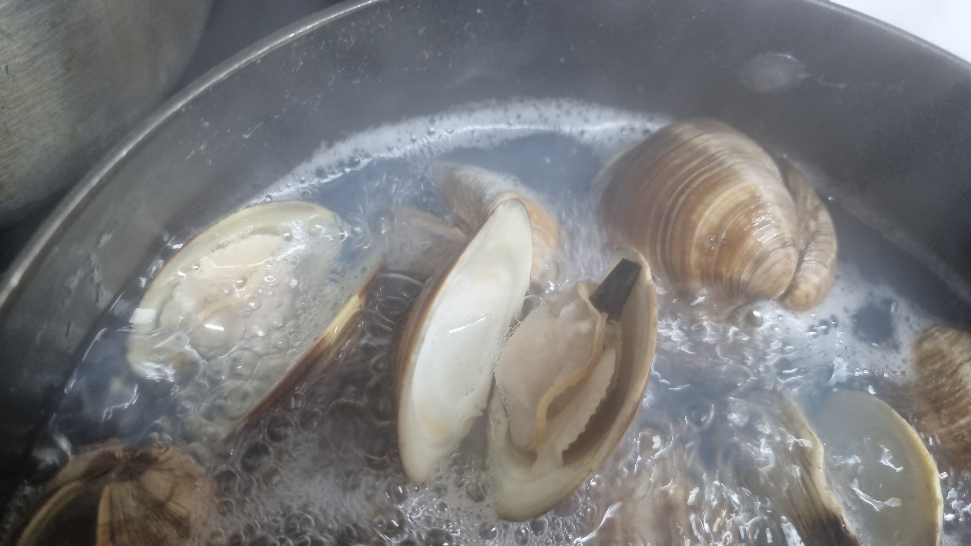 조개와 물 소금을 냄비에 넣고 가스렌인지나 인덕션 불을 최고로 하여 끓이기 시작합니다. 탕이 끓기 시작하면 가스렌인지 불을 중간으로 조절하여 천천히 끓여주시기 바랍니다.