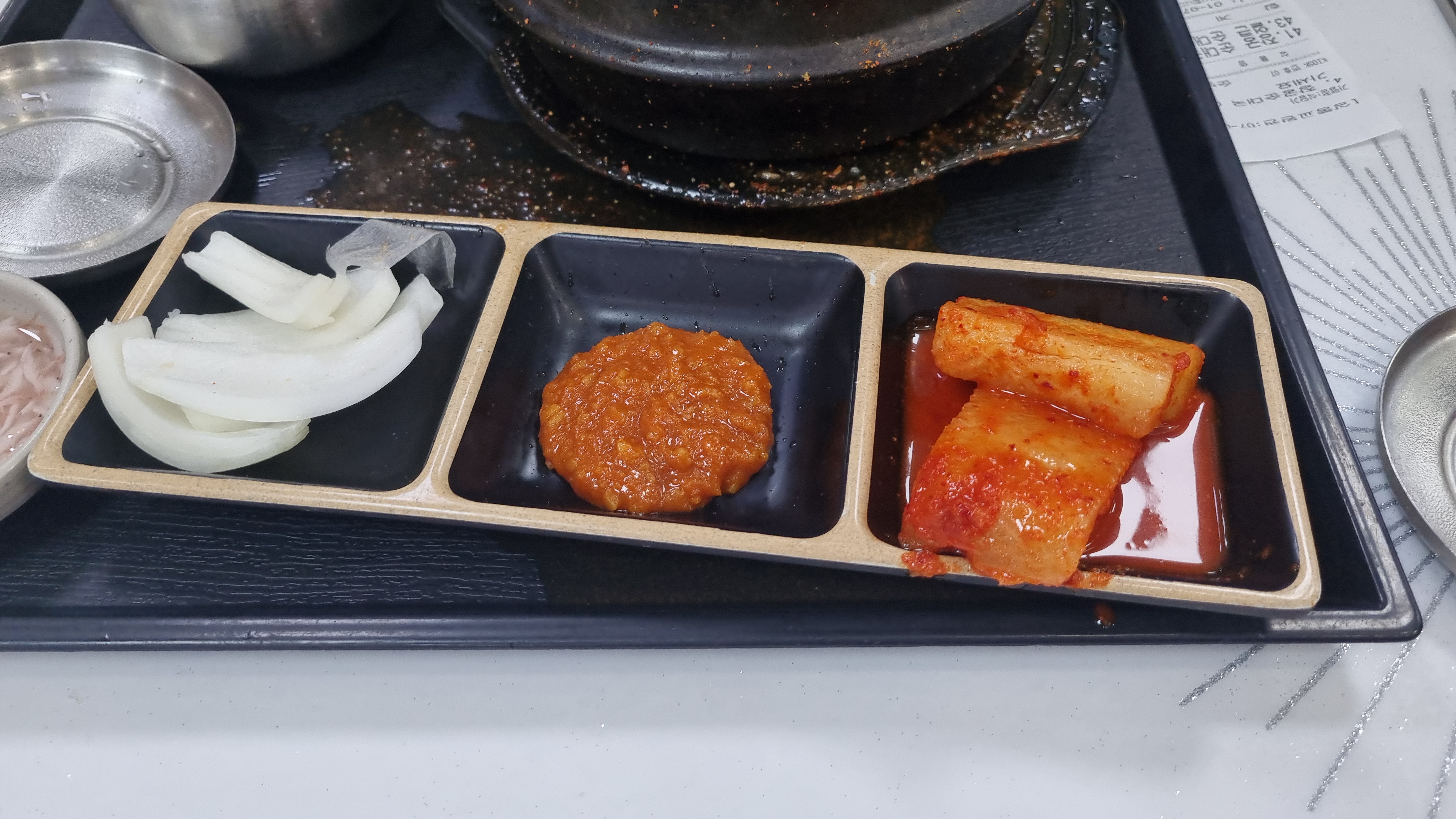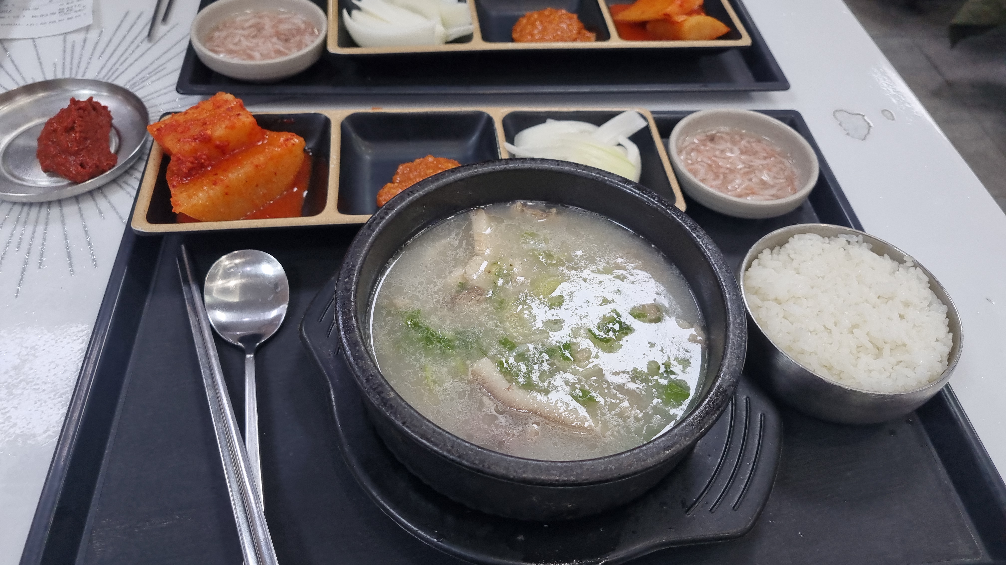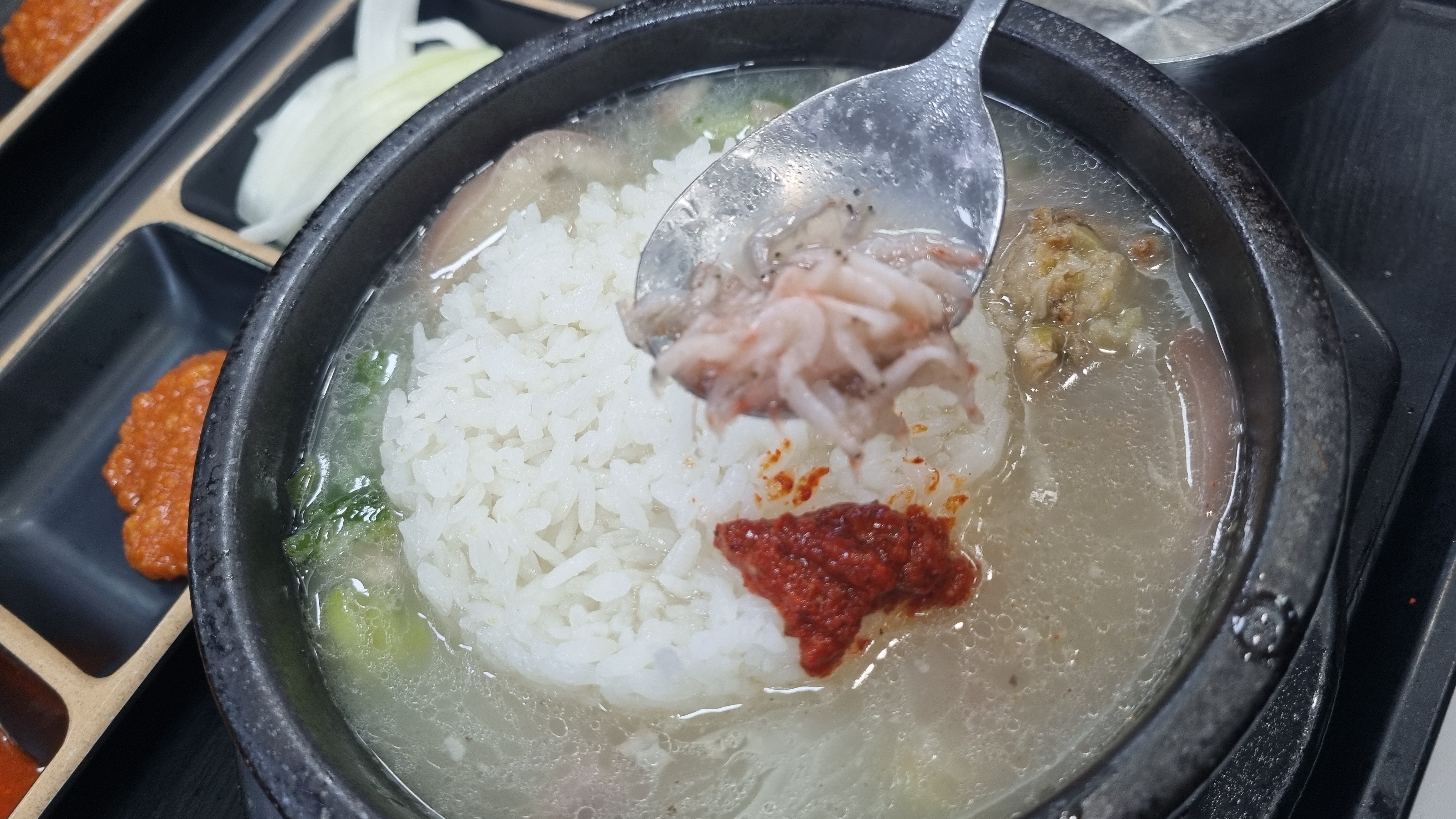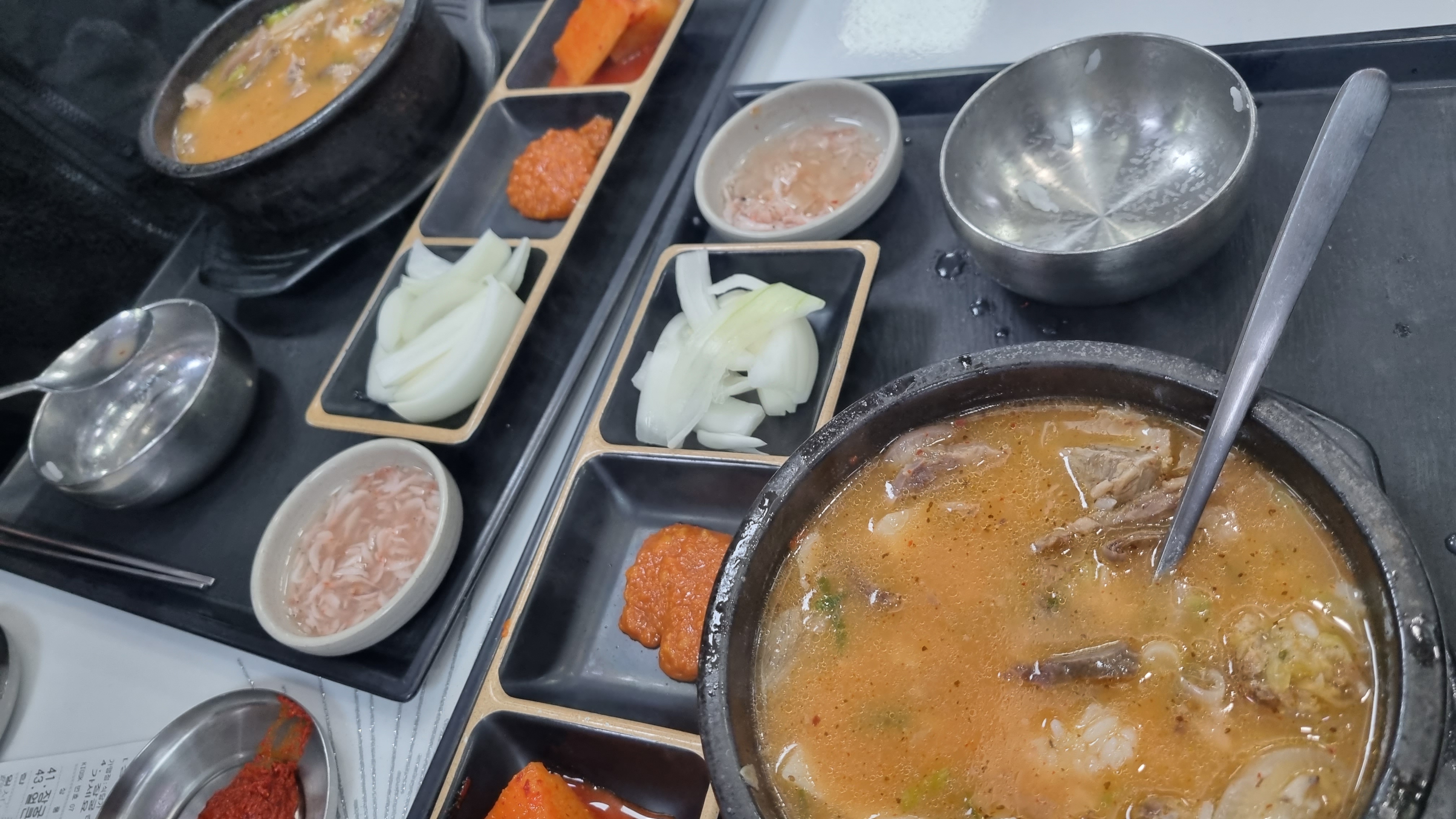 반찬은 많지는 않지만 아주 적당합니다. 많아도 적어도 문제인데 국밥에는 깍두기만 있어도 충분하고 새우젓갈이나 다데기 양념이 의외로 좋았습니다.