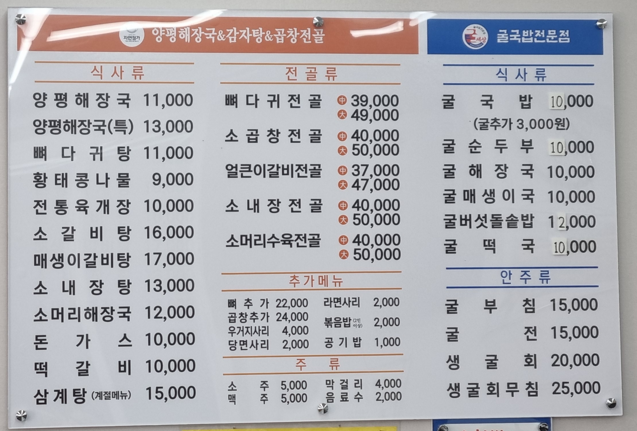 이곳은 굴국밥을 전문으로 하면서 선지국밥인 양평해장국도 상당히 유명한 곳이기도 하는데 모두 국밥위주의 메뉴로 구성되어 있습니다.