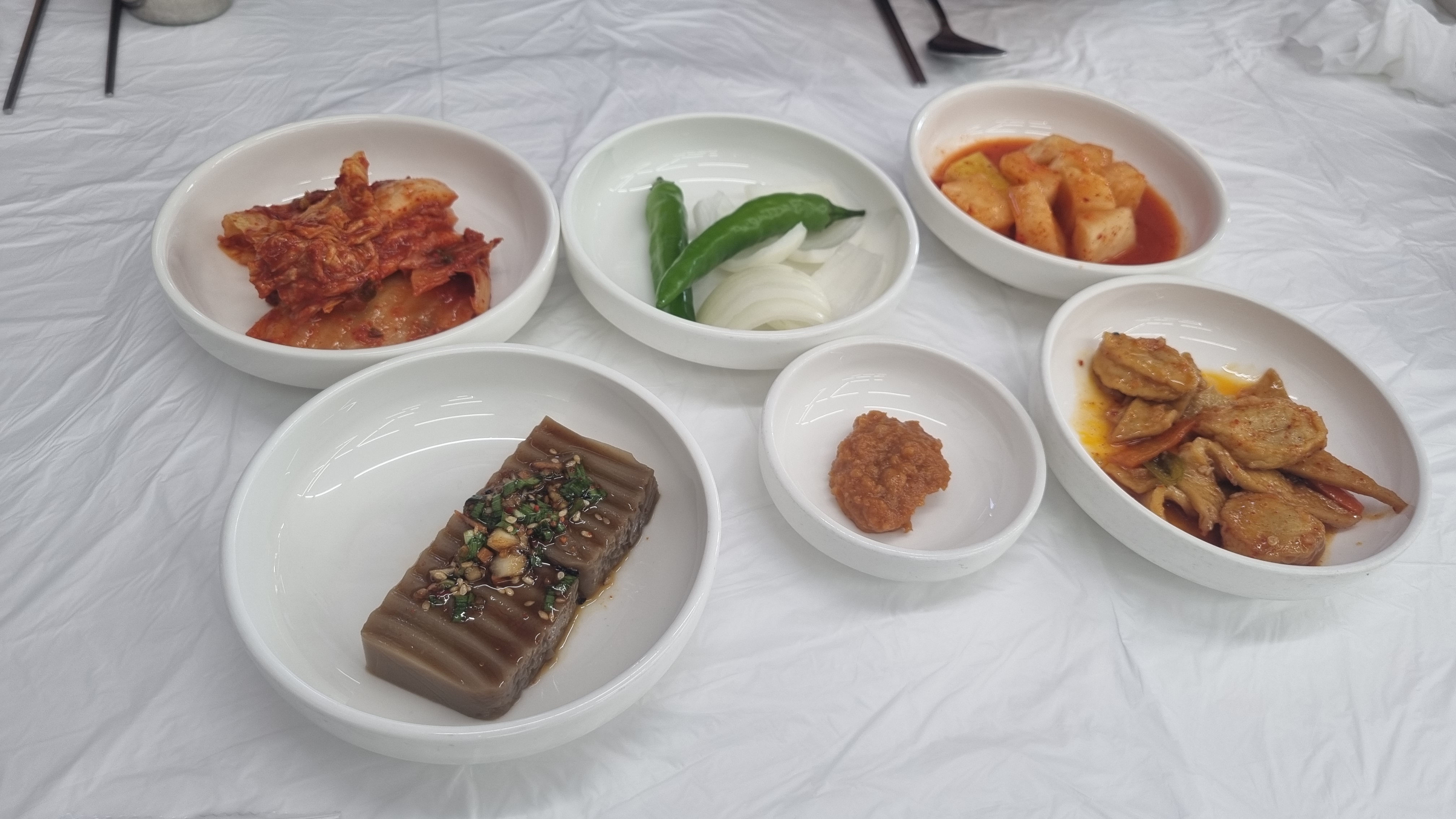 배추김치와 깍두기 어묵볶음 도토리묵이 있는데 처음엔 모두 조금씩 나오지만 원하면 추가 리필이 모두 가능한 반찬들입니다.