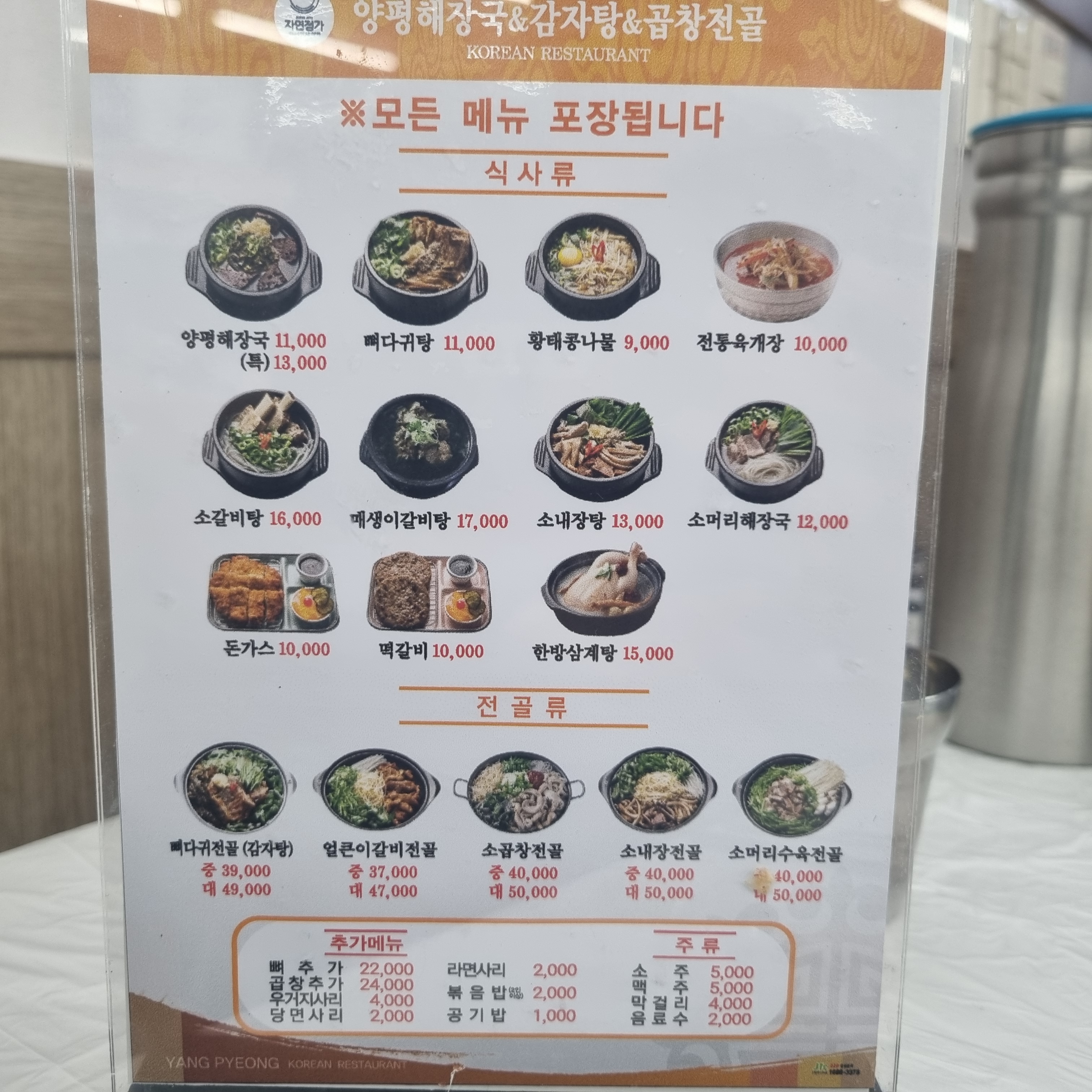 굴국밥이 1만원으로 대부분 굴관련 식사는 1만원으로 유지되었으며 양평해장국은 1,1000원이고 뼈다귀탕동 1,1000원이며 또한 애들을 위해 돈가스 메뉴도 준비되어 있는데 1만원입니다.