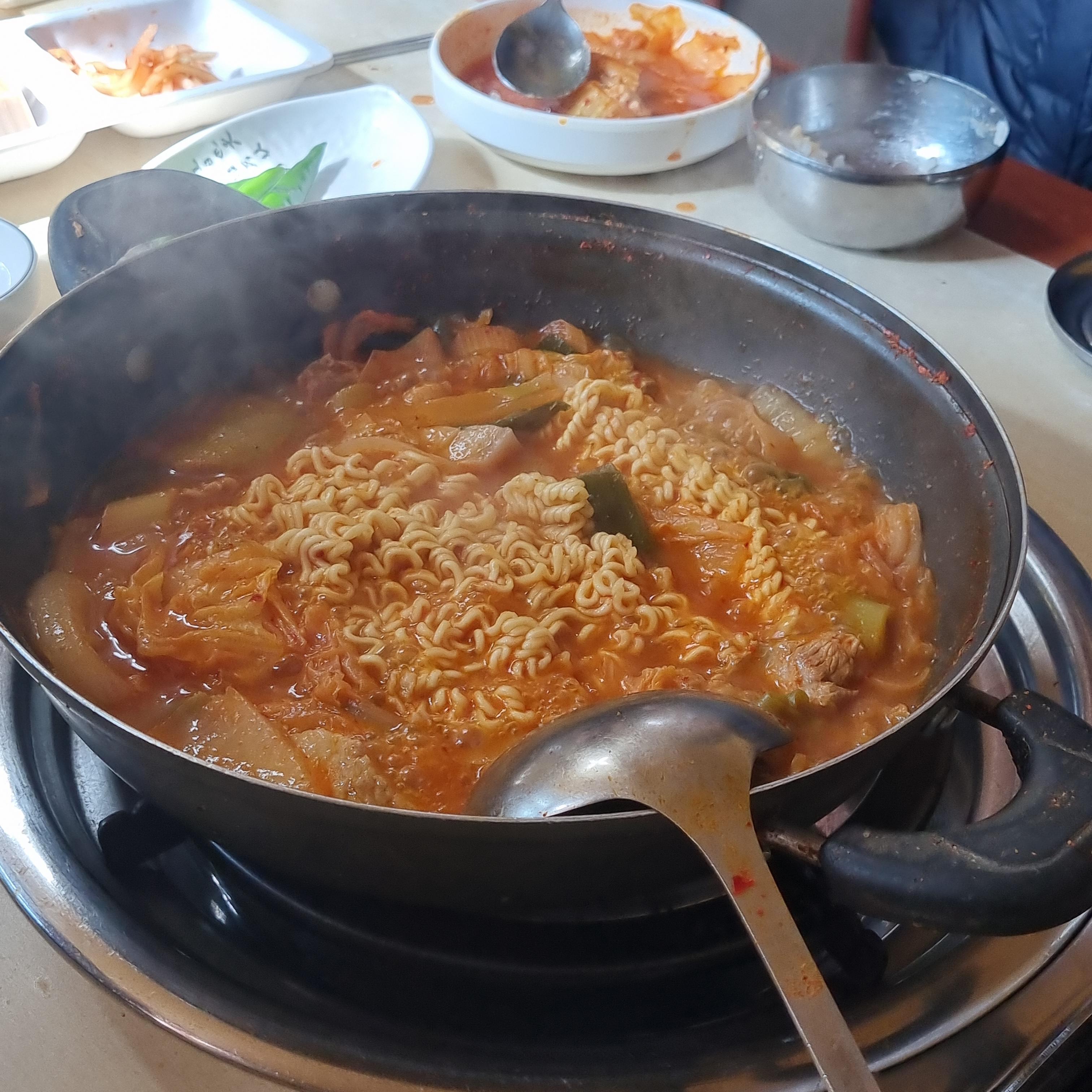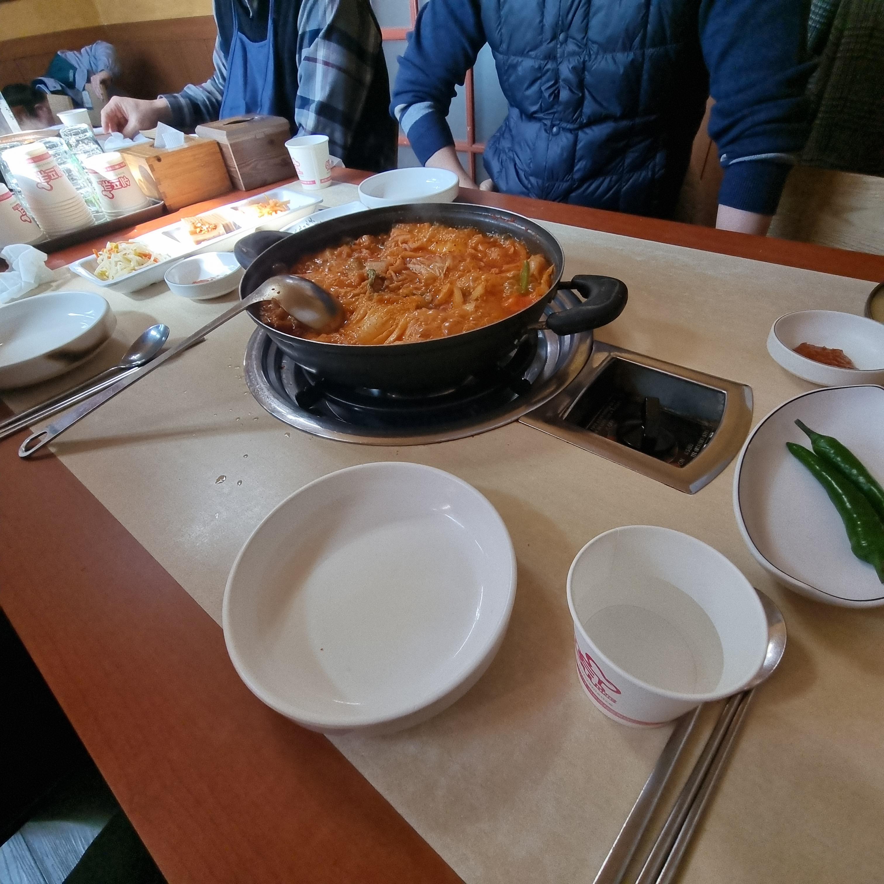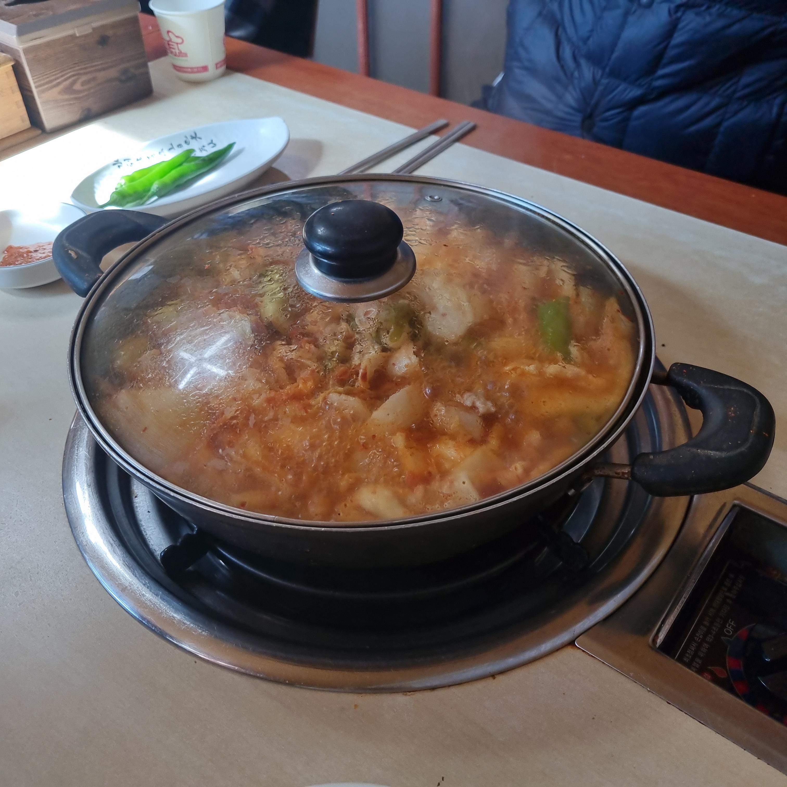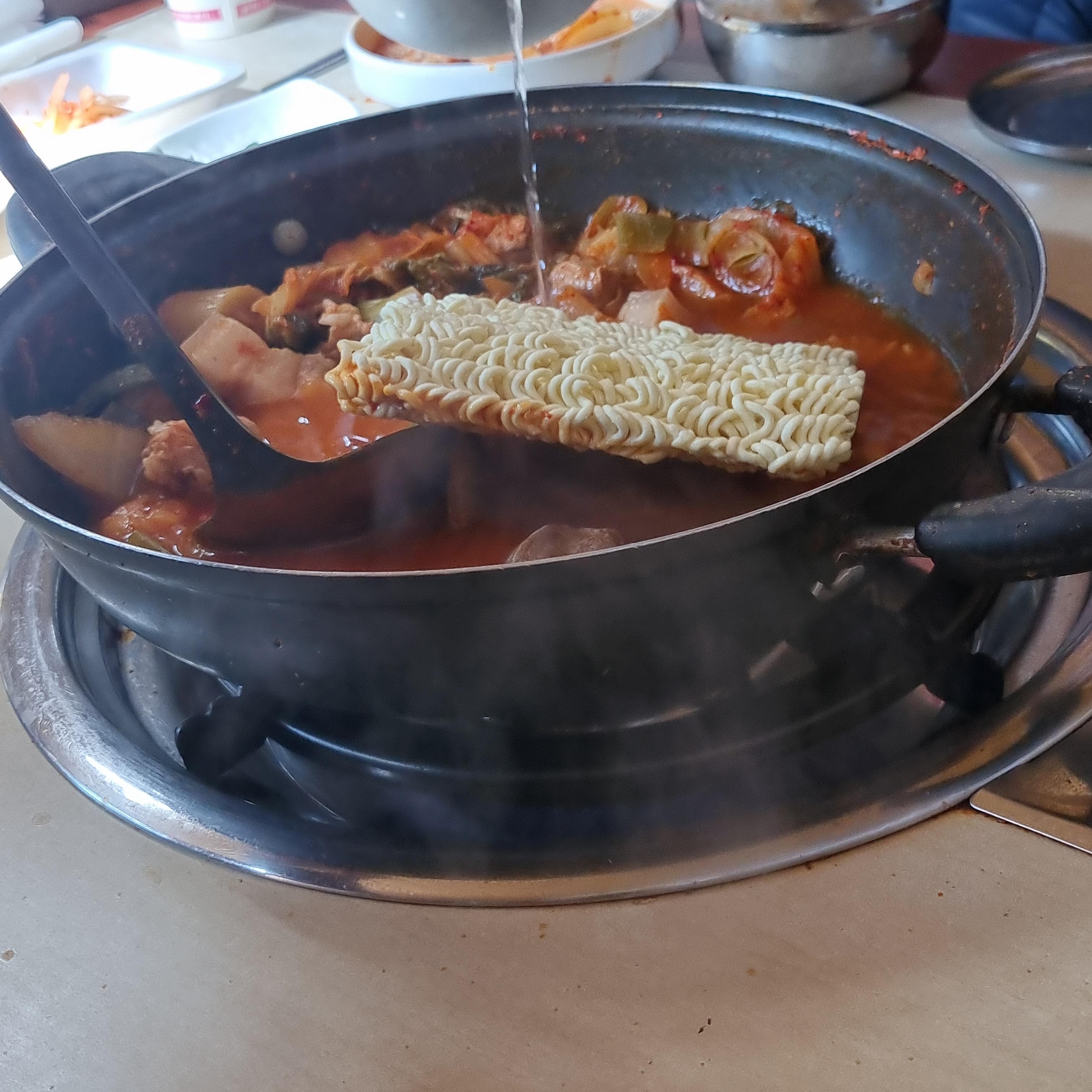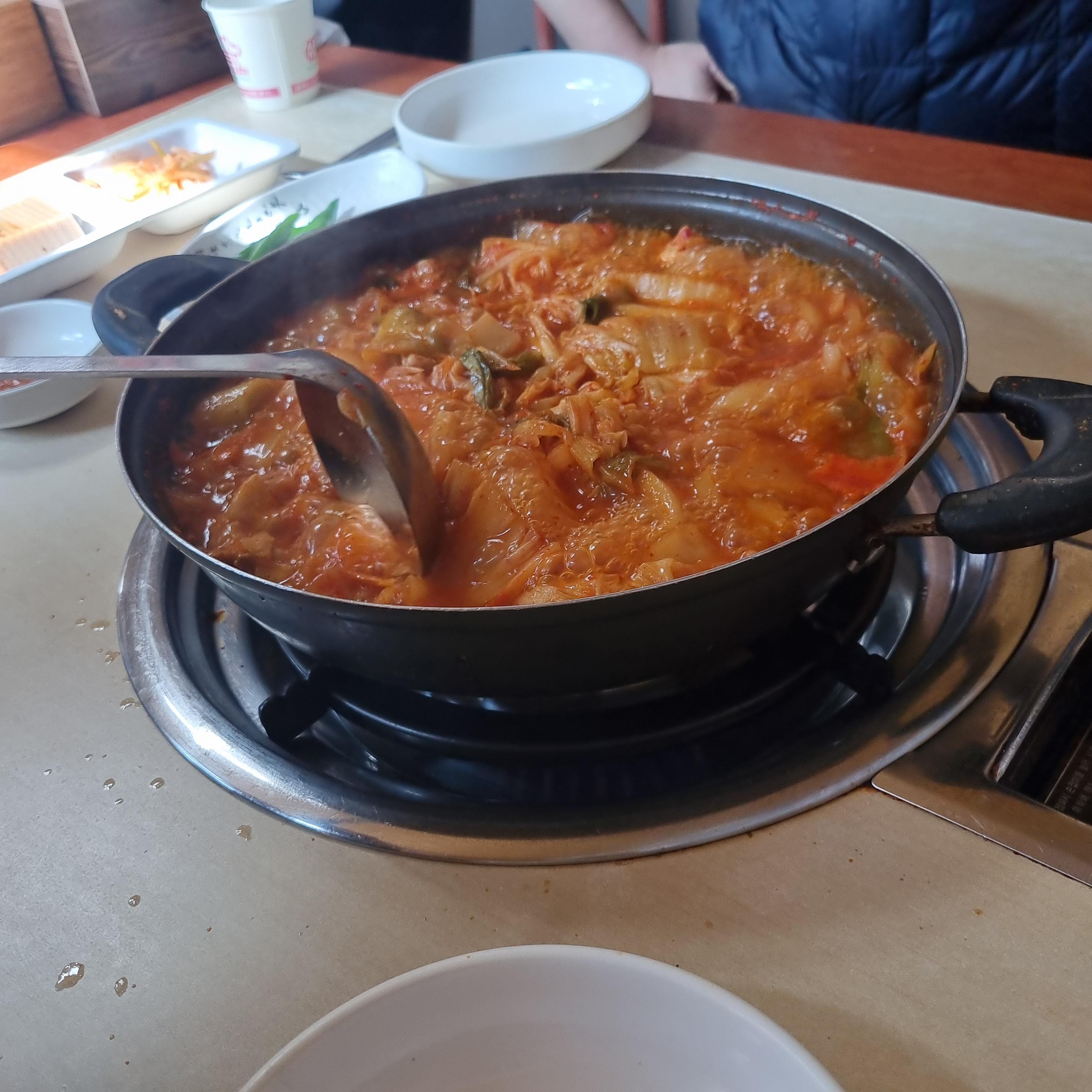 중간에 뚜껑을 열고 국자로 저어주고 있습니다. 김치와 돼지고기는 정말 푸짐하게 들어 있었으며 기다리는 동안 국물맛을 맛을 살짝 보았는데 필자의 입맛에 딱 맞았습니다.