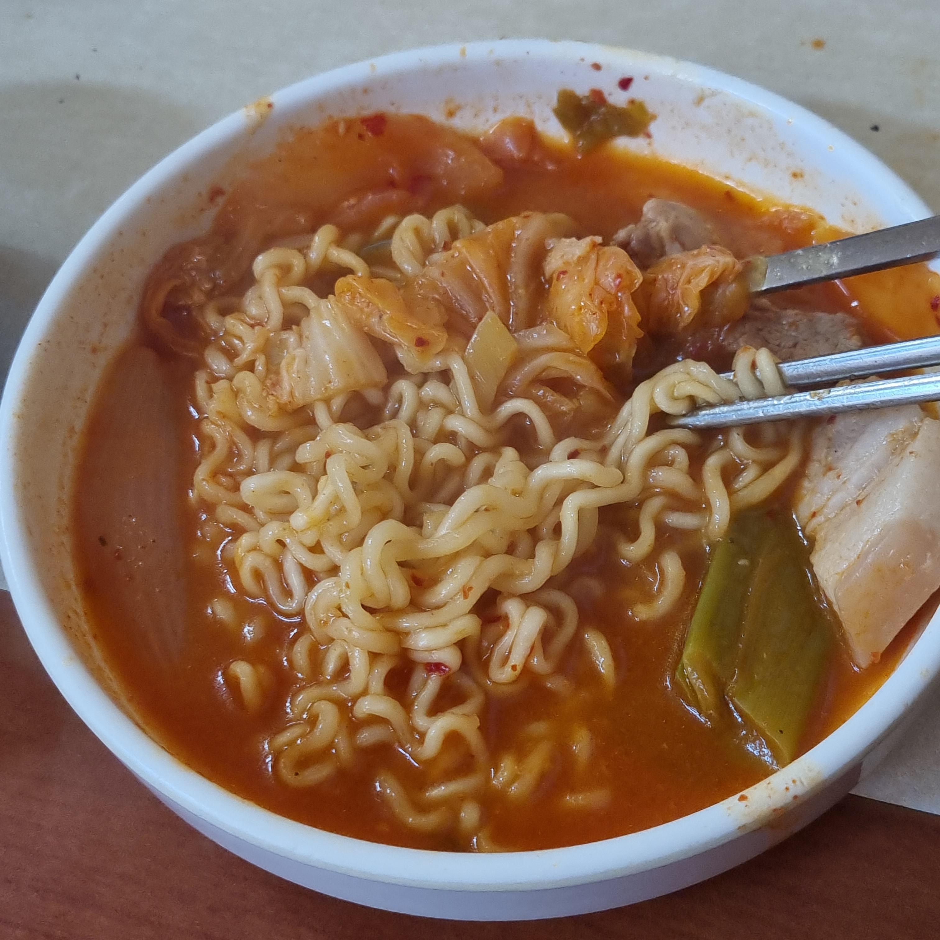 두루치기를 어느 정도 먹은 후 물을 추가하여 다시 끓여주고 라면사리 하나를 넣었습니다. 두루치기 국물이 남아있어 별도의 양념은 추가하지 않아도 진한 라면맛과 국물맛을 느낄 수 있습니다.