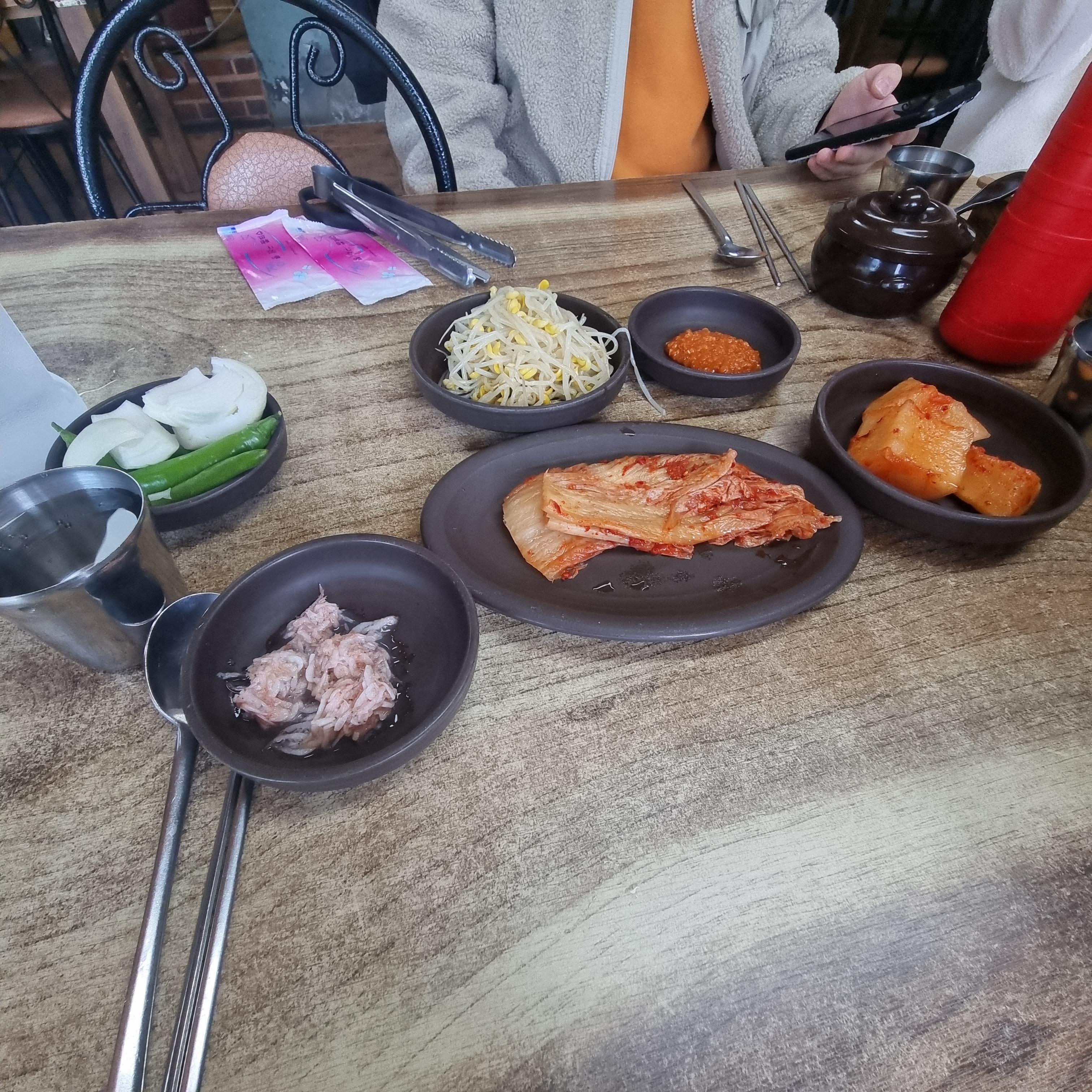 기본반찬이 나오는데 깍두기가 큼직하게 나오고 배추김치도 길게 나와 손님들이 직접 가위를 들고 원하는 만큼 잘라 드시면 돕니다.
