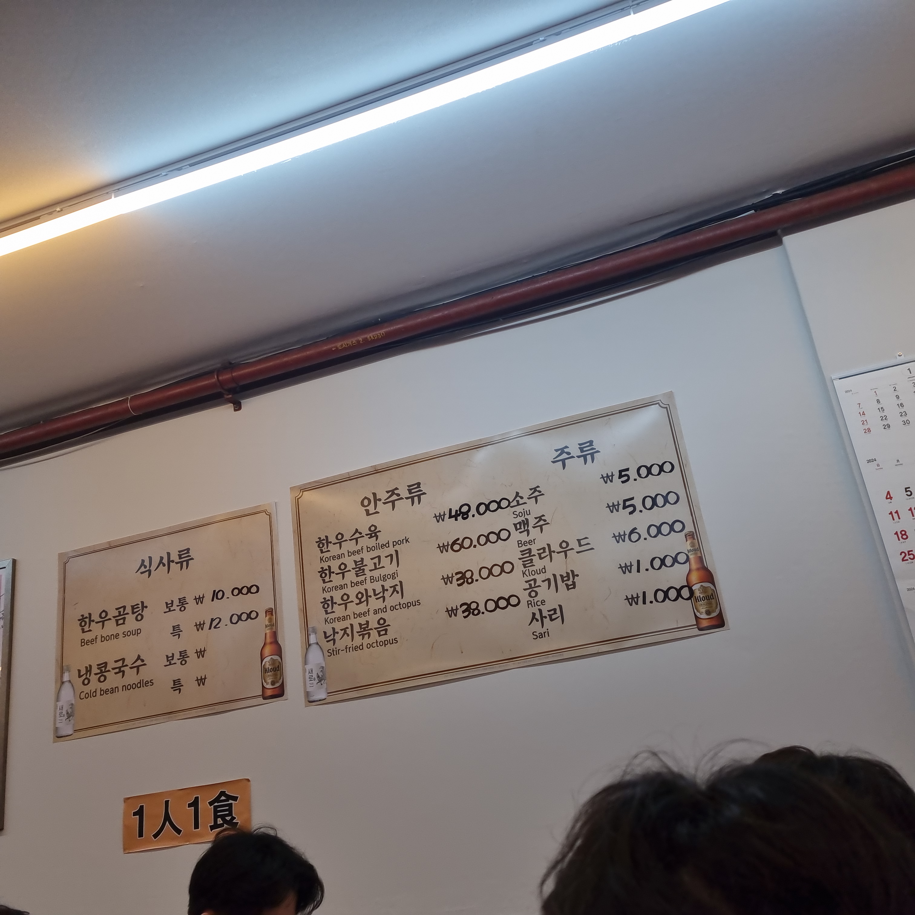 식사류 매뉴는 딱 한가지입니다. 냉콩국수가 있지만 아마도 계절메뉴 같습니다. 이외에 안주류가 있는데 한우수육과 불고기 한우와 낙지볶음등이 있습니다.
