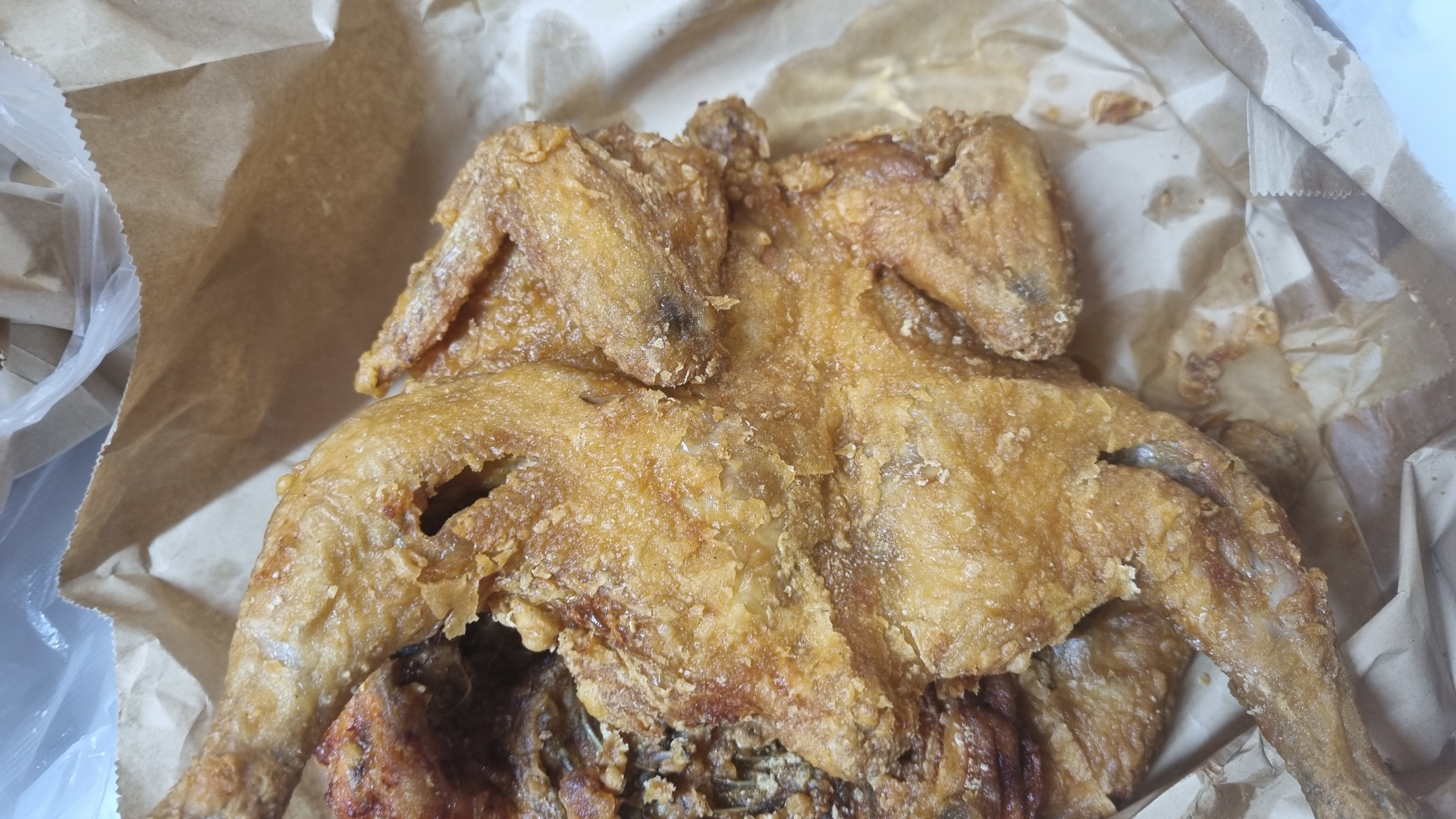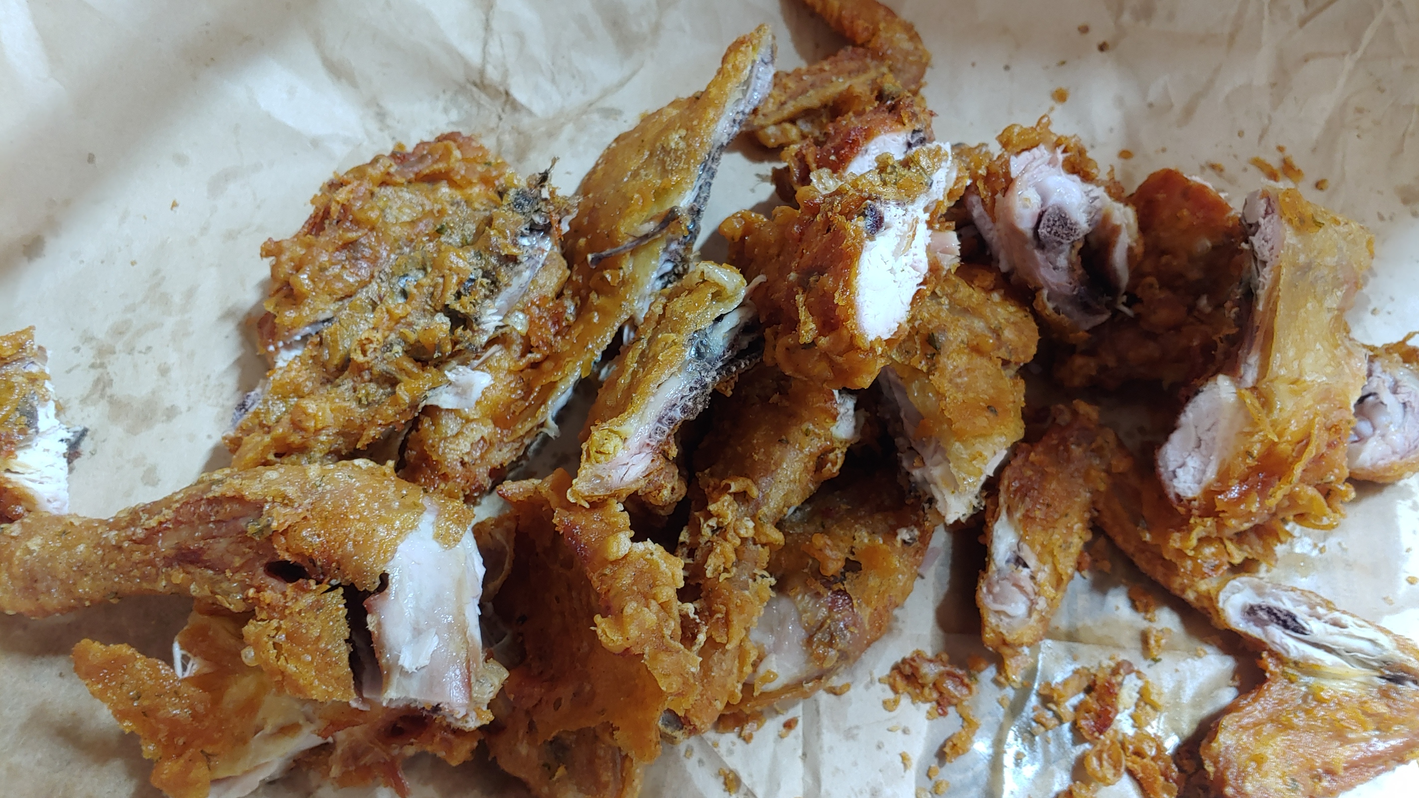 이것이 가마치통닭입니다. 조각이 아닌 닭이 한 마리 원형을 유지하면서 그대로 튀겨져 있으며 후라이드이지만 기본적인 양념 간은 되어서 튀겨집니다.