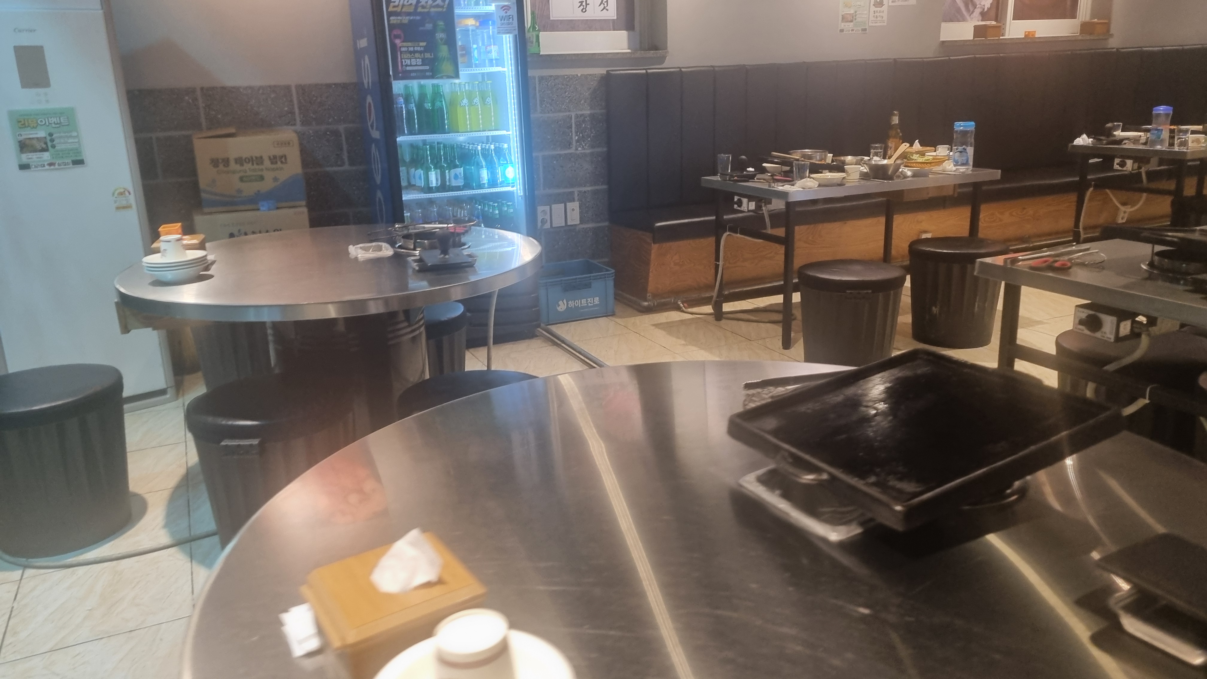 내부는 모두 입식 테이블로 되어 있으며 원탁 테이블이 많으며 일부 벽쪽으로 네모 테이블이 있어 단체로 회식도 가능합니다.