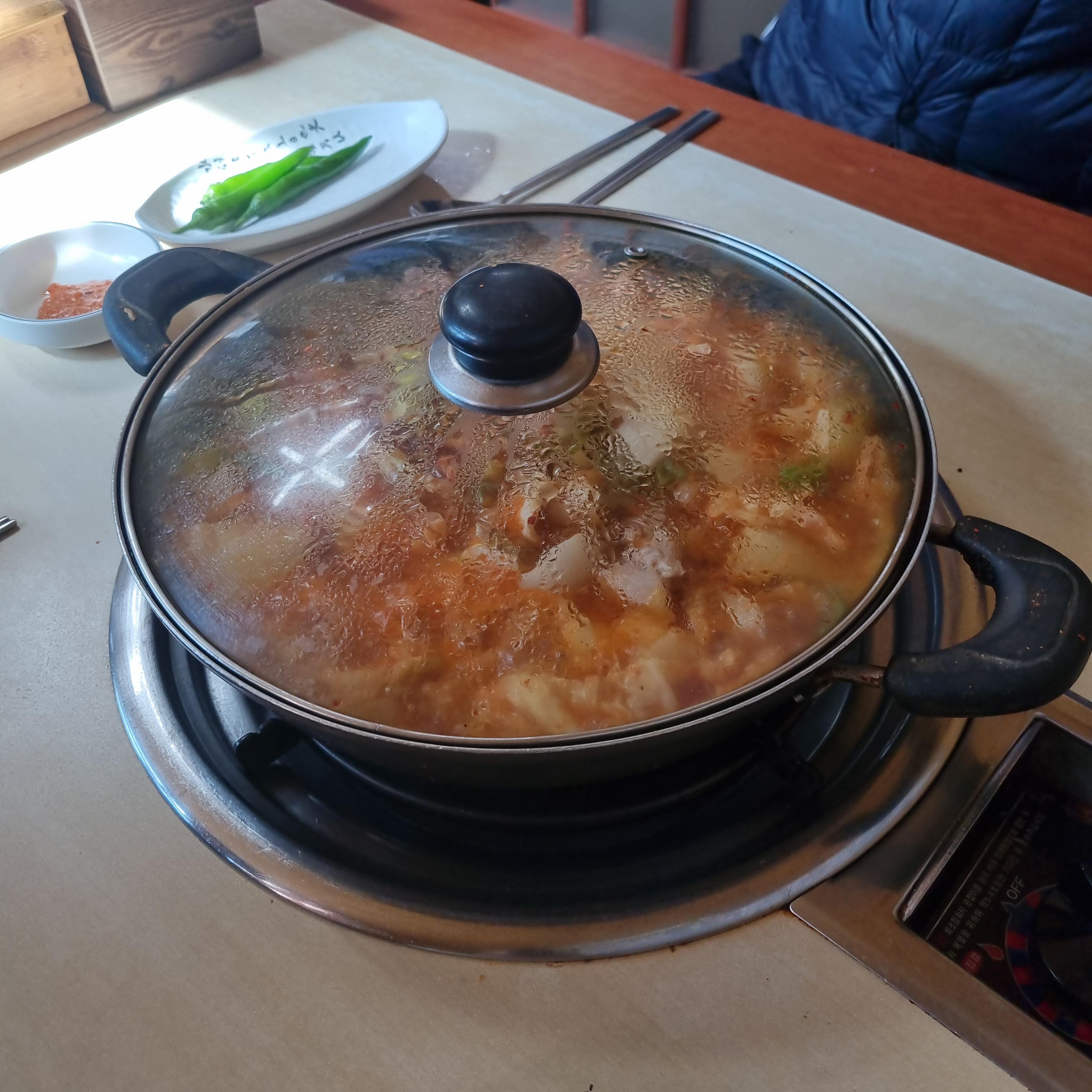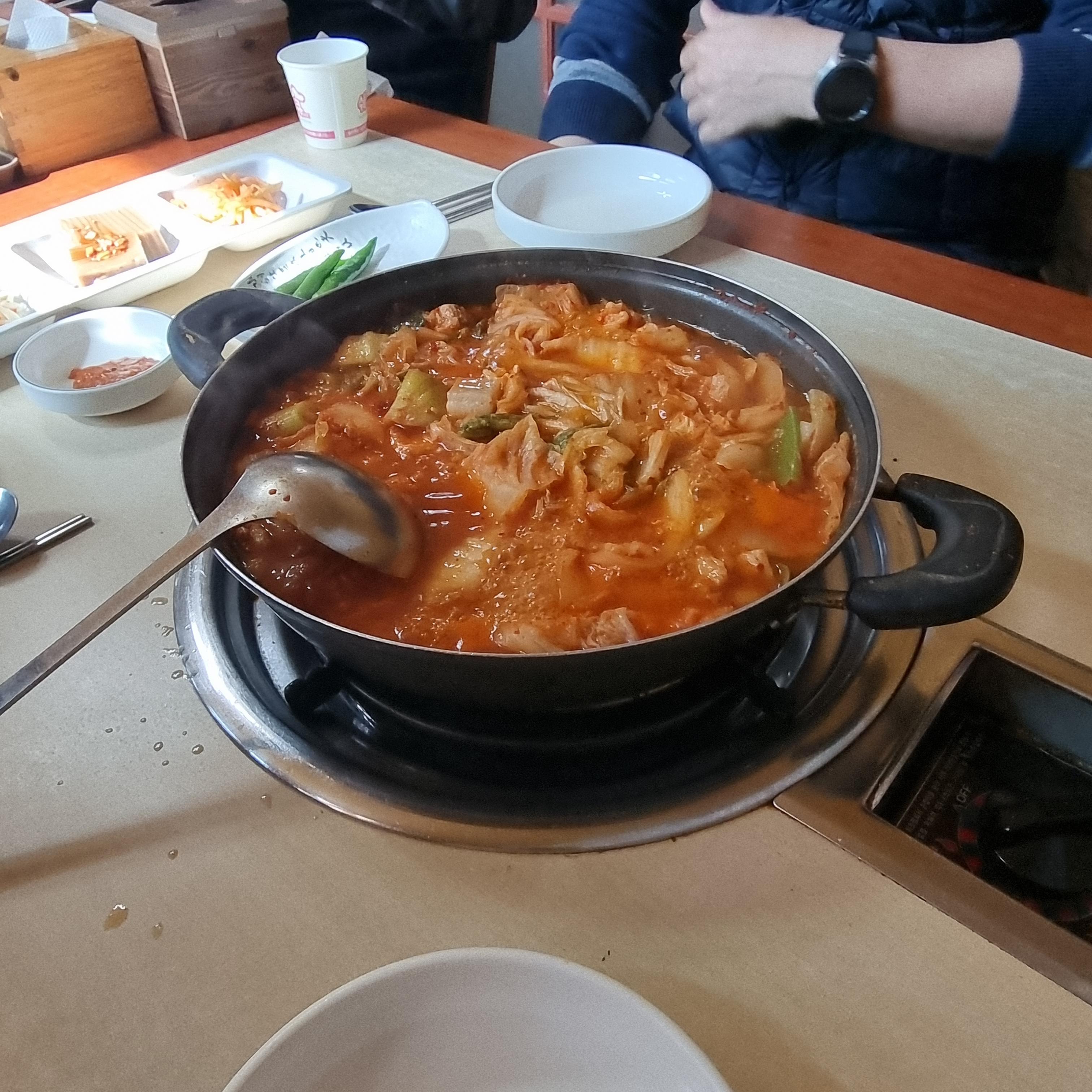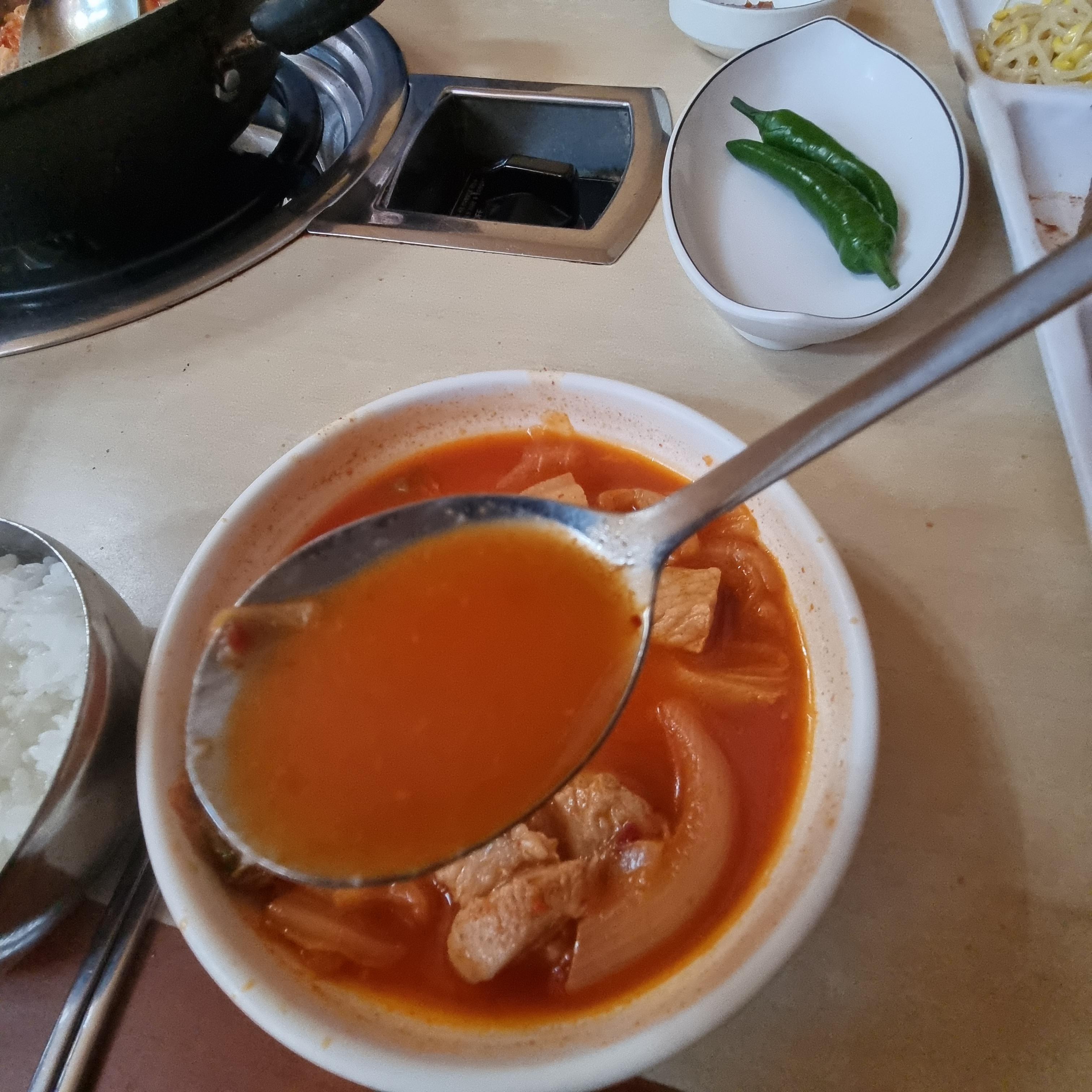이곳은 김치찌개 형식으로 만들어 나오는데 국물이 있는데 다만 김치찌개보다 국물이 더 진하고 돼지고기 많이 들어 있다는 것입니다.