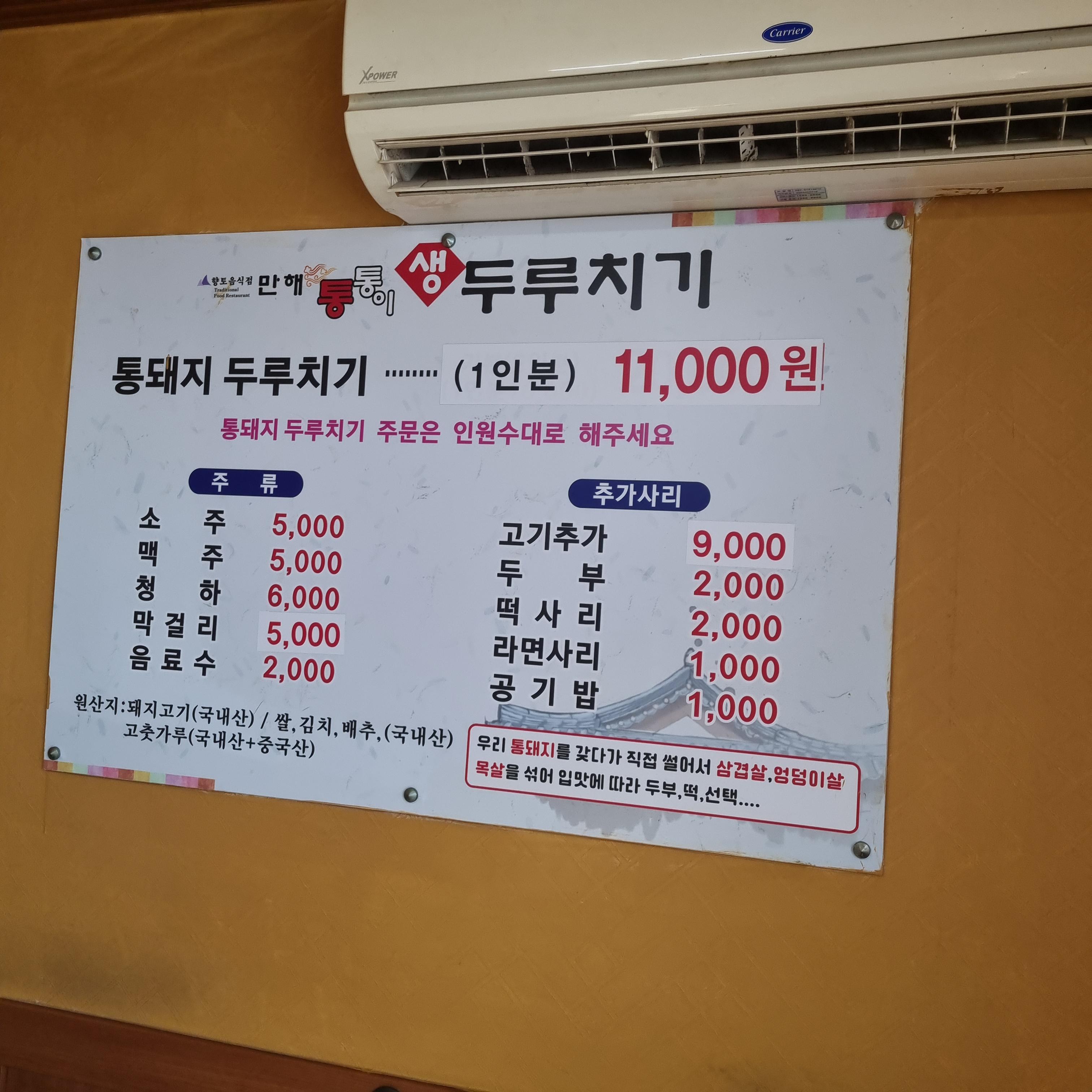 이곳의 메뉴은 딱 한 가지 통돼지 두루치기입니다. 1인분에 11,000원이며 가능한 인원수에 맞게 주문을 요청하고 있으며 그 외 다른 메뉴는 없습니다.