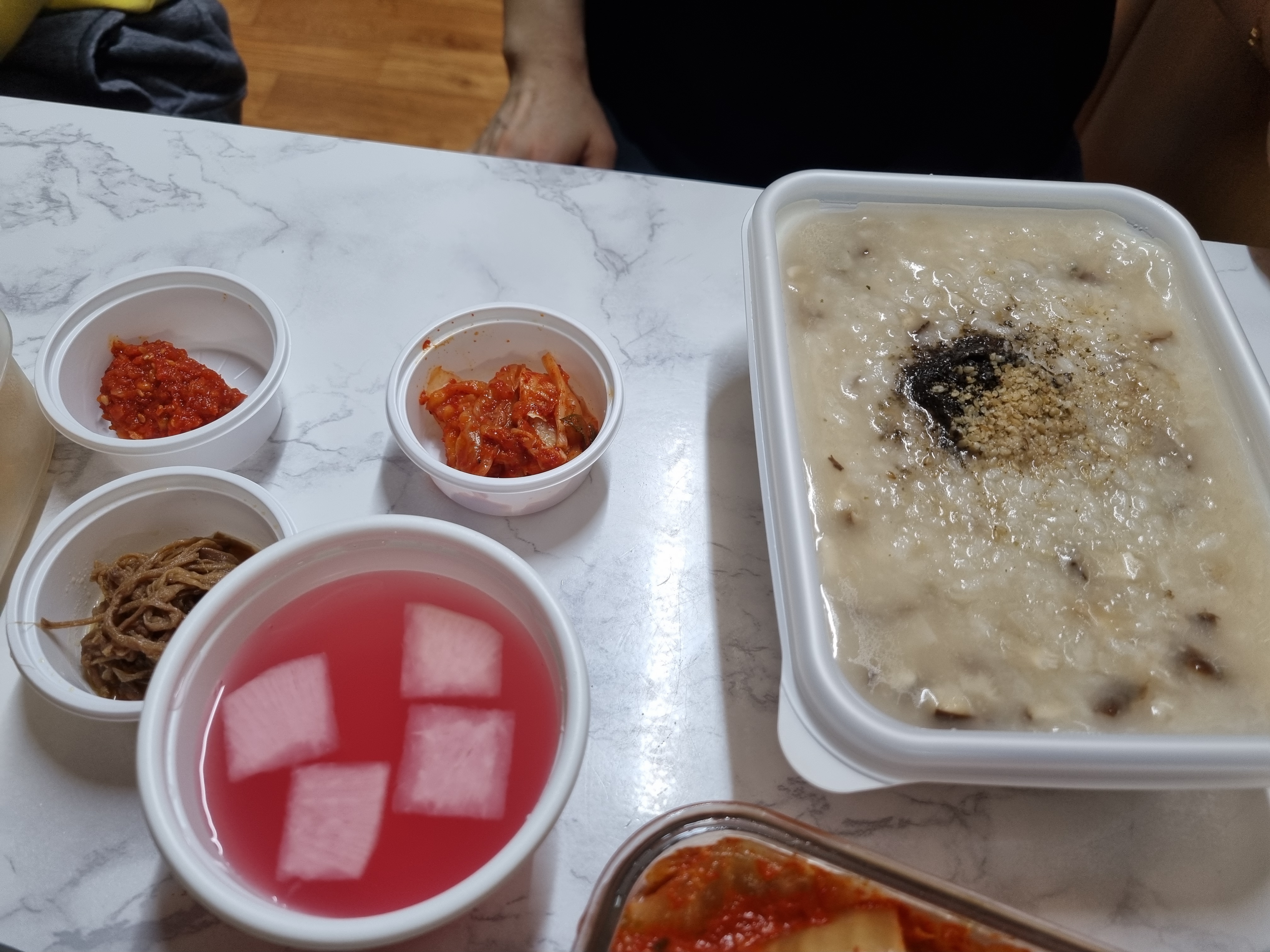 반찬은 김치와 장조림 동치미와 기타 양념으로 구성되어 죽을 한 그릇 먹는 데는 충분한 양으로 되어 있습니다.