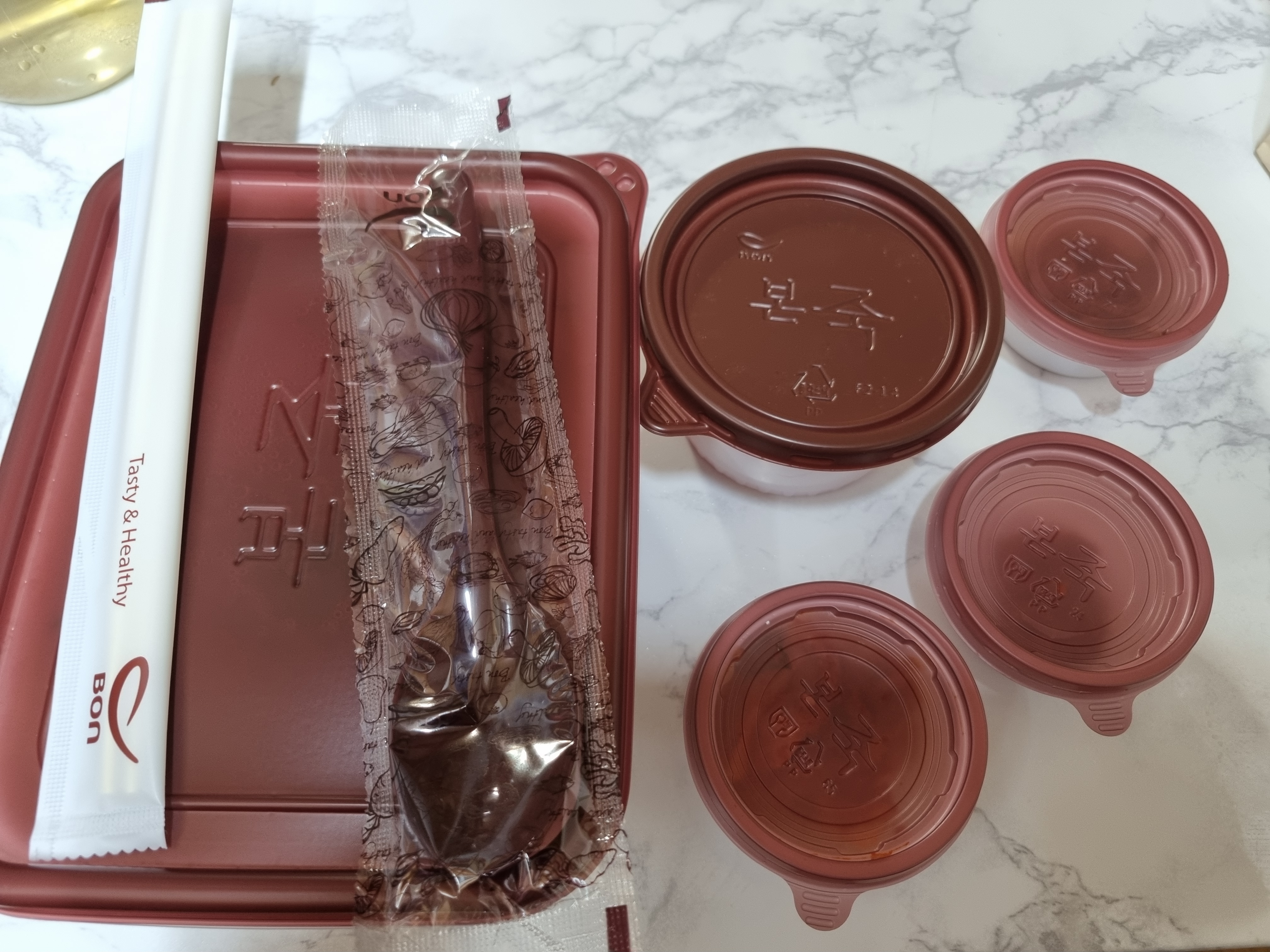 구성은 이렇게 되어 있습니다. 죽 한그릇과 반찬 4가지로 구성되어 있으며 수저와 젓가락으로 되어 있었습니다.
